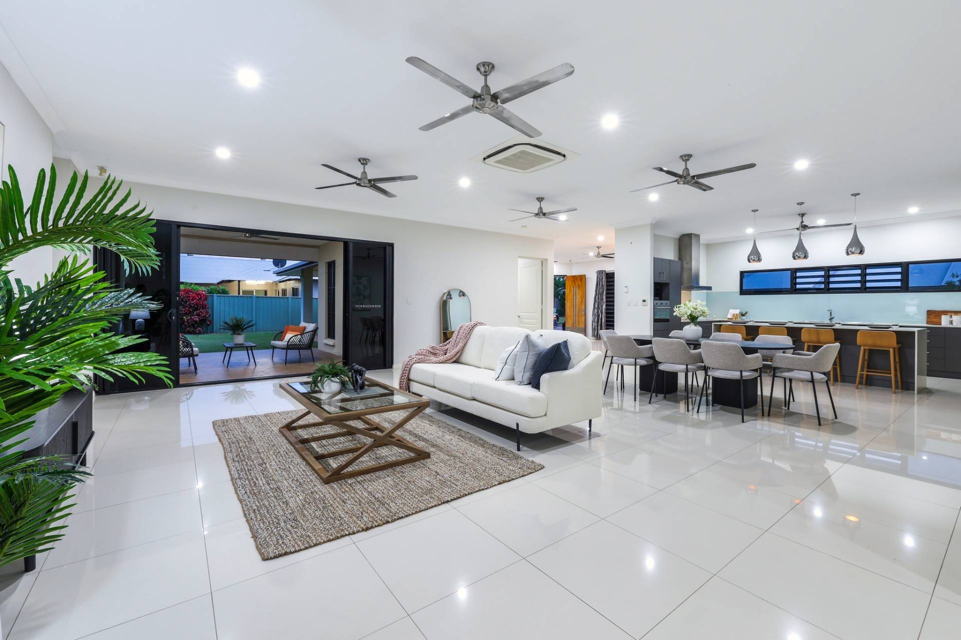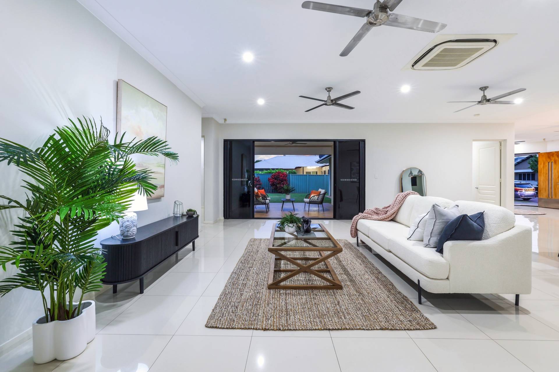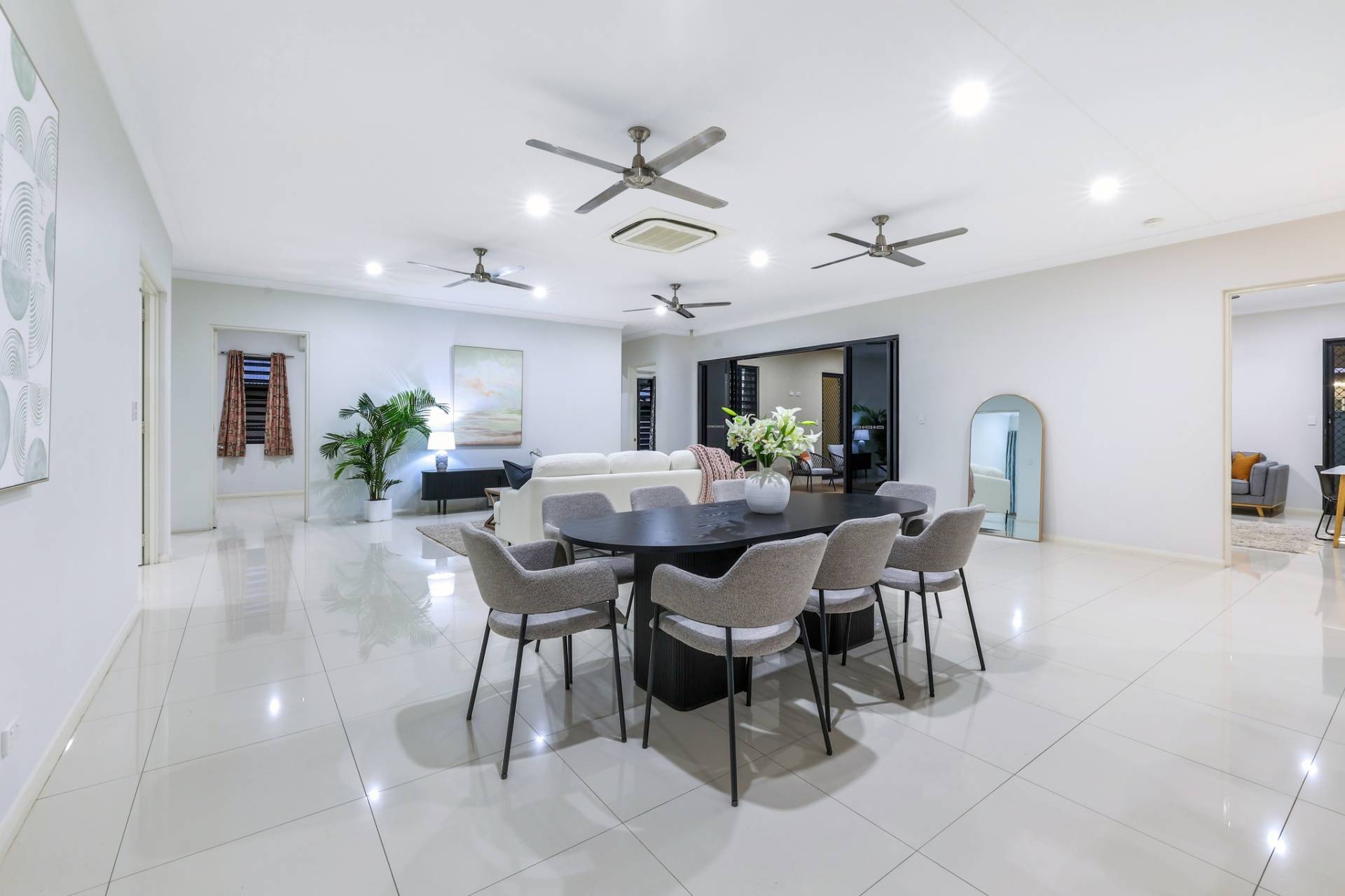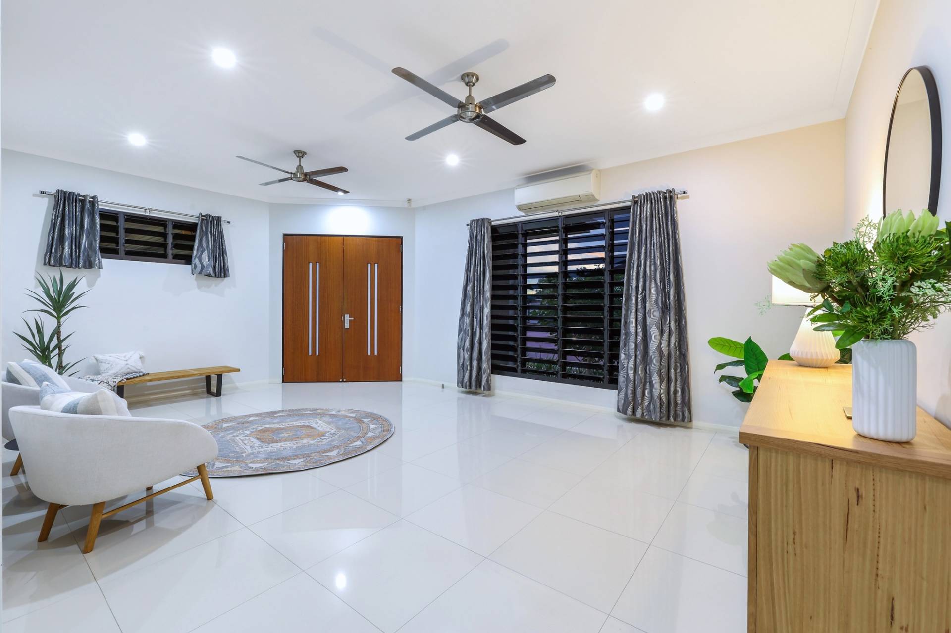 Double opening doors reveal the first of two living areas with glossy tiled flooring underfoot and bays of windows framing the tropical gardens outside. Further into the home is a sizeable open plan dining room and secondary living space with dual opening sliding doors showcasing the outdoor entertaining areas. Furthermore there is a large media room that could be a home office or 5th bedroom option if you prefer.