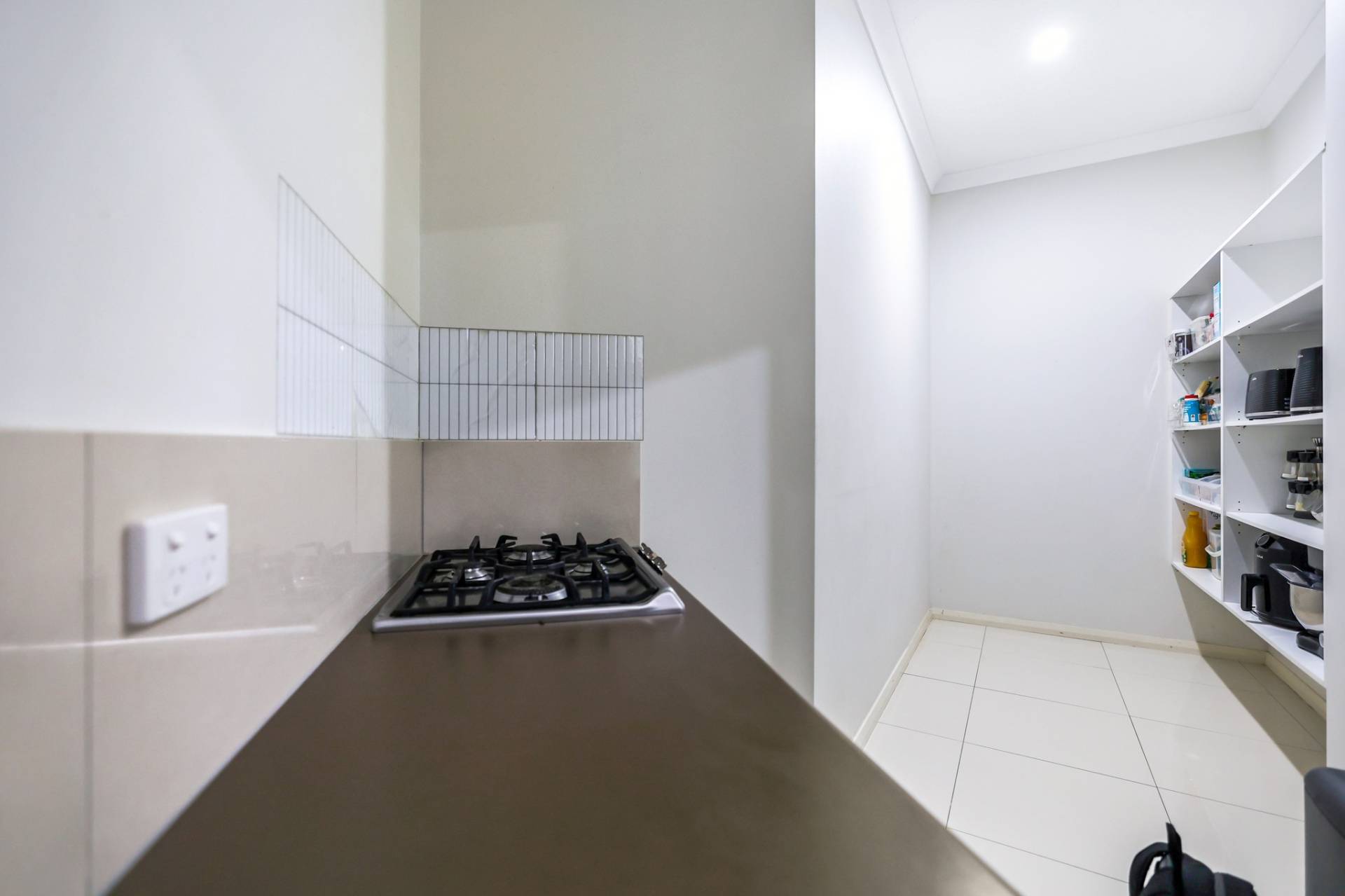 The kitchen is a chefs dream with a stone topped island bench and breakfast bar along with a walk in pantry with a gas cooktop and a long row of shelving options. There is of course mounted SS appliances, feature pendant lighting and a pantry all finished in modern tones with a glass splash back as well.