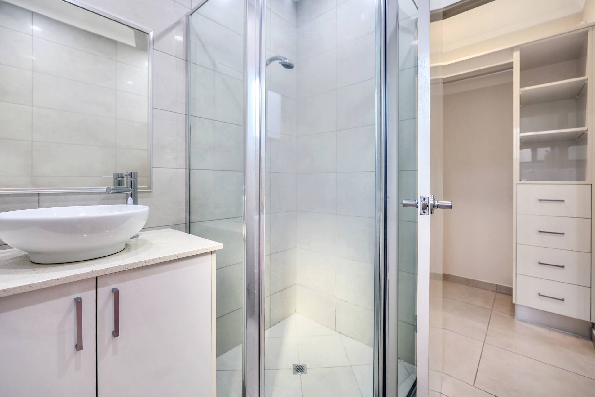 Upstairs the home has a fresh decked balcony that overlooks the pool and leafy streetscape below. Inside is a light filled open plan living, dining and kitchen space with tiled flooring underfoot and feature pendant lighting over the stone topped island breakfast bar in the kitchen. From the living room there is a sliding door through to a secondary outdoor entertaining area. Three bedrooms are tucked down the hallway for total privacy from the living areas and two include a built in robe and A/C while the master is enhanced with a walk in robe and ensuite bathroom.