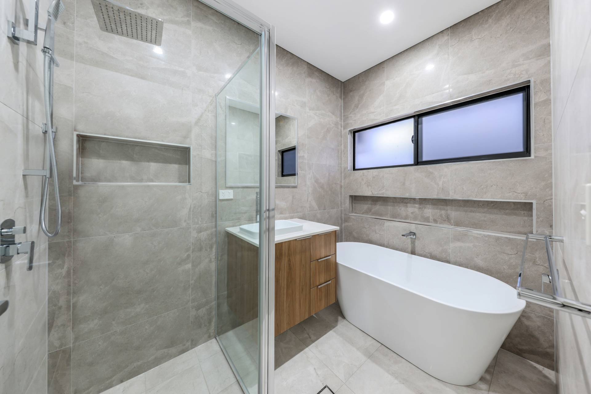 The master bedroom suite includes an ensuite bathroom and walk in robes hidden behind sliding doors. Three additional bedrooms reside at the rear of the home, each with a built-in robe and garden views. The main bathroom is gorgeous with a free standing bathtub plus a central floating vanity and large shower with a sep W/C.