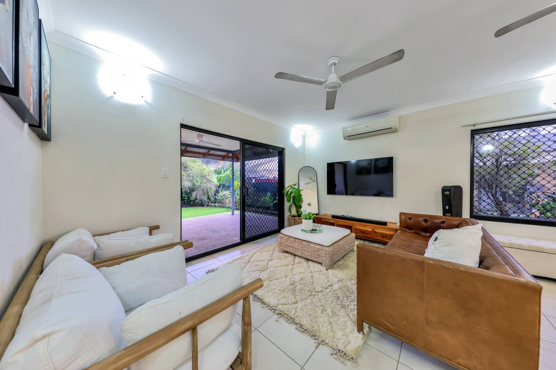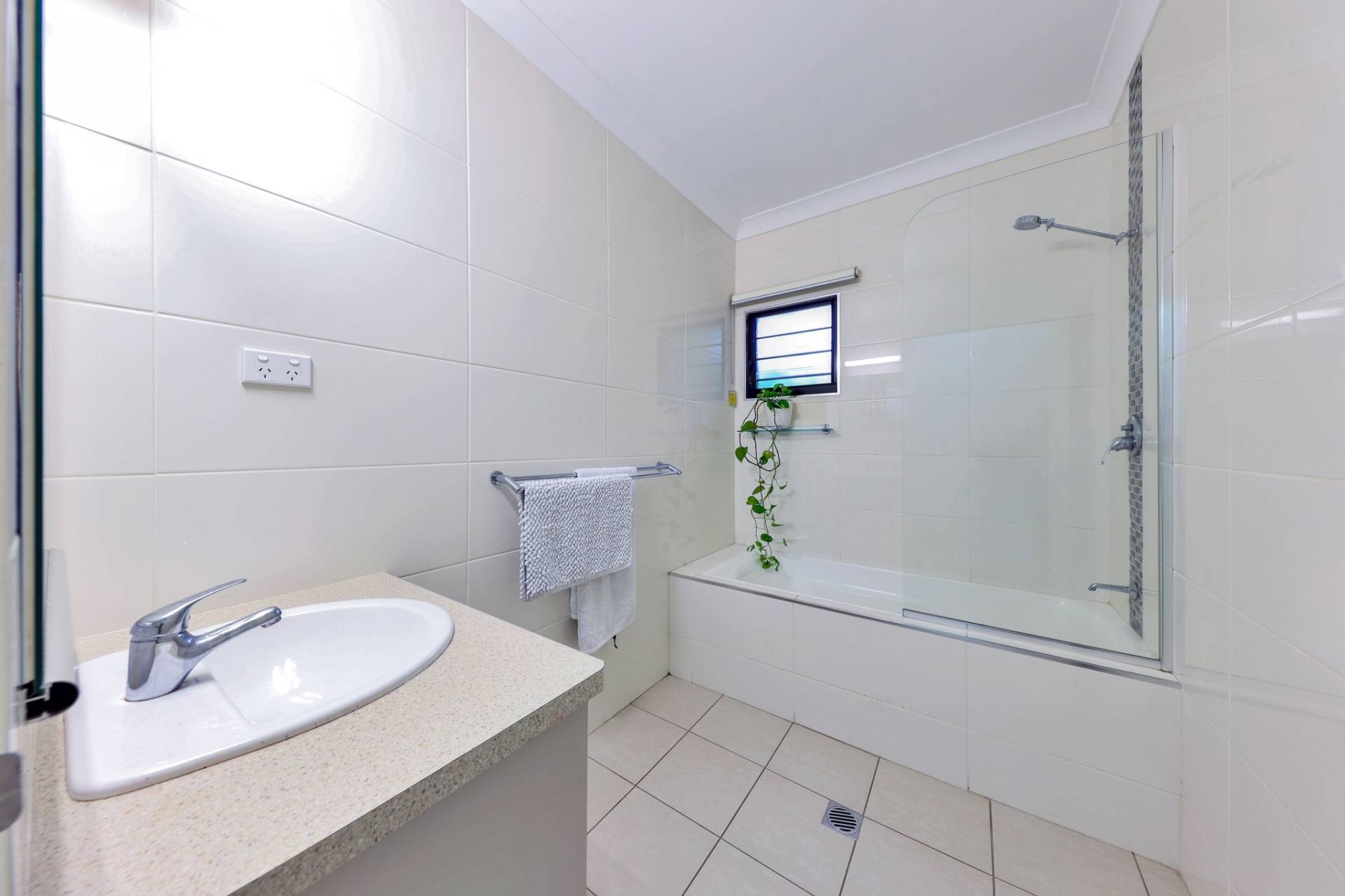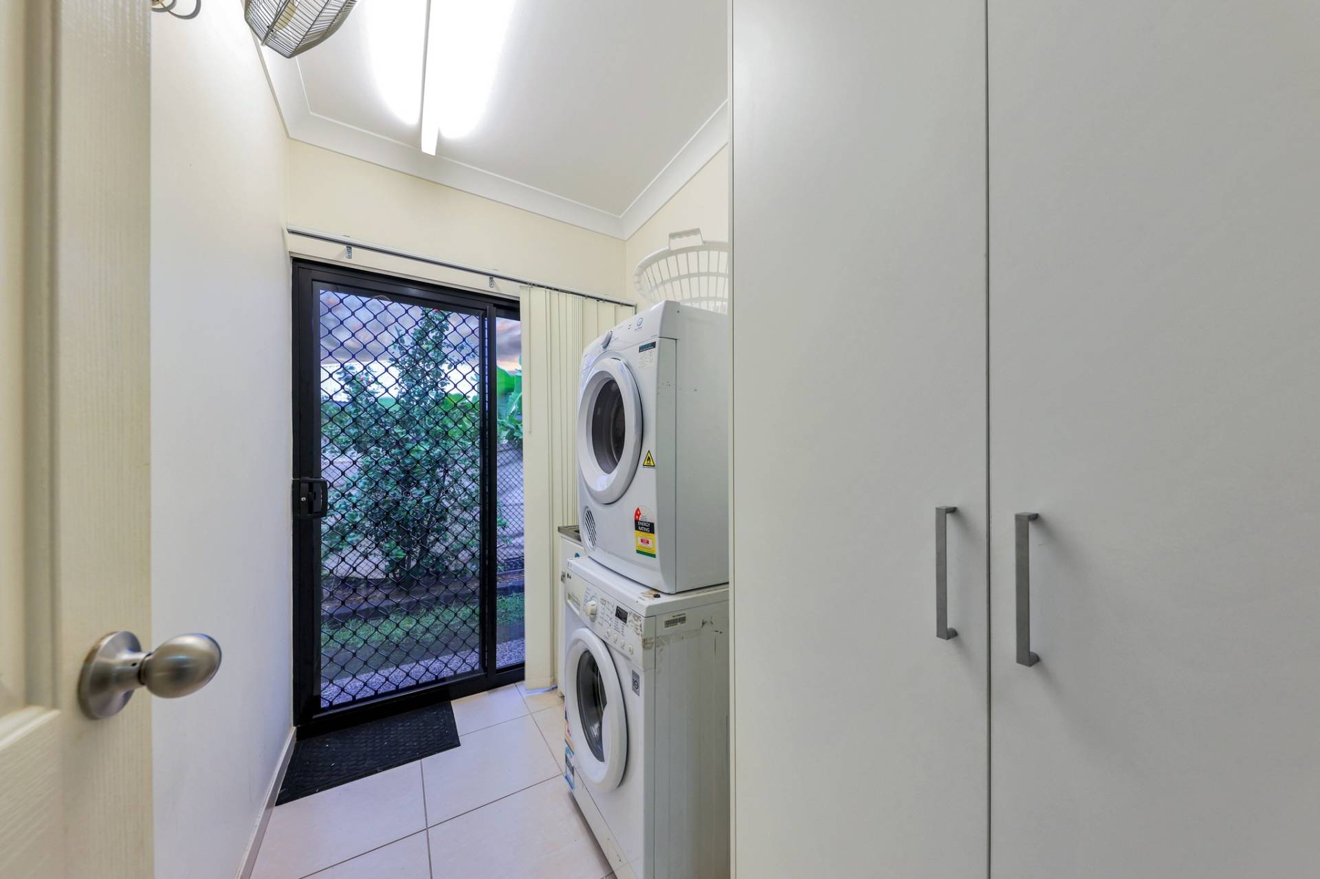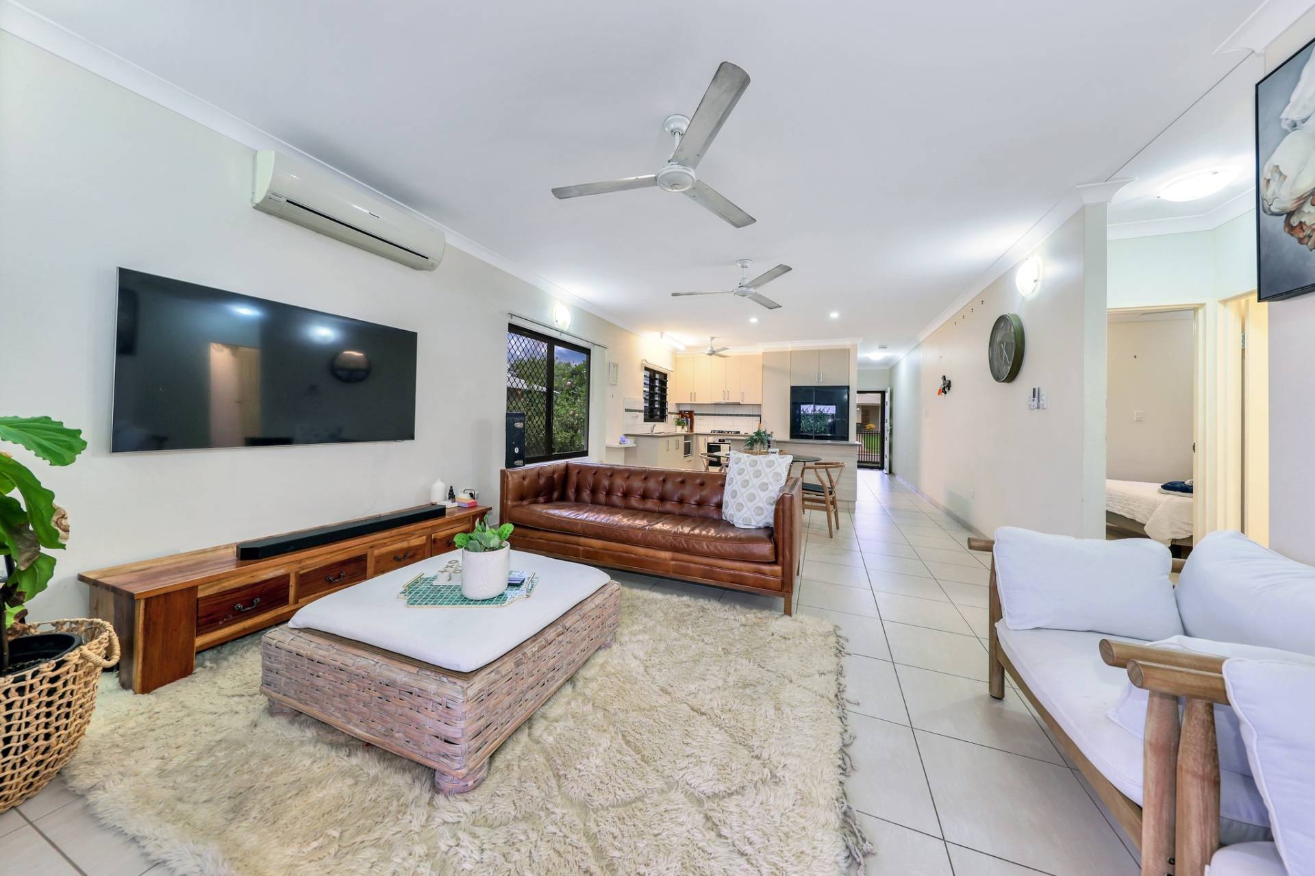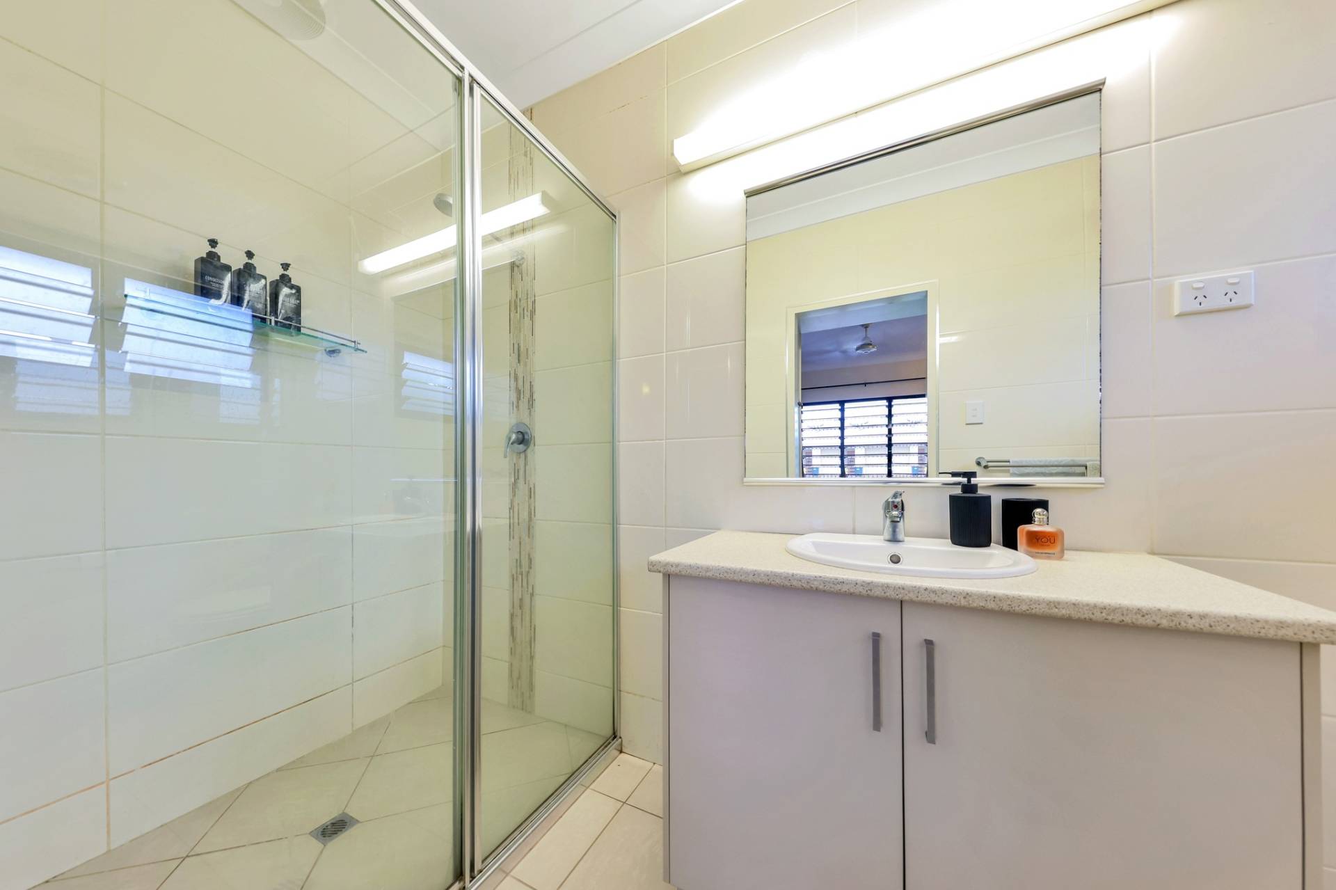 Further into the home it opens up into a generous open plan living, dining and kitchen area with tiled flooring underfoot and A/C throughout along with large windows framing the established tropical gardens that wrap around this entire property. The kitchen has an island bench along with overhead storage space and a pantry as well. From the living room there is a sliding door through to the verandah which in turn overlooks the tropical gardens and green lawns where the kids and pets can play. Around the back of the property is a garden shed with an elevated walk way that will keep your feet and the floor of the shed clean.