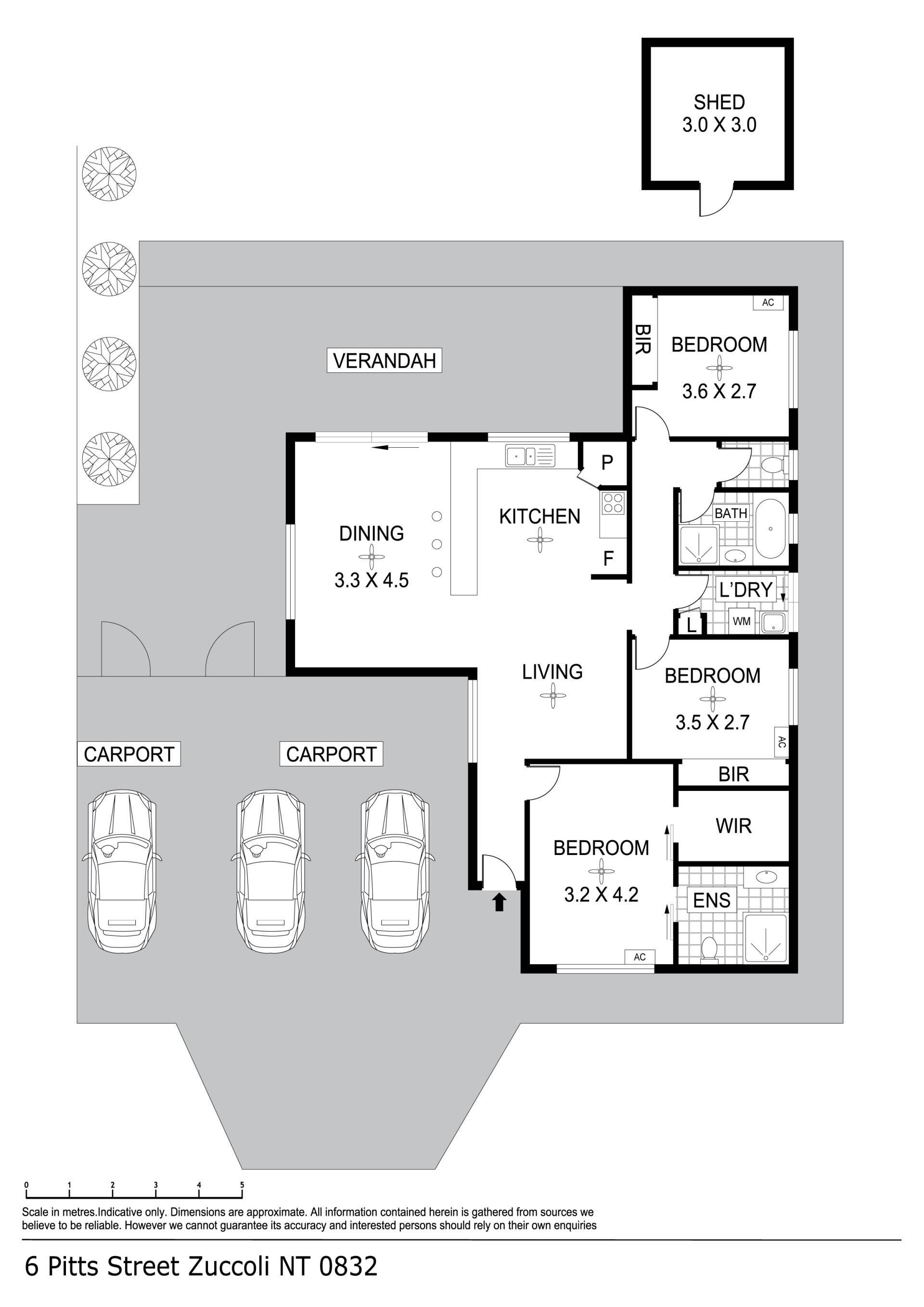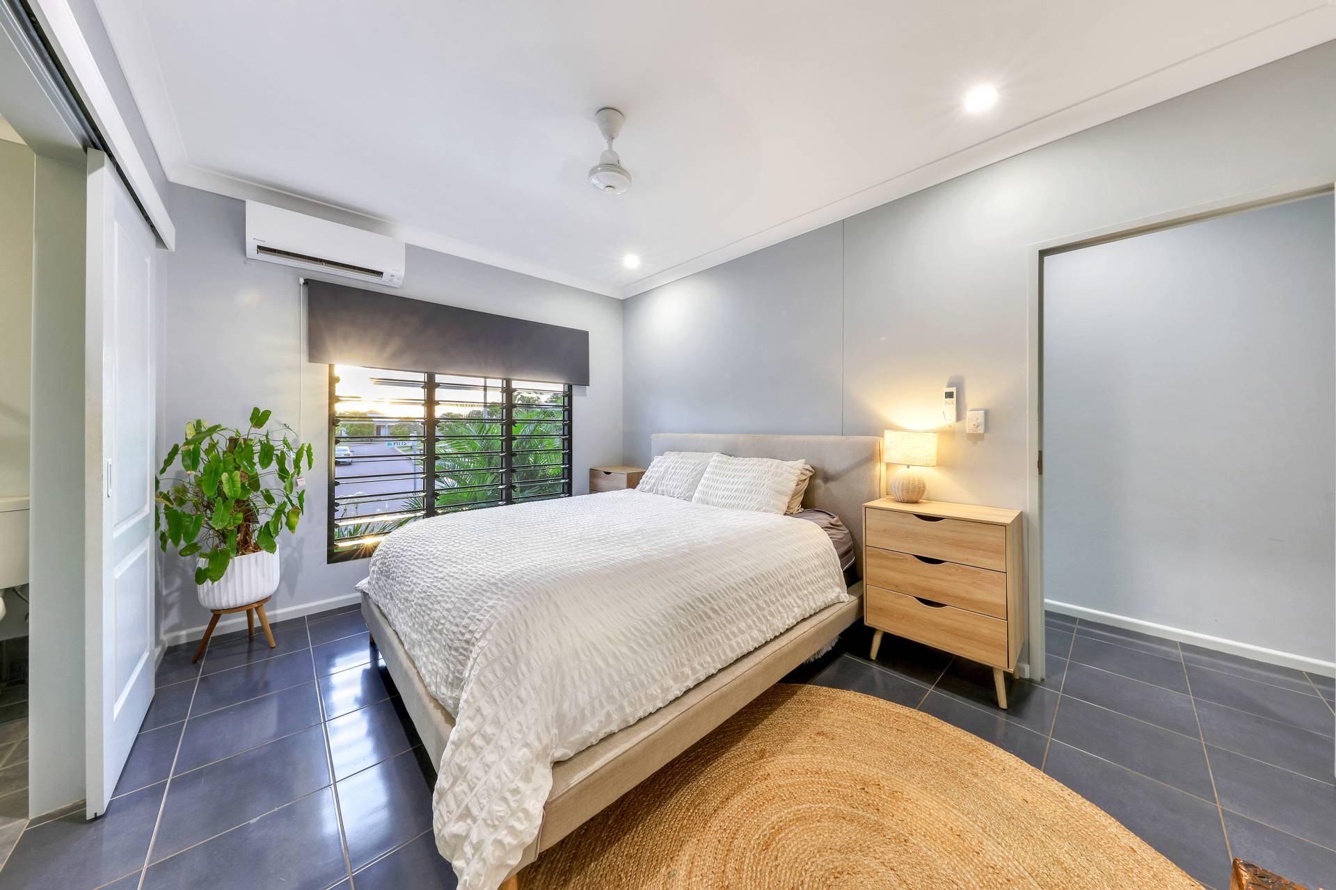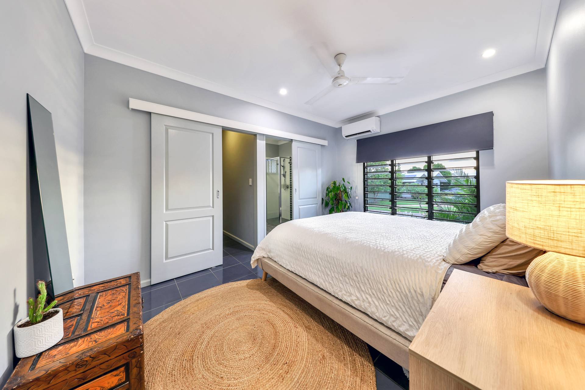 The master bedroom is front facing with streetscape views framed in the louvered window bays. This room includes an ensuite bathroom and a walk in robe as well. Bedrooms 2 and 3 are sheltered and cool with pull down blinds, A/C and robes.