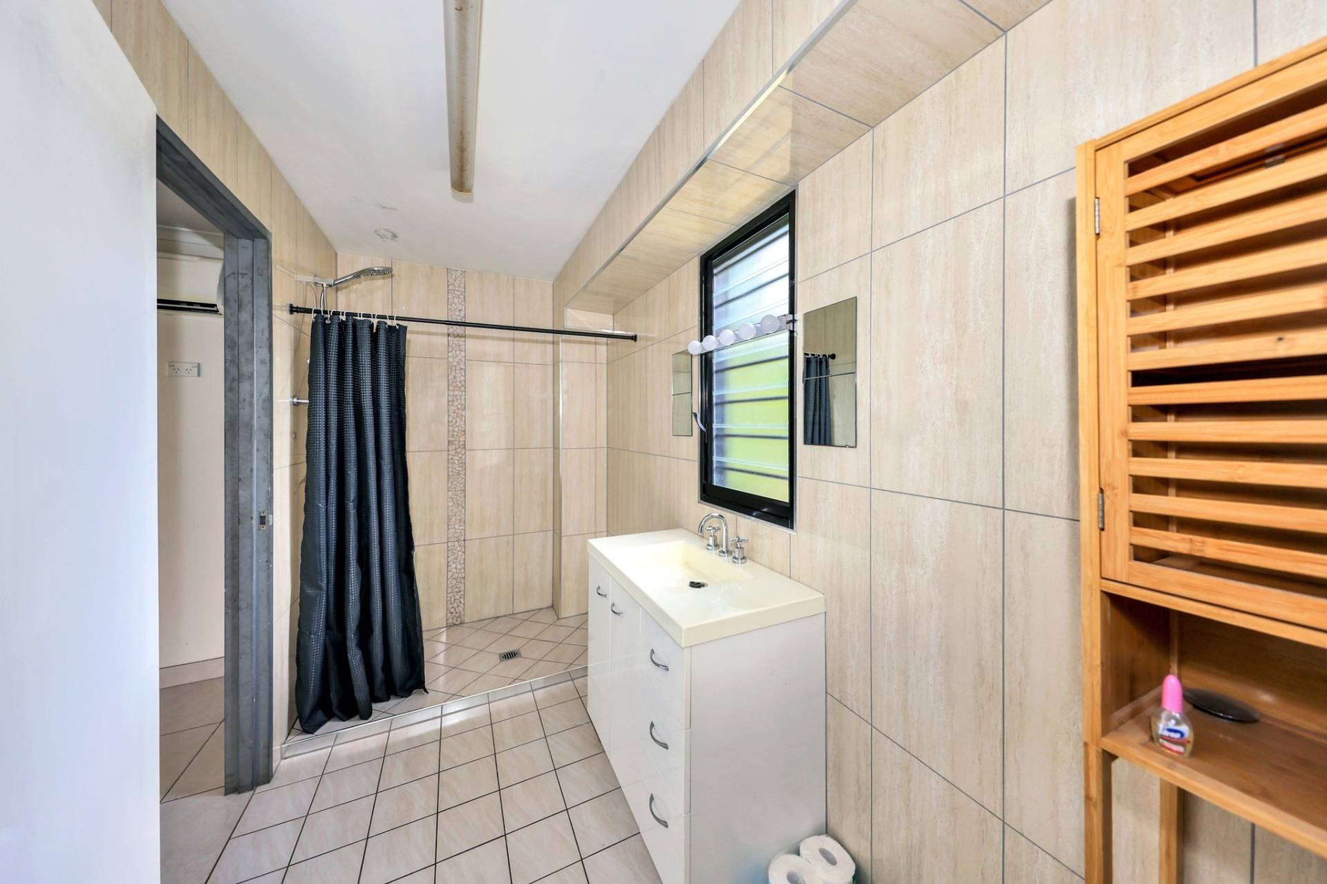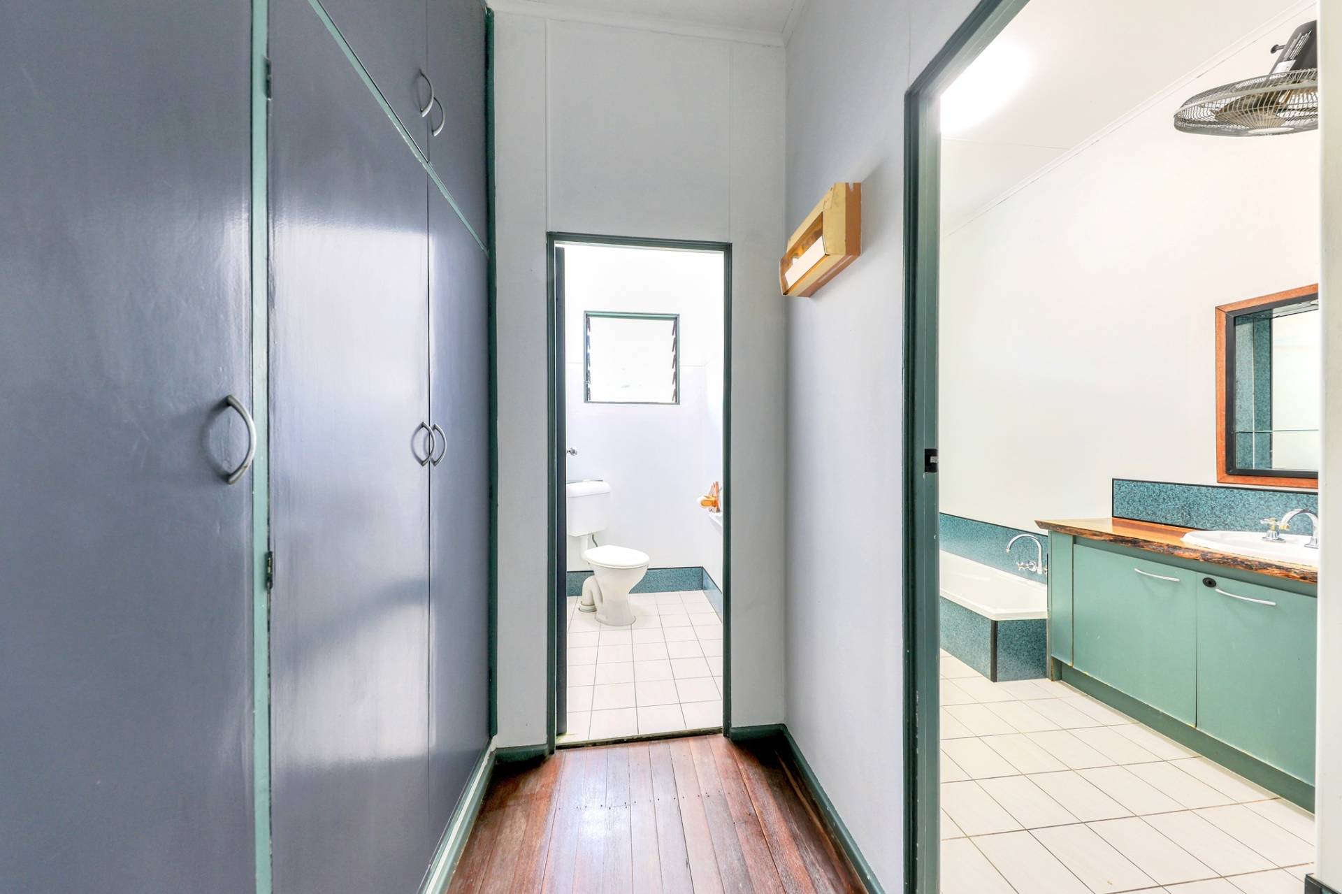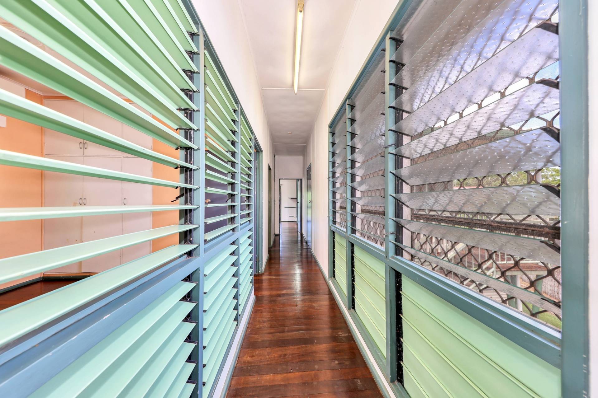 Down the hallway there are three bedrooms each with endless banks of louvered windows and cool breezes that whip through. Each bedroom has hard wood flooring and a built in rob along with A/C and a unique colour choice as well. The bathroom upstairs has a bath tub and shower along with built in storage and sep toilet plus a hallway closet for the linens.