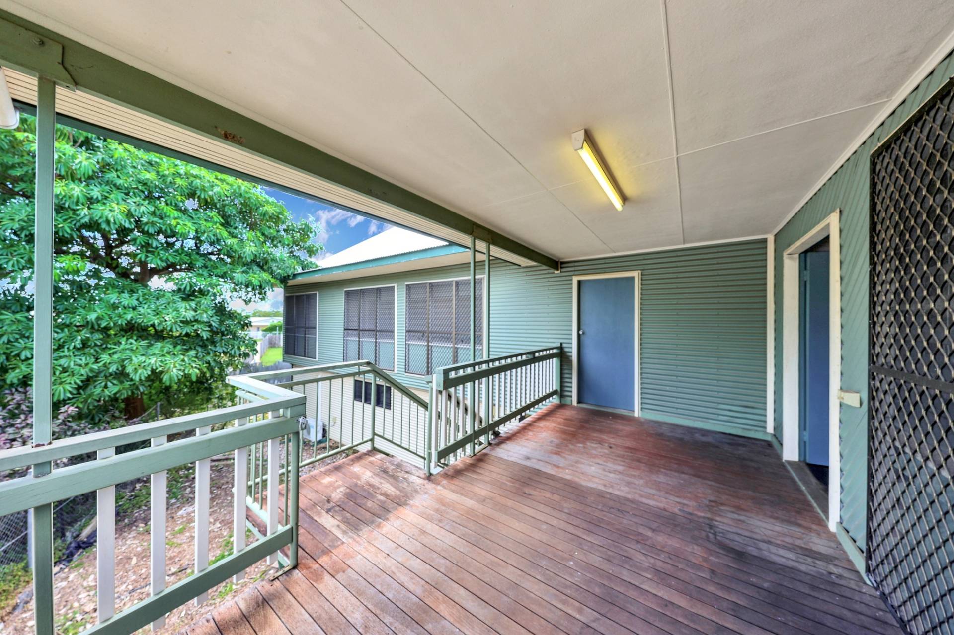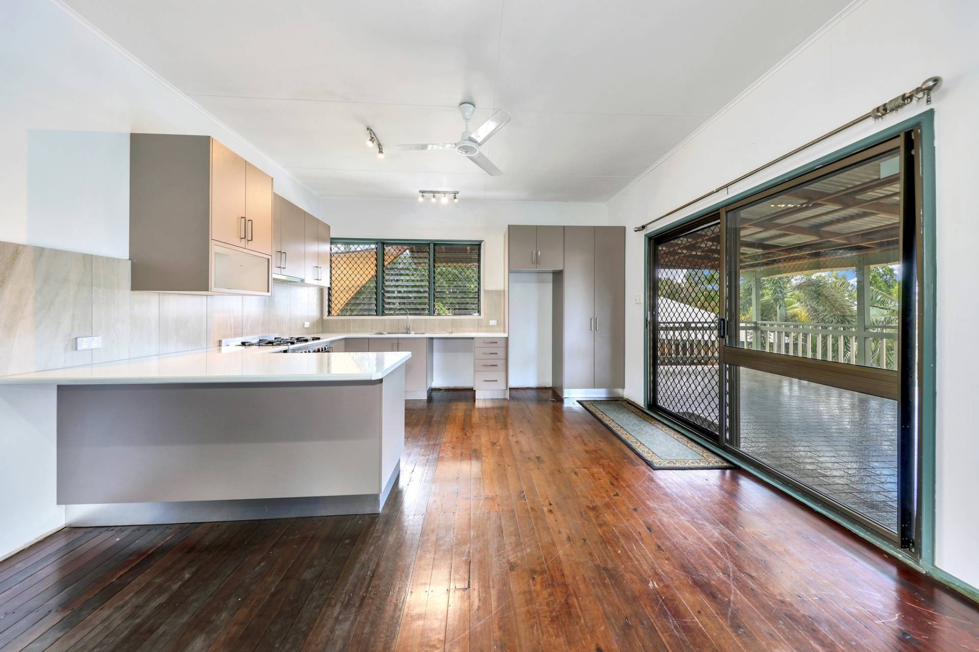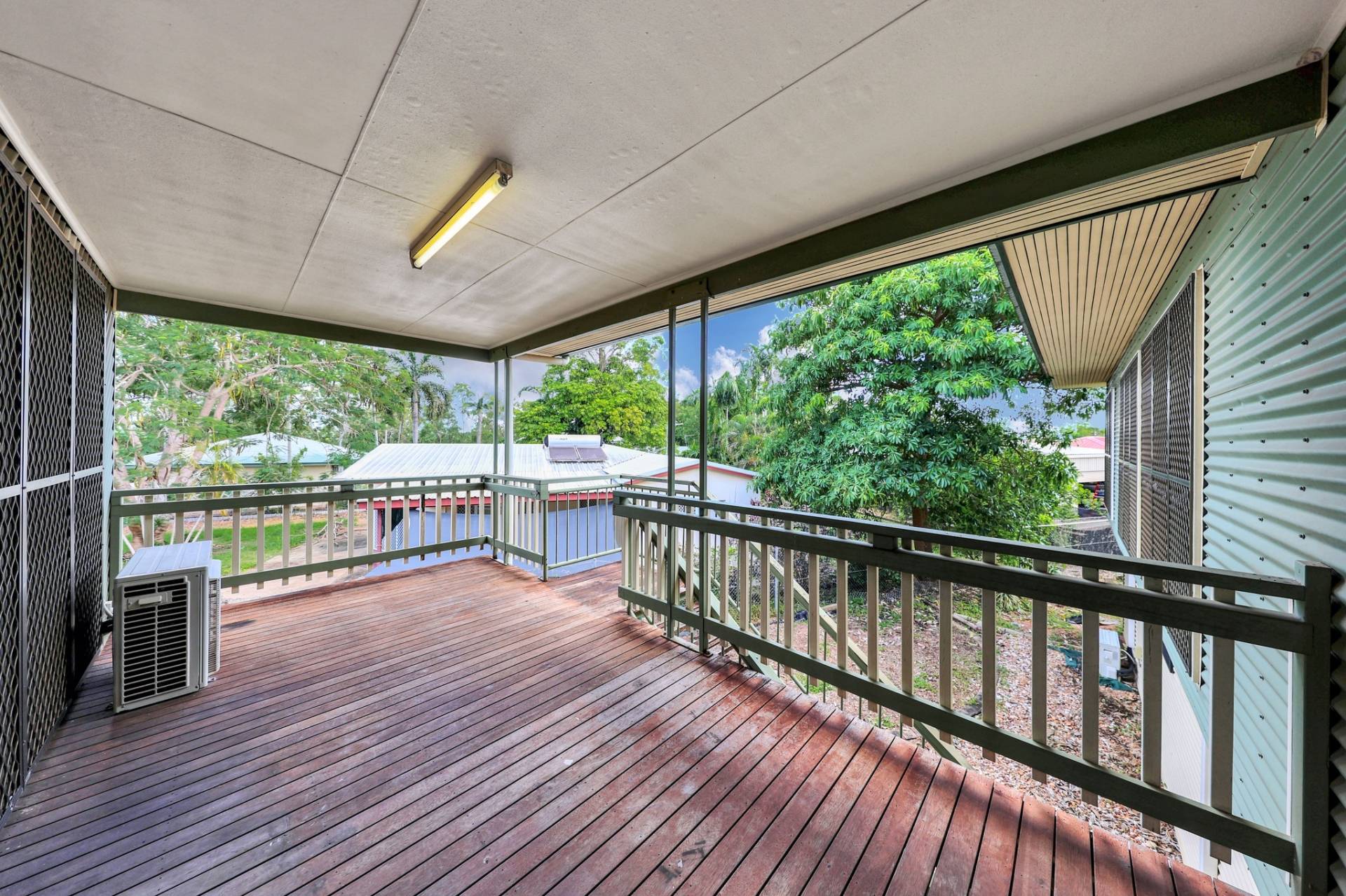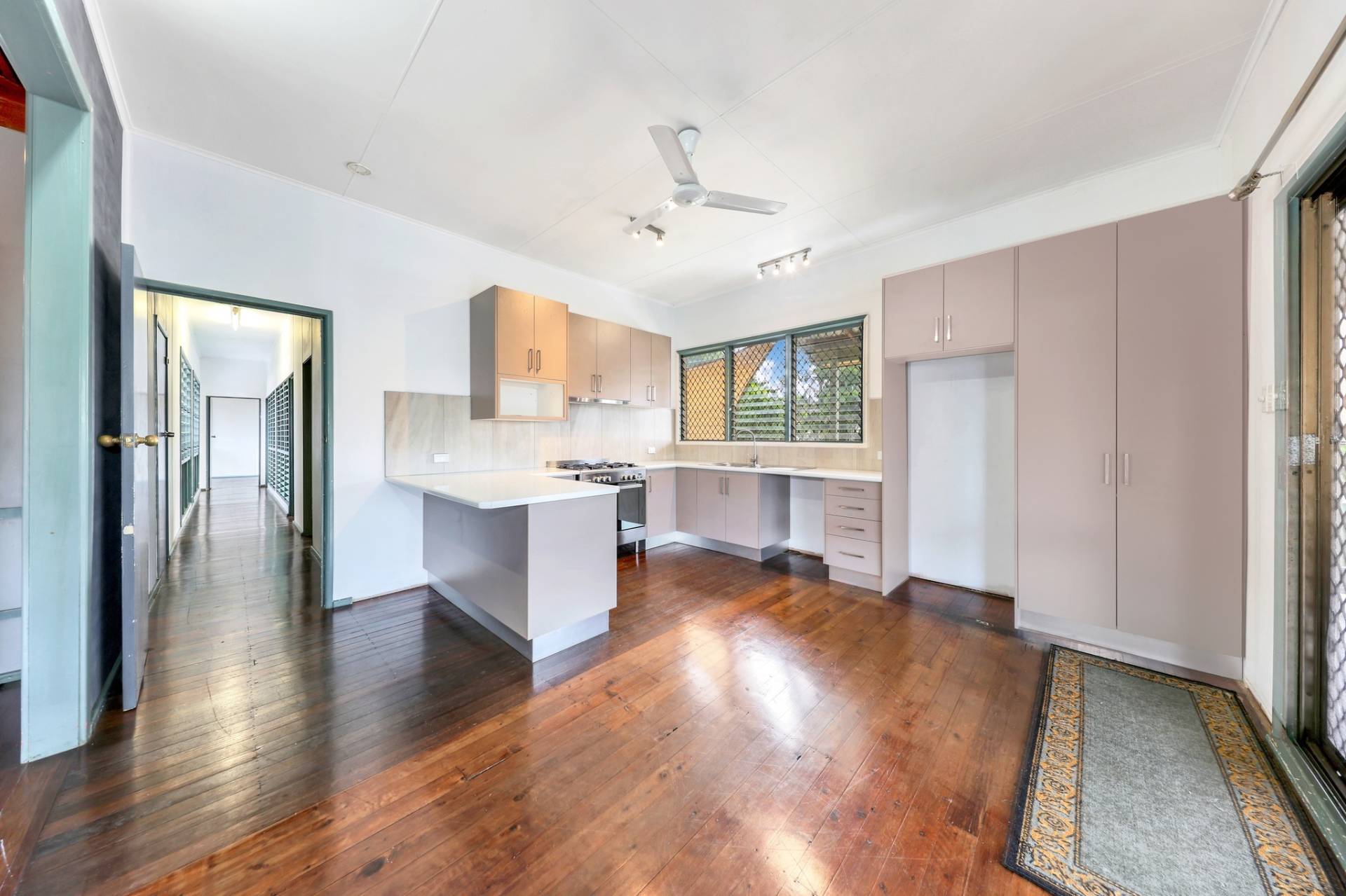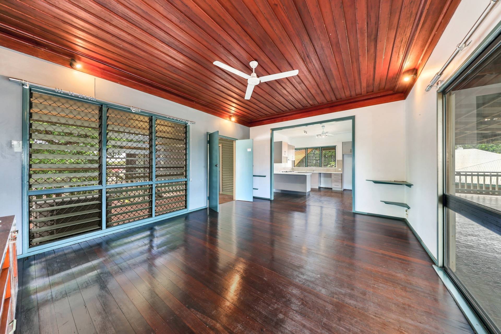 Upstairs the home has a large front facing balcony that overlooks the gardens and streetscape below. Dual sliding doors offer access to the inside of the home with a large living room and separate kitchen space await. The living areas have a timber clad ceiling for a warm touch that compliments the gleaming timber hardwood flooring underfoot. From the living area there are double opening doors to the rear balcony that allows through the cross breezes. The kitchen has wrap around counters in modern tones with a pantry and overhead storage along with breakfast bar seating as well.