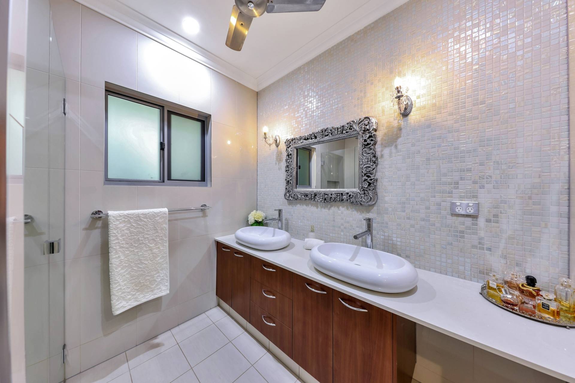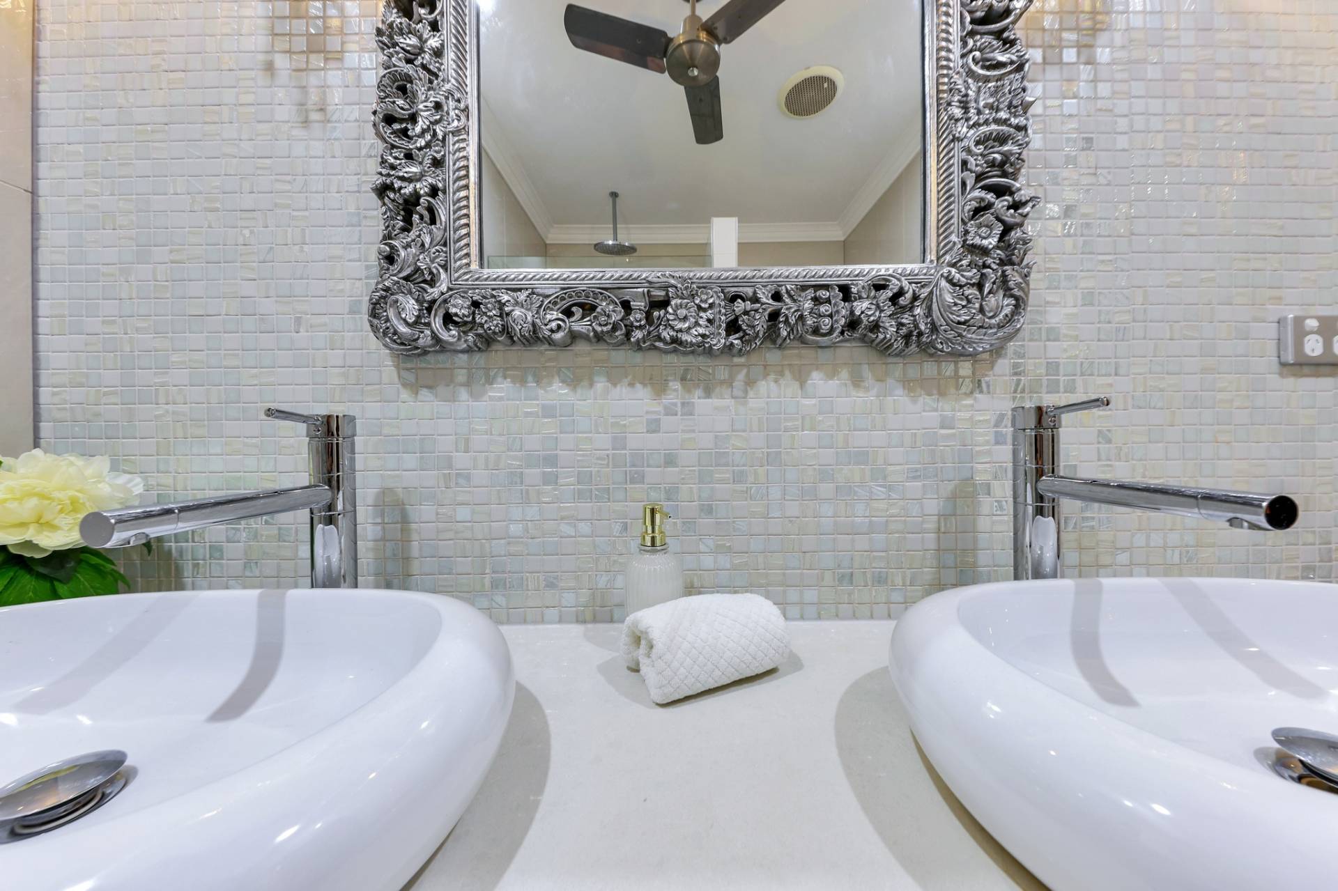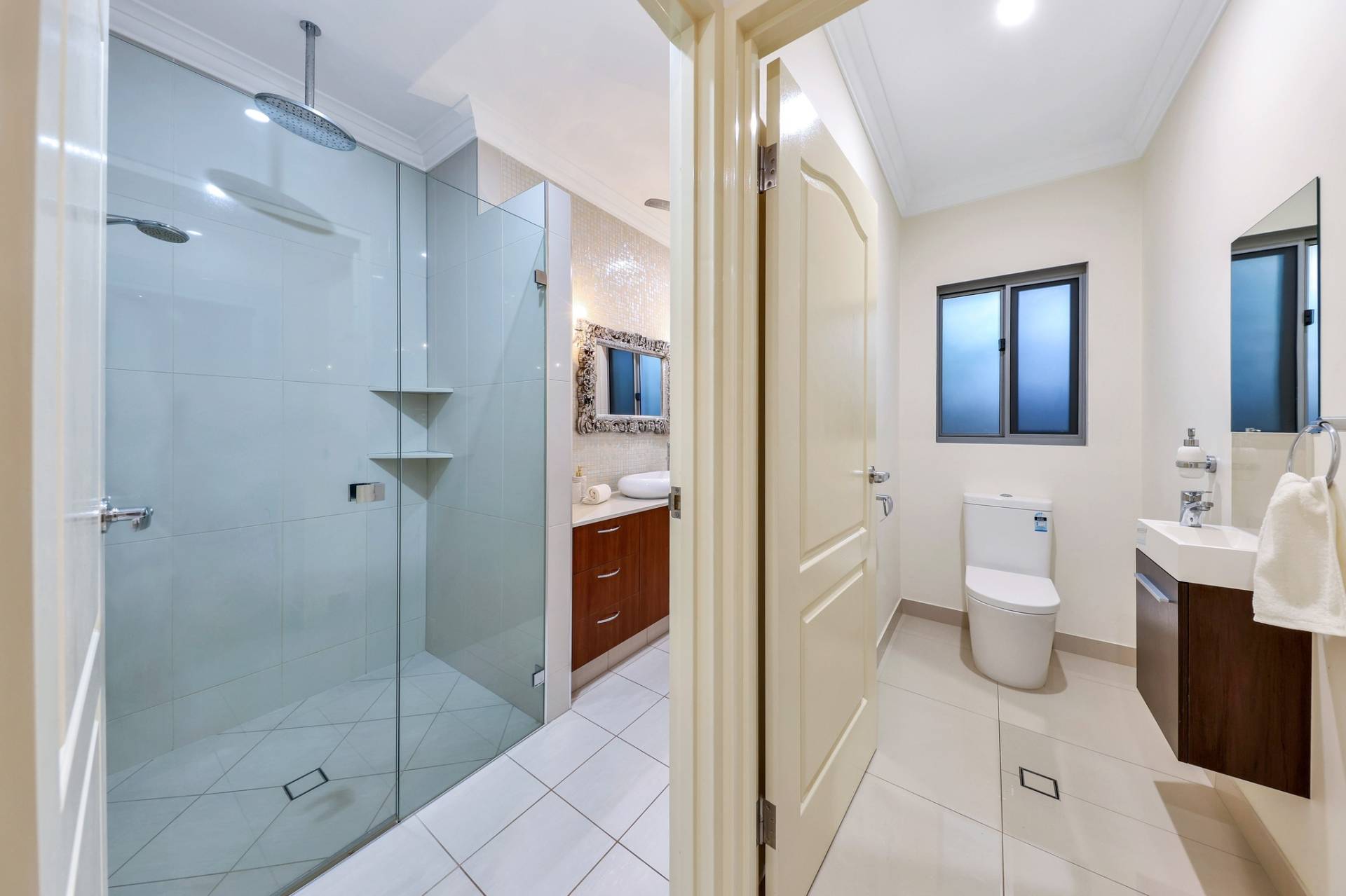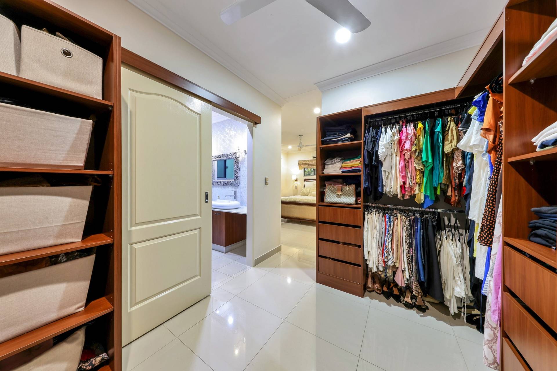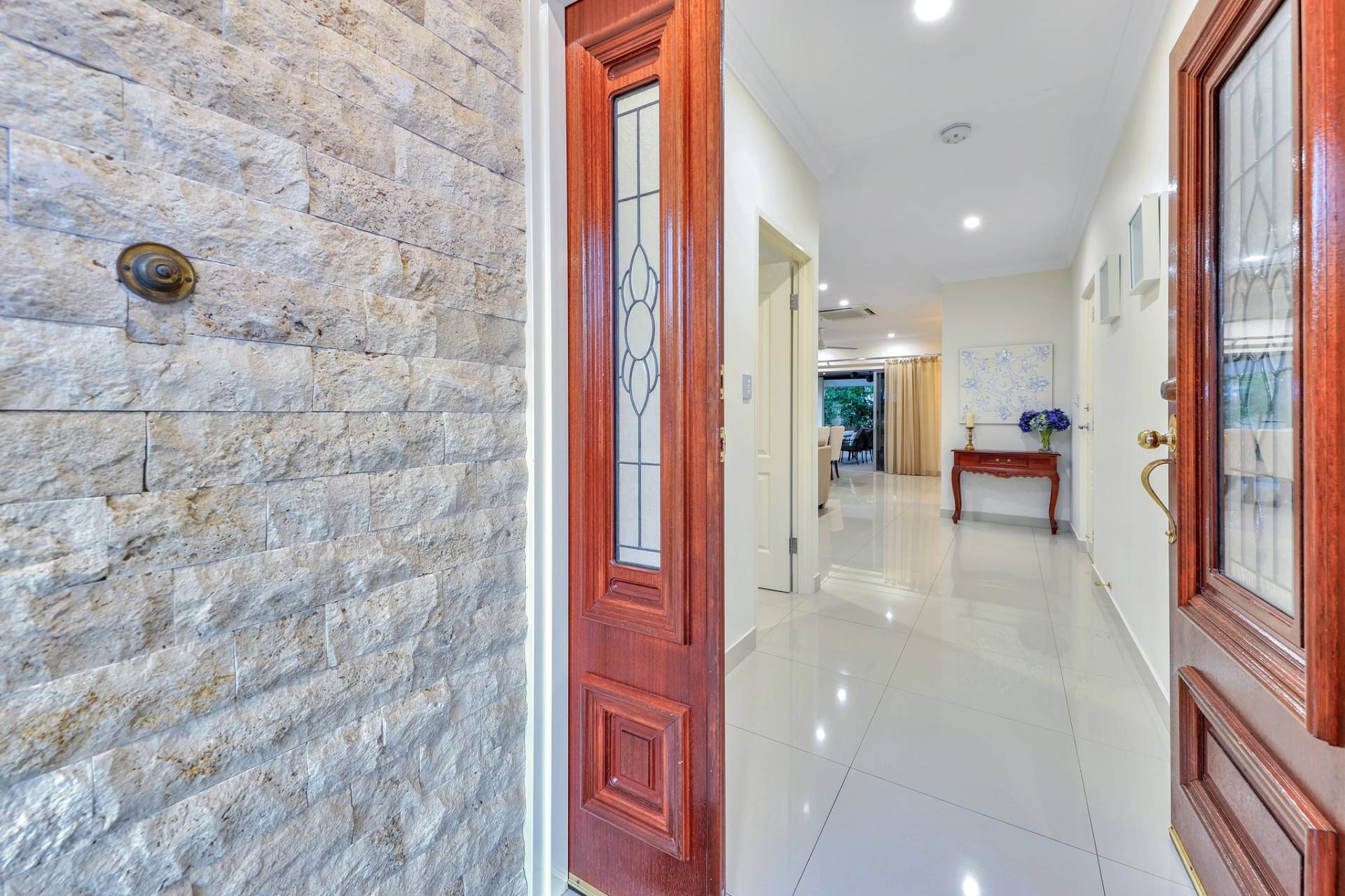 Down the hallway are three additional bedrooms, the master at the far end for absolute privacy includes a stunning walk in robe with custom cabinetry and a lux ensuite bathroom with feature tiles and a pendant lighting.
