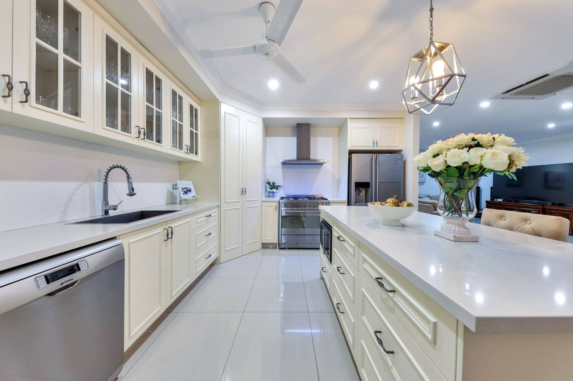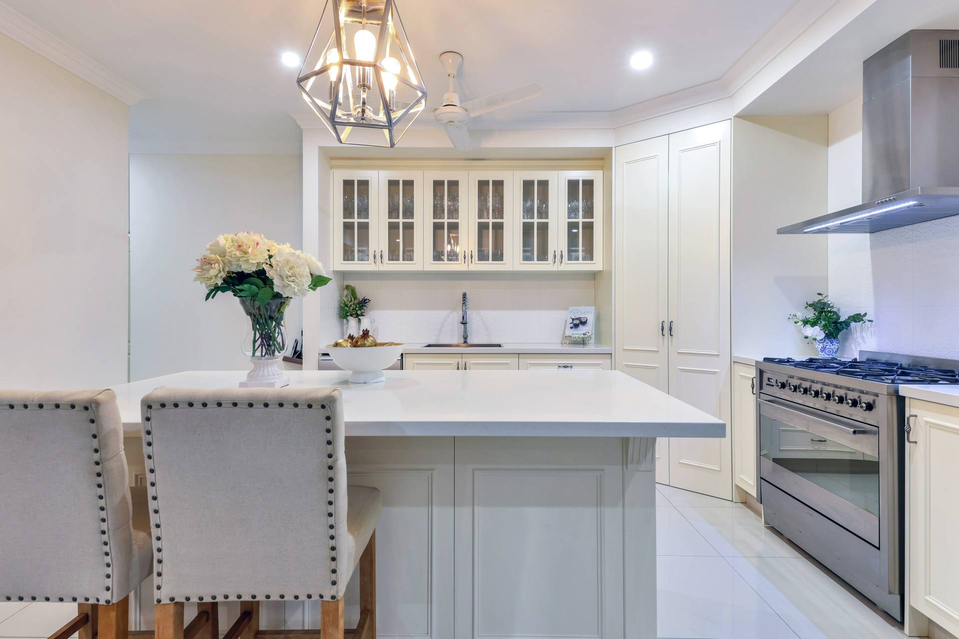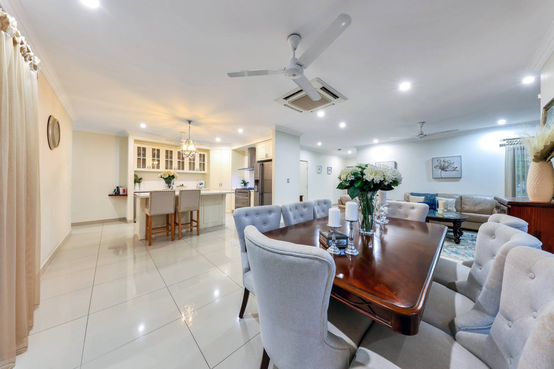 Next is the free flowing living, dining and kitchen area that have light filled windows draped in elegant curtains to soften the internal living areas. The kitchen is a designed dream with glass panelled overhead storage space, a stone topped island bench with pendant lighting plus a generous walk in pantry and feature tiled splashback.