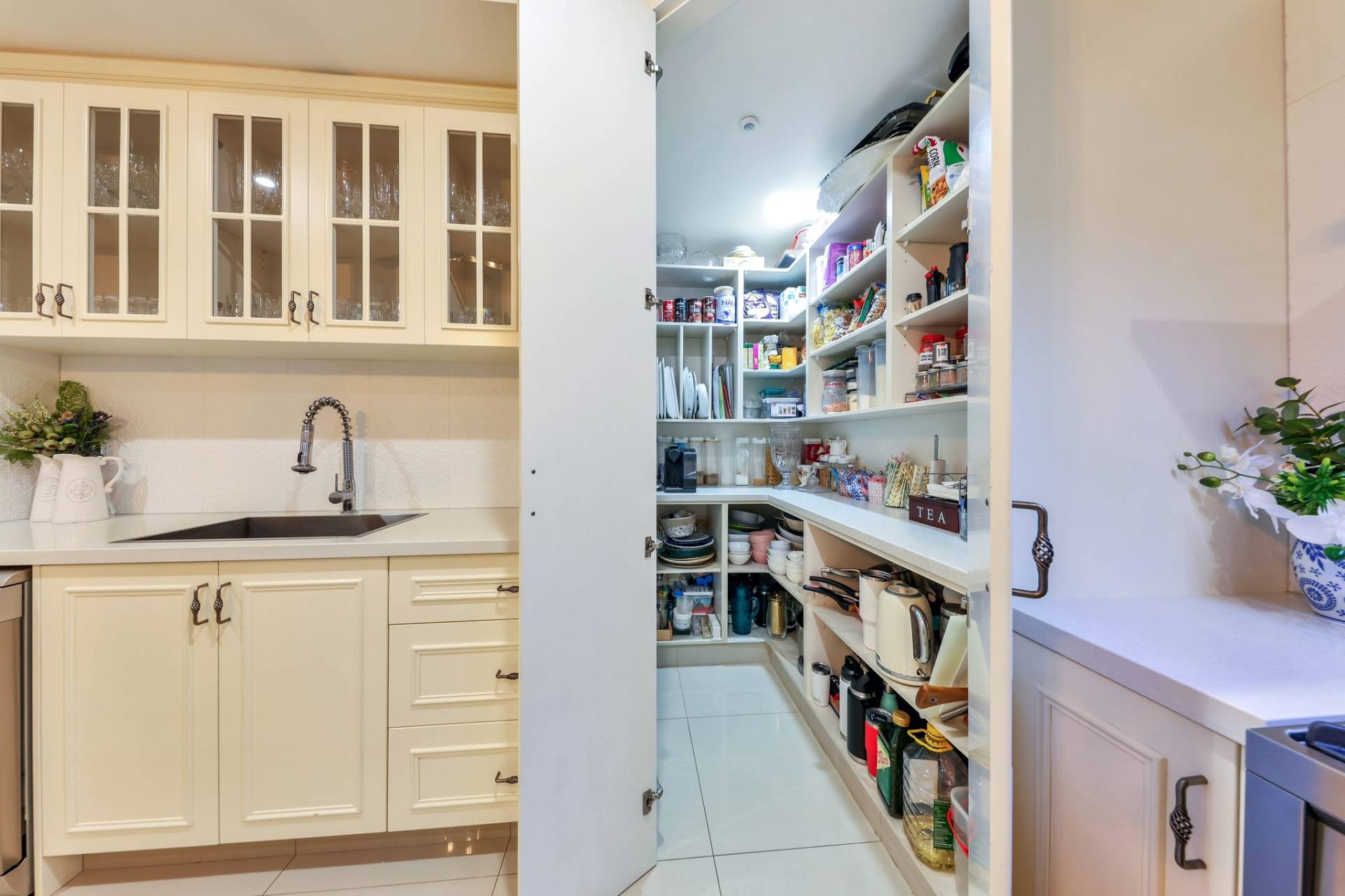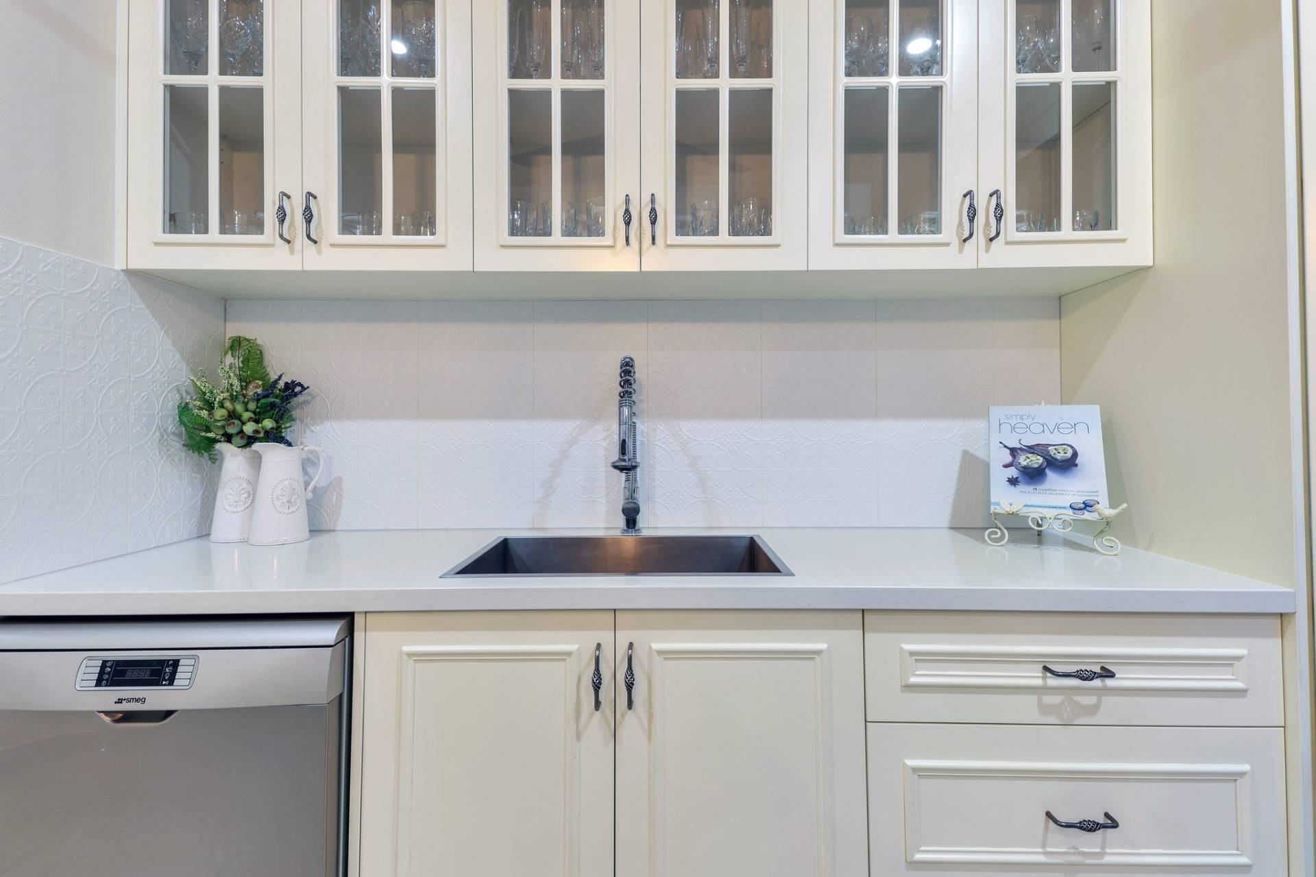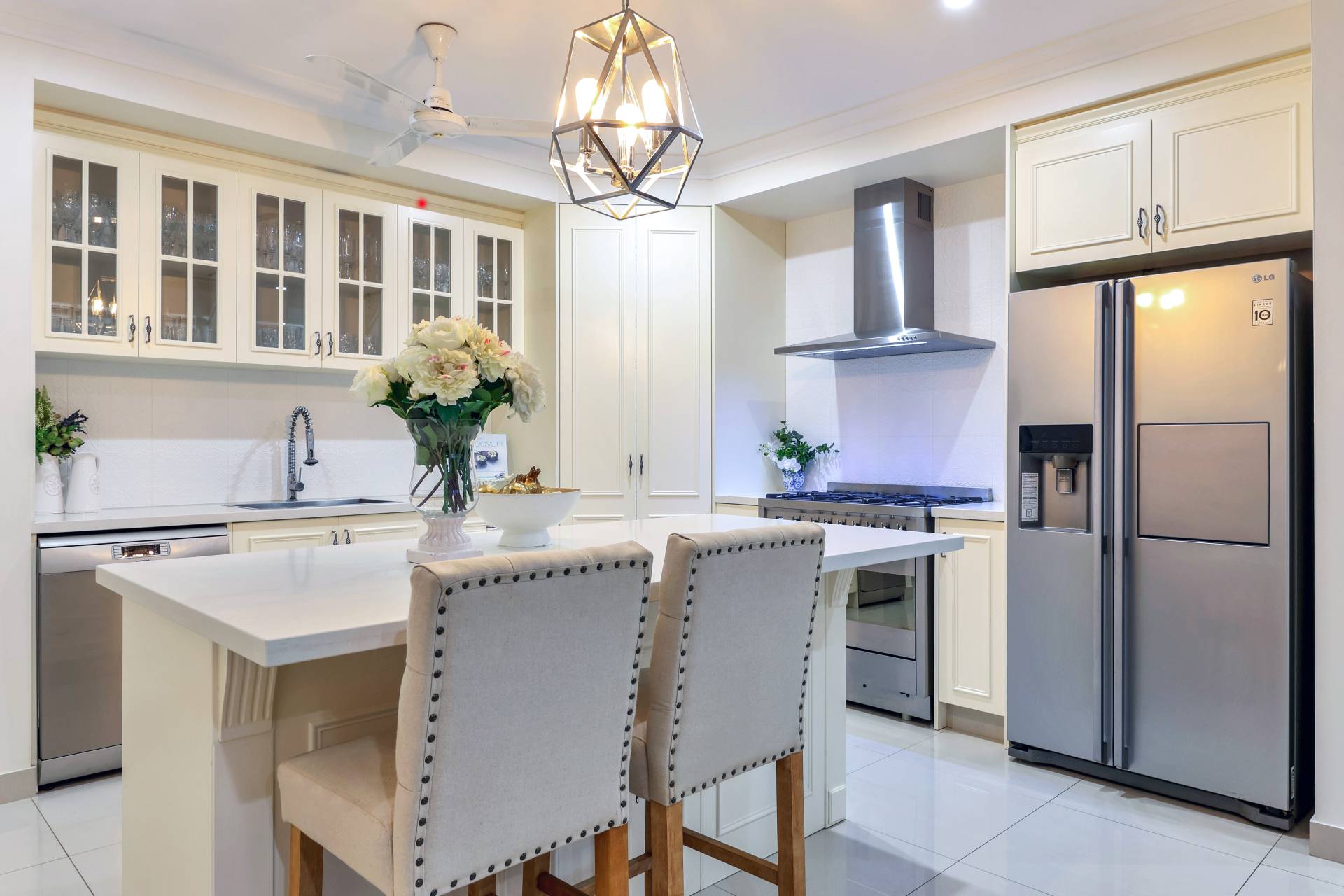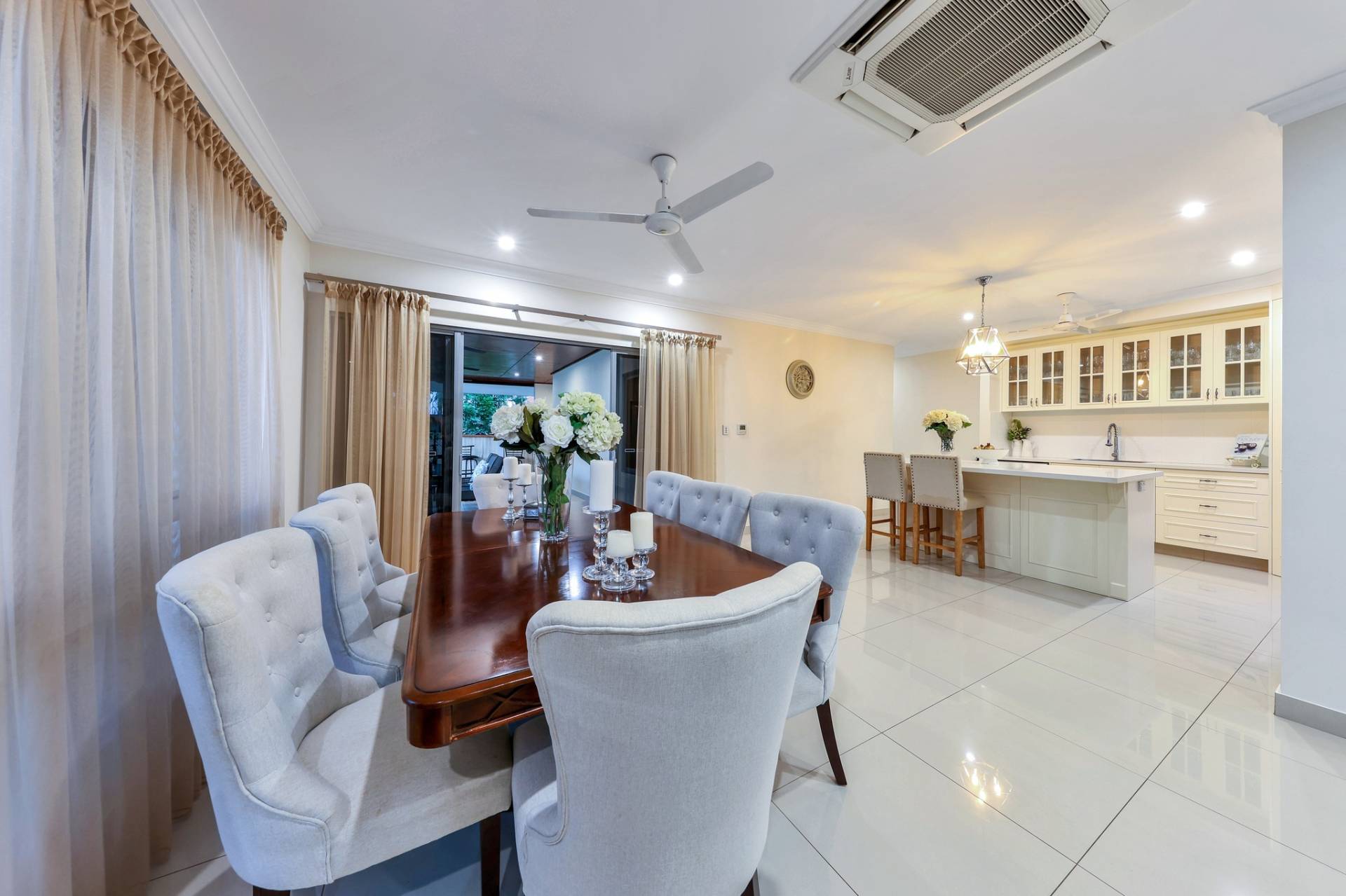 Next is the free flowing living, dining and kitchen area that have light filled windows draped in elegant curtains to soften the internal living areas. The kitchen is a designed dream with glass panelled overhead storage space, a stone topped island bench with pendant lighting plus a generous walk in pantry and feature tiled splashback.