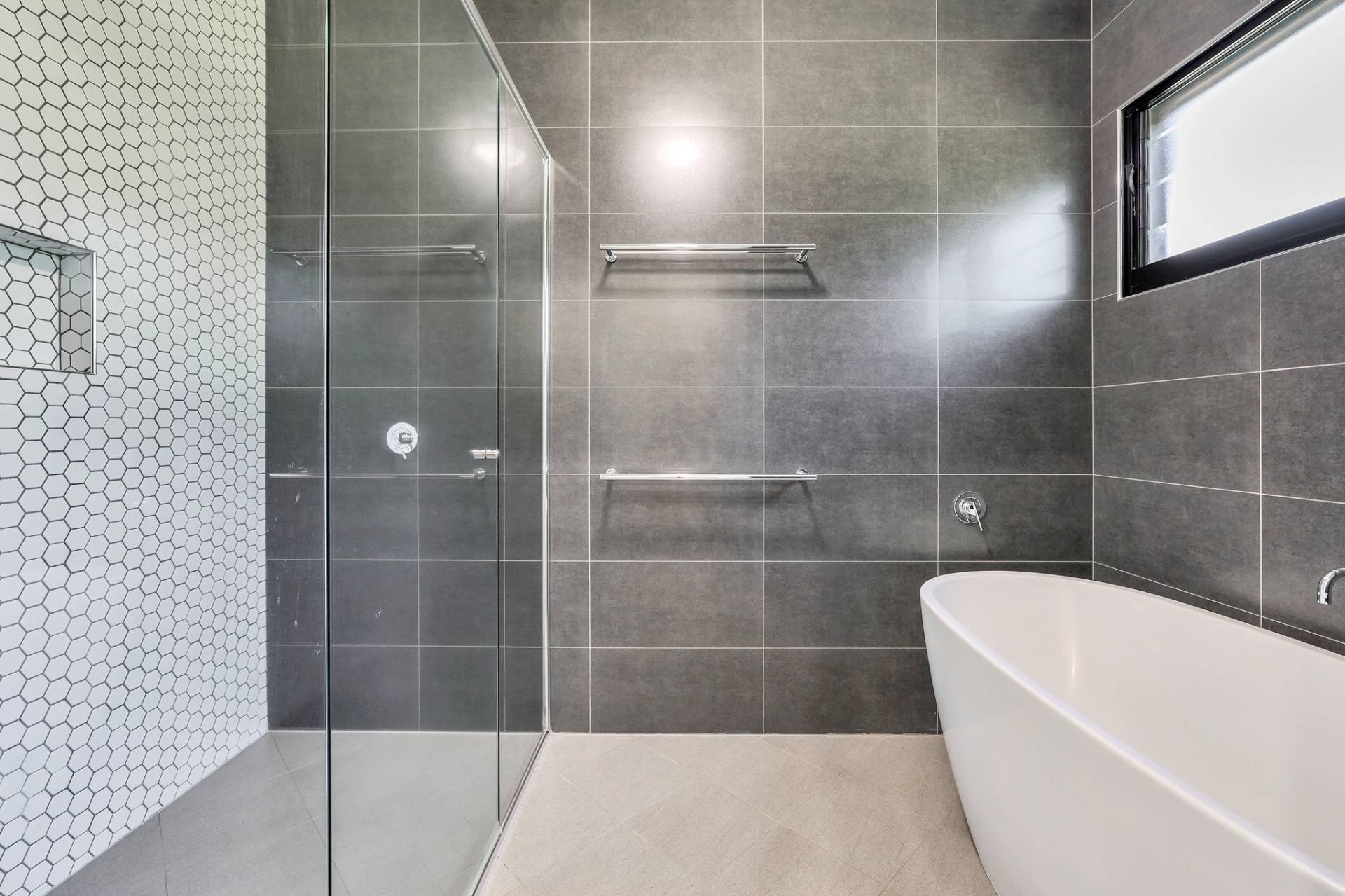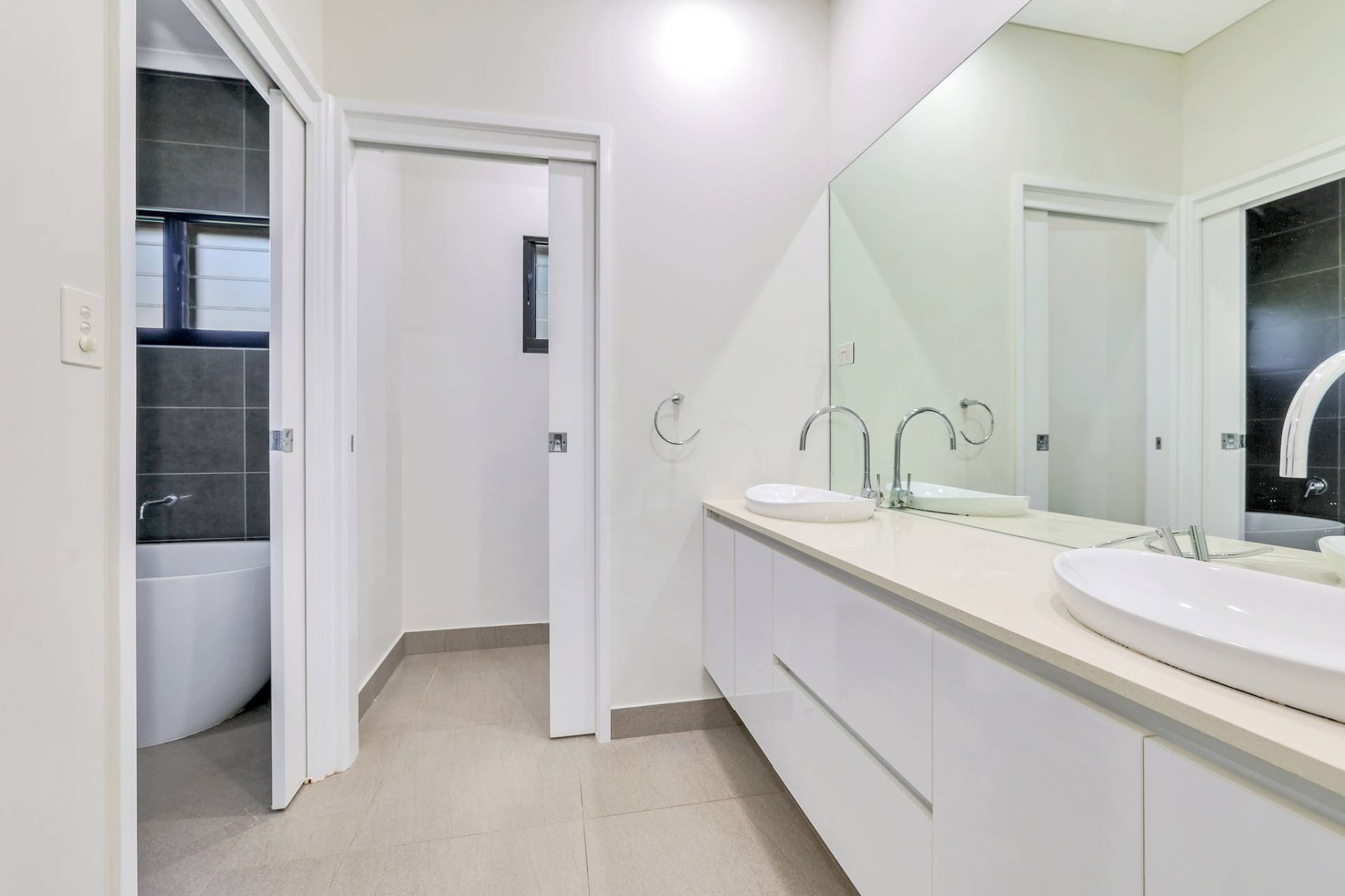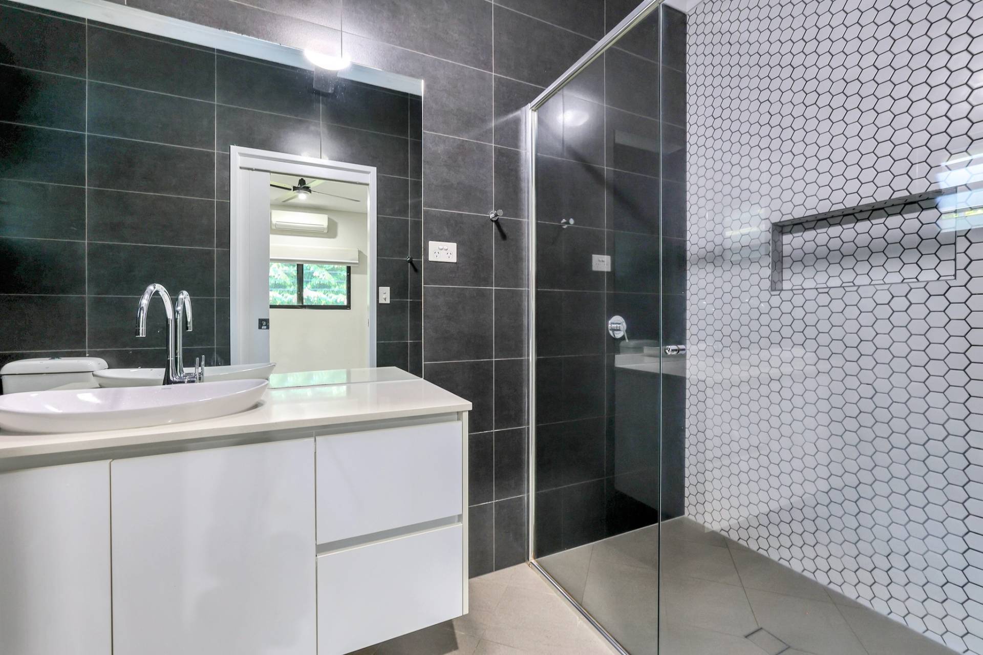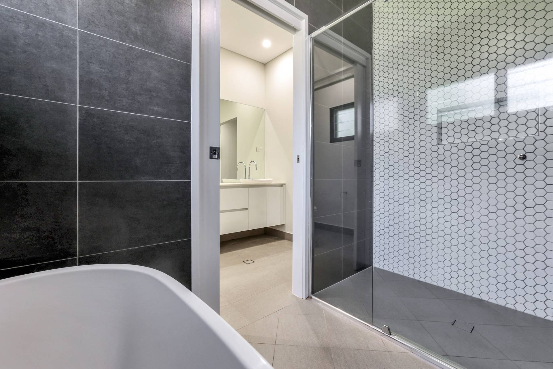 Down the hallway are 3 bedrooms with robes, tiled flooring and A/C. the main bathroom has an open twin vanity along with a shower and bathroom plus a sep toilet. The master bedroom suite is positioned at the far end of the hallway for total privacy and is compliments with a wall of built in robes along with twin dropped pendant lighting either side of the bed plus a luxurious ensuite bathroom with stone counters and a stunning shower with feature tiles.