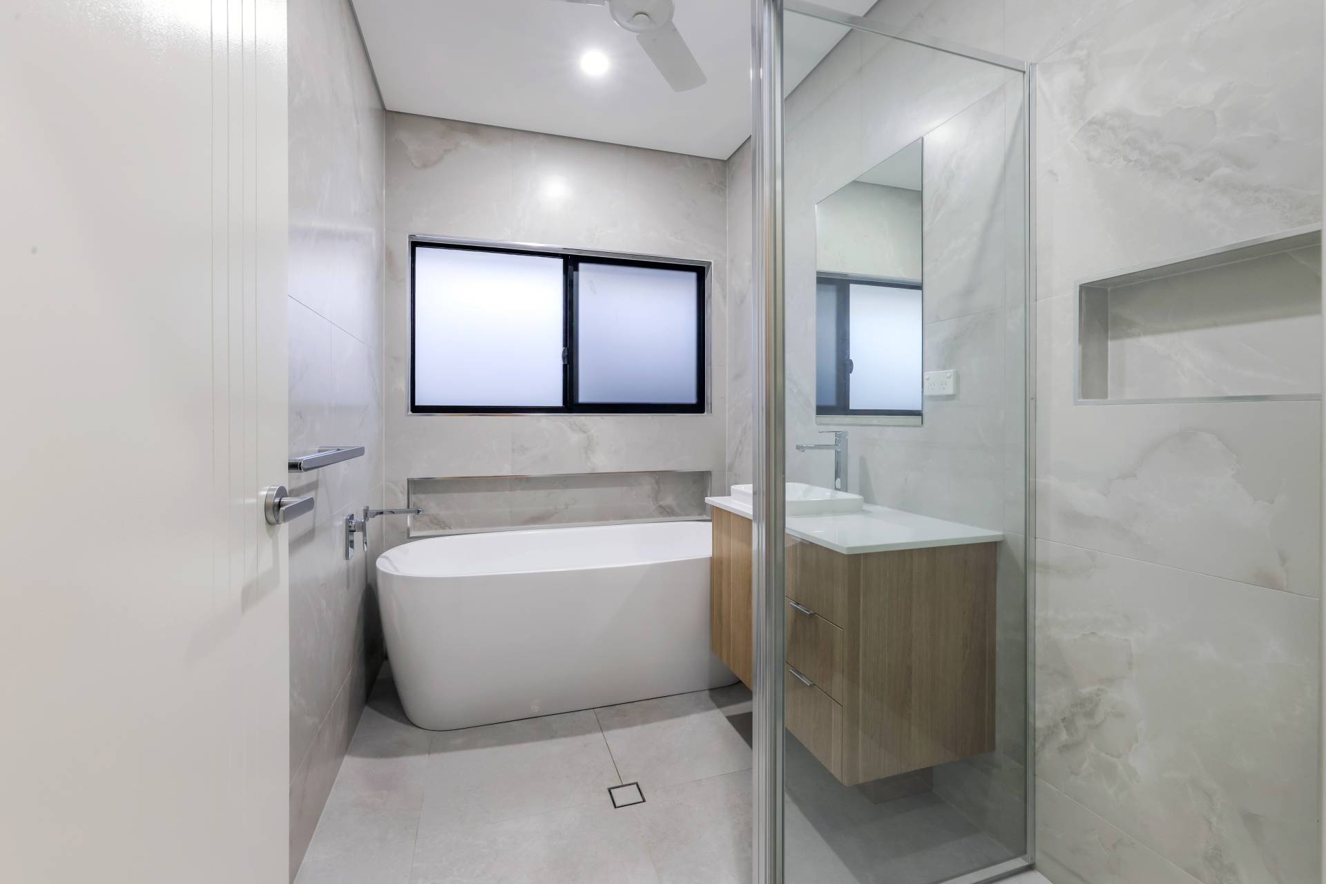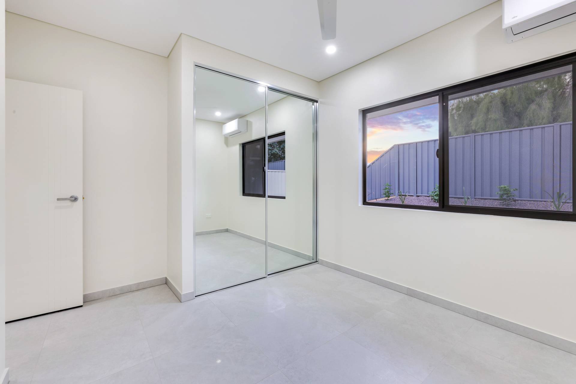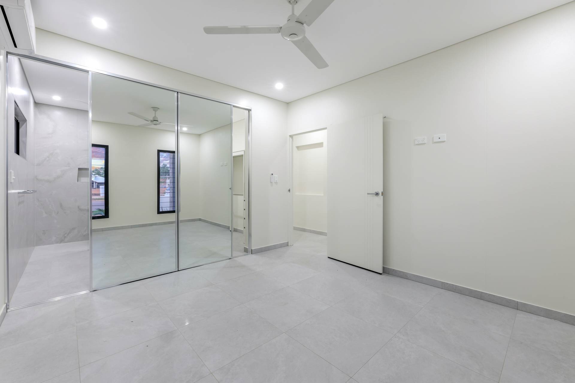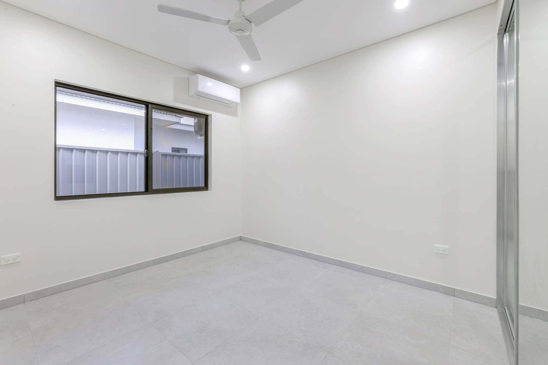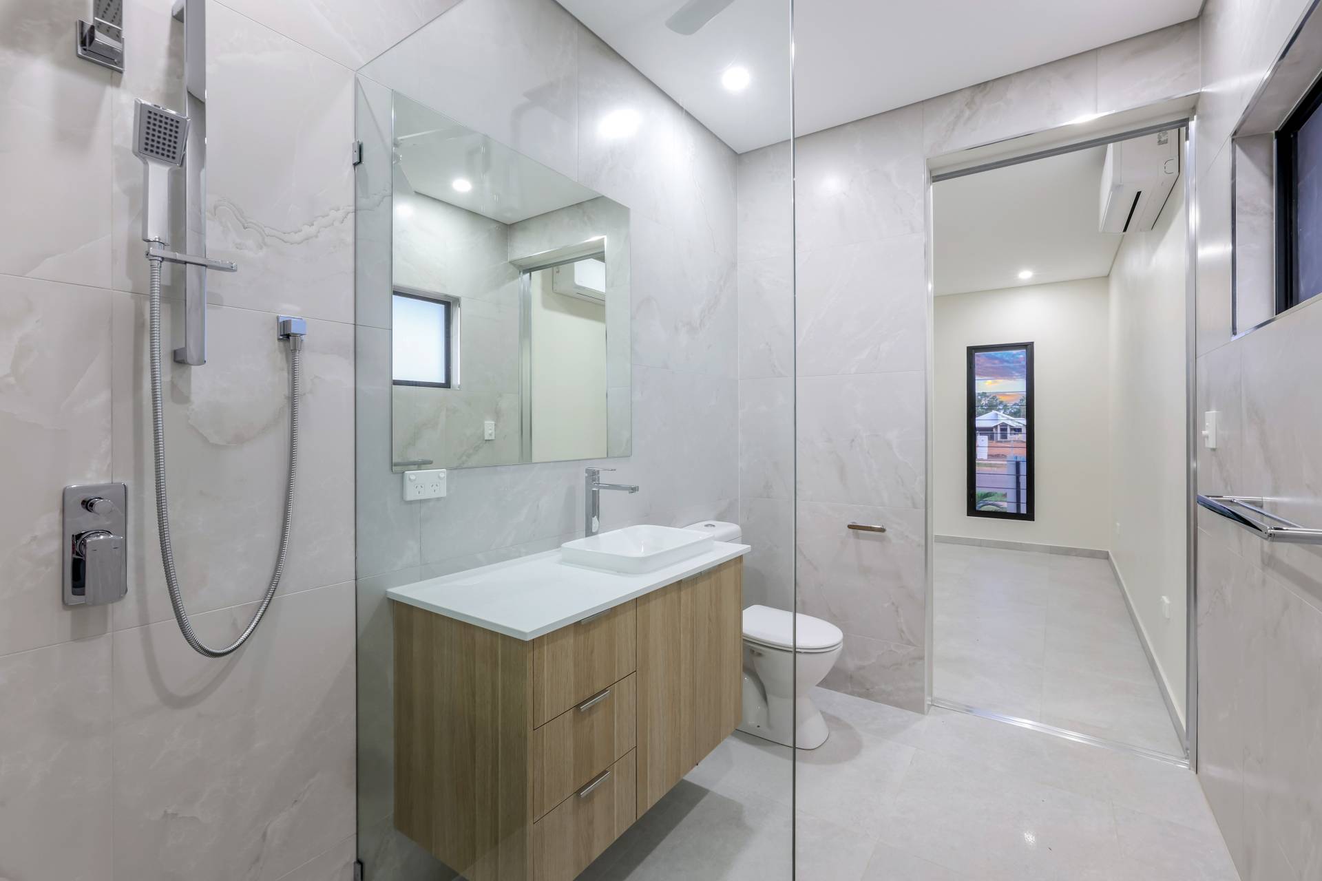 Down the hallway there are 3 bedrooms each with a built in robe and tiled flooring plus split A/C. the main bathroom has a bath tub and a shower with a central vanity between them plus a sep toilet and a hallway linen press. The master bedroom is front facing with a secret walk in robe and ensuite bathroom behind a wall of sliding mirrors. The ensuite has a glass framed shower and a floating vanity.