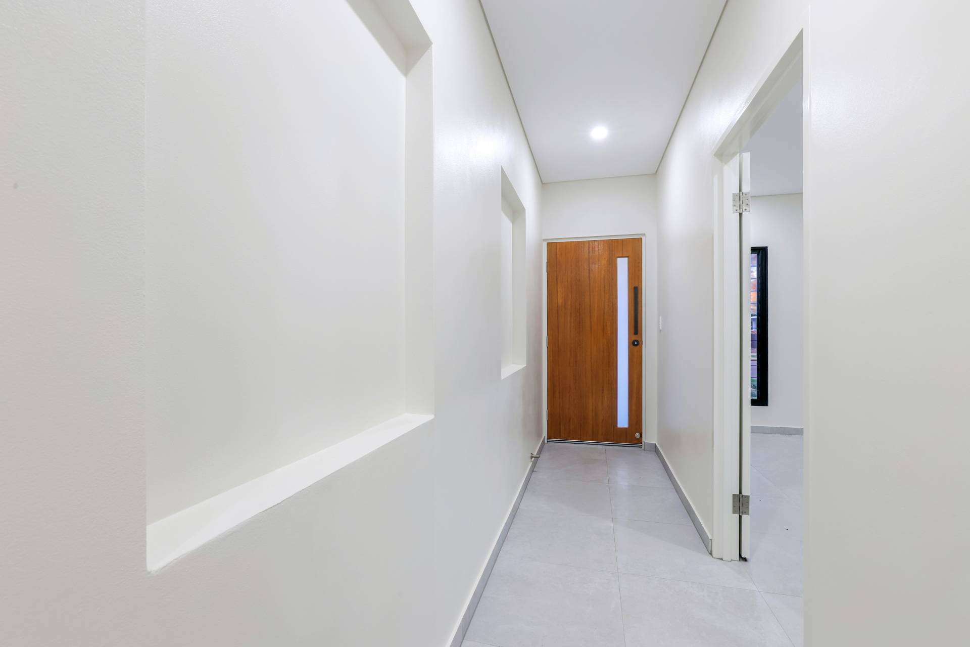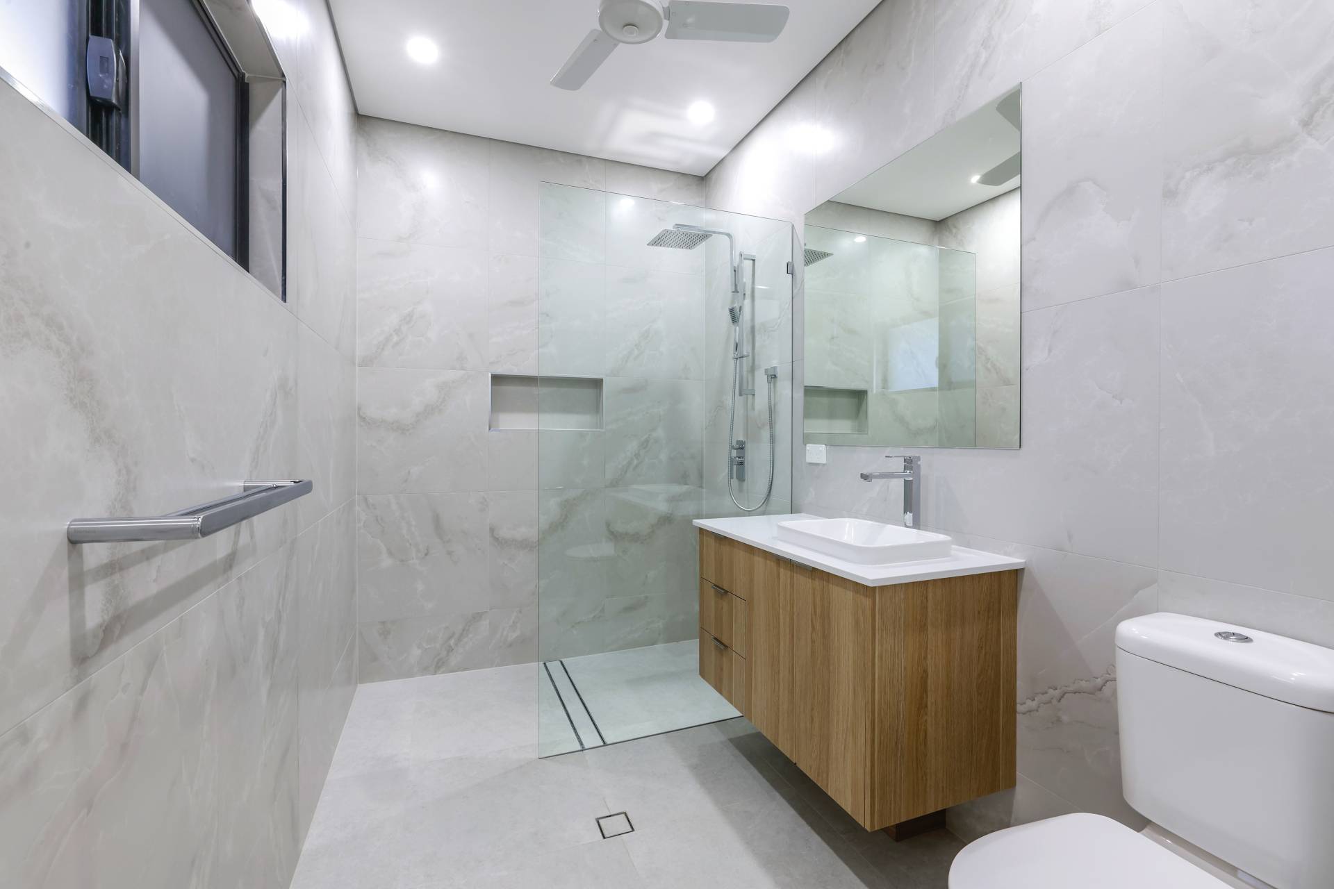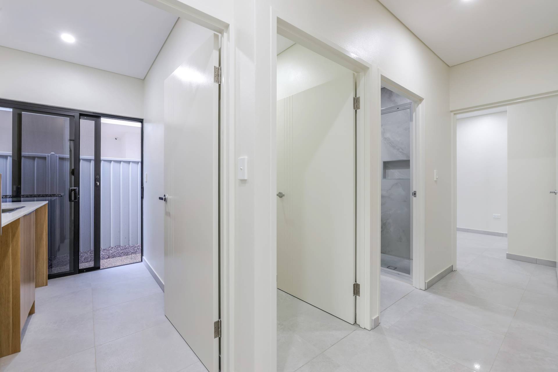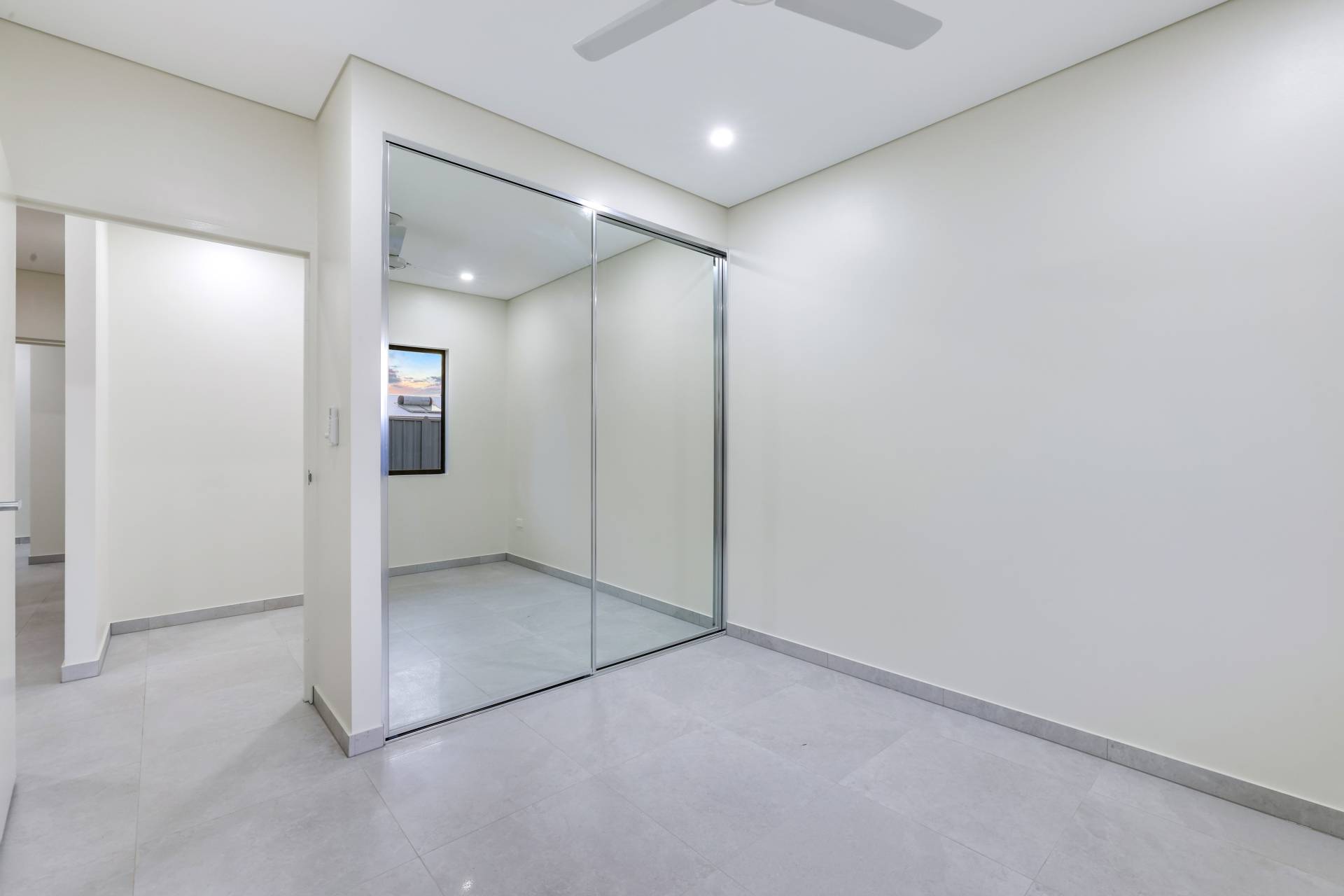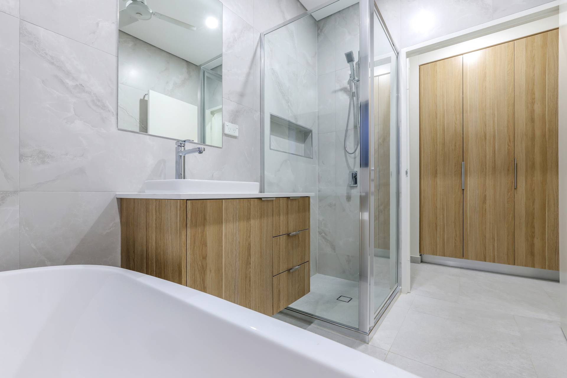 Down the hallway there are 3 bedrooms each with a built in robe and tiled flooring plus split A/C. the main bathroom has a bath tub and a shower with a central vanity between them plus a sep toilet and a hallway linen press. The master bedroom is front facing with a secret walk in robe and ensuite bathroom behind a wall of sliding mirrors. The ensuite has a glass framed shower and a floating vanity.
