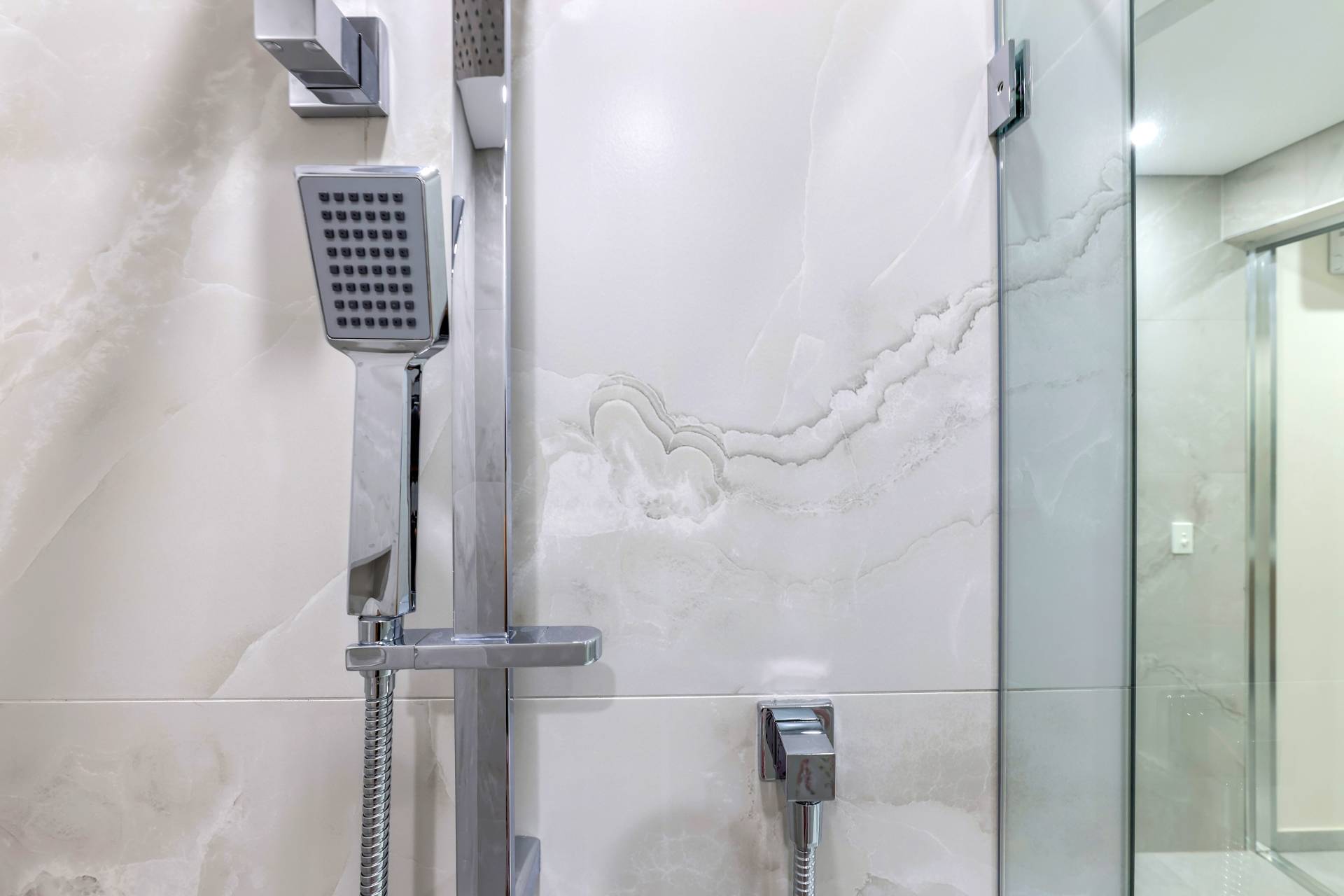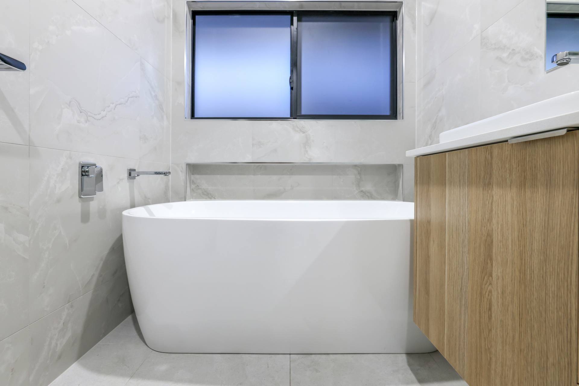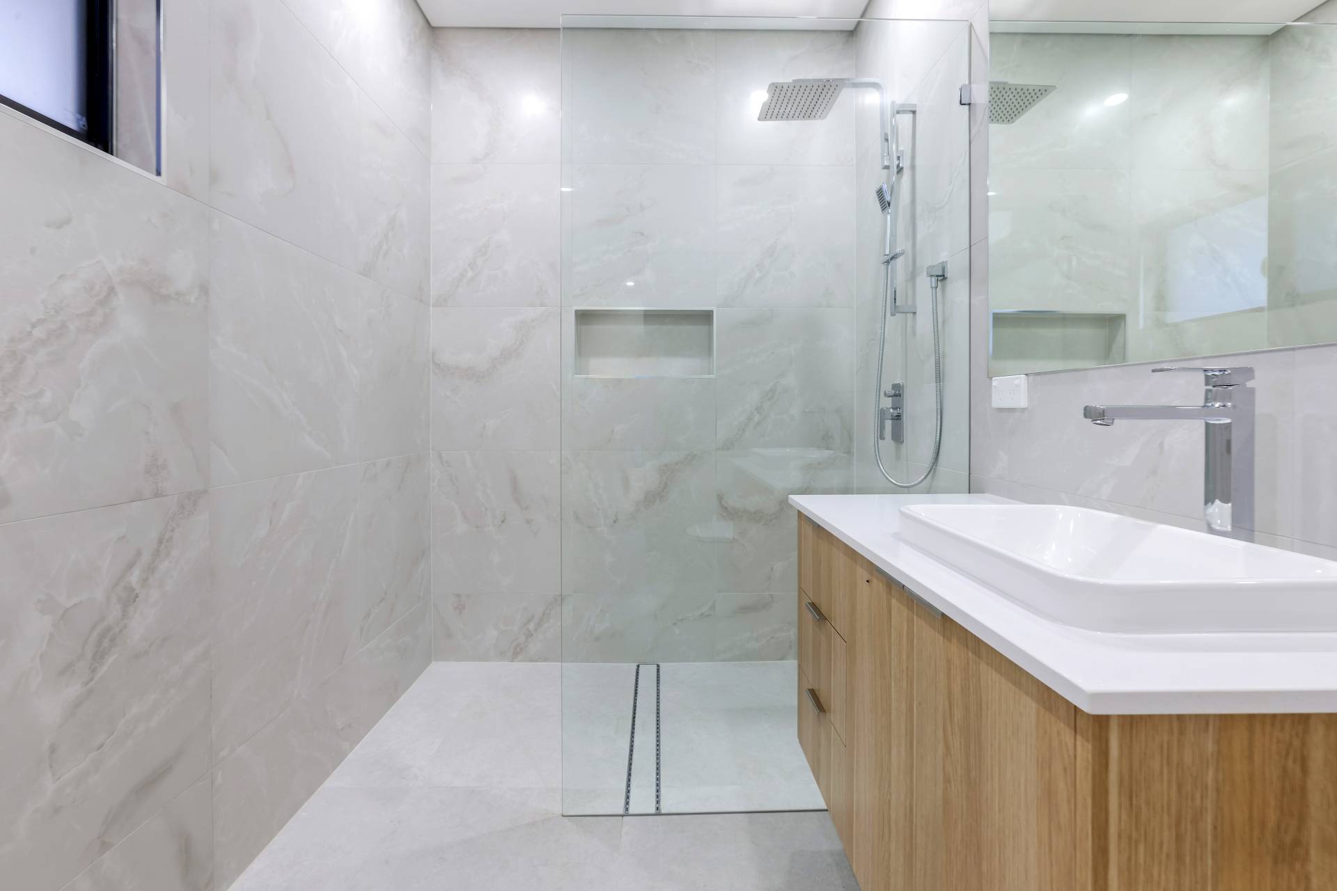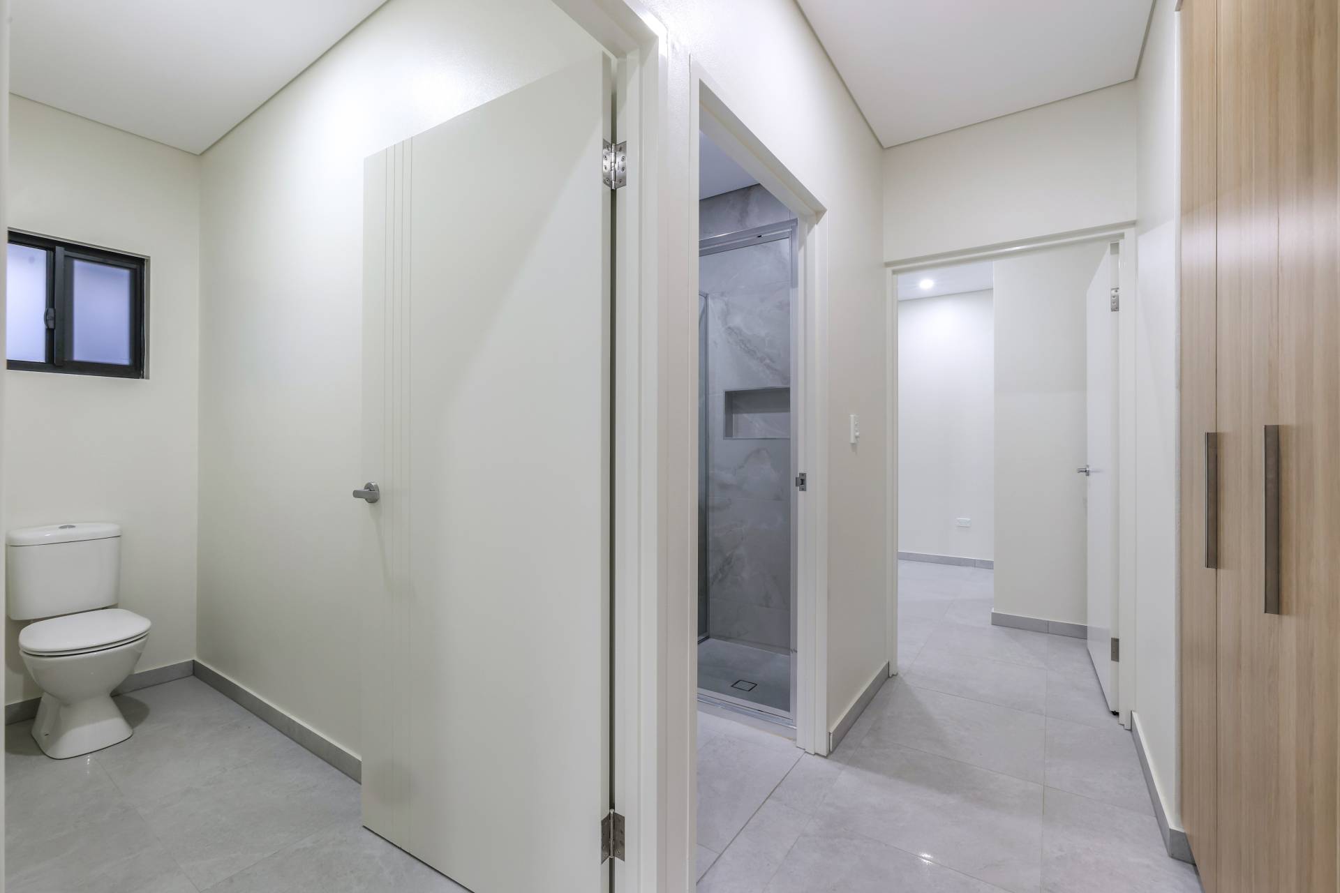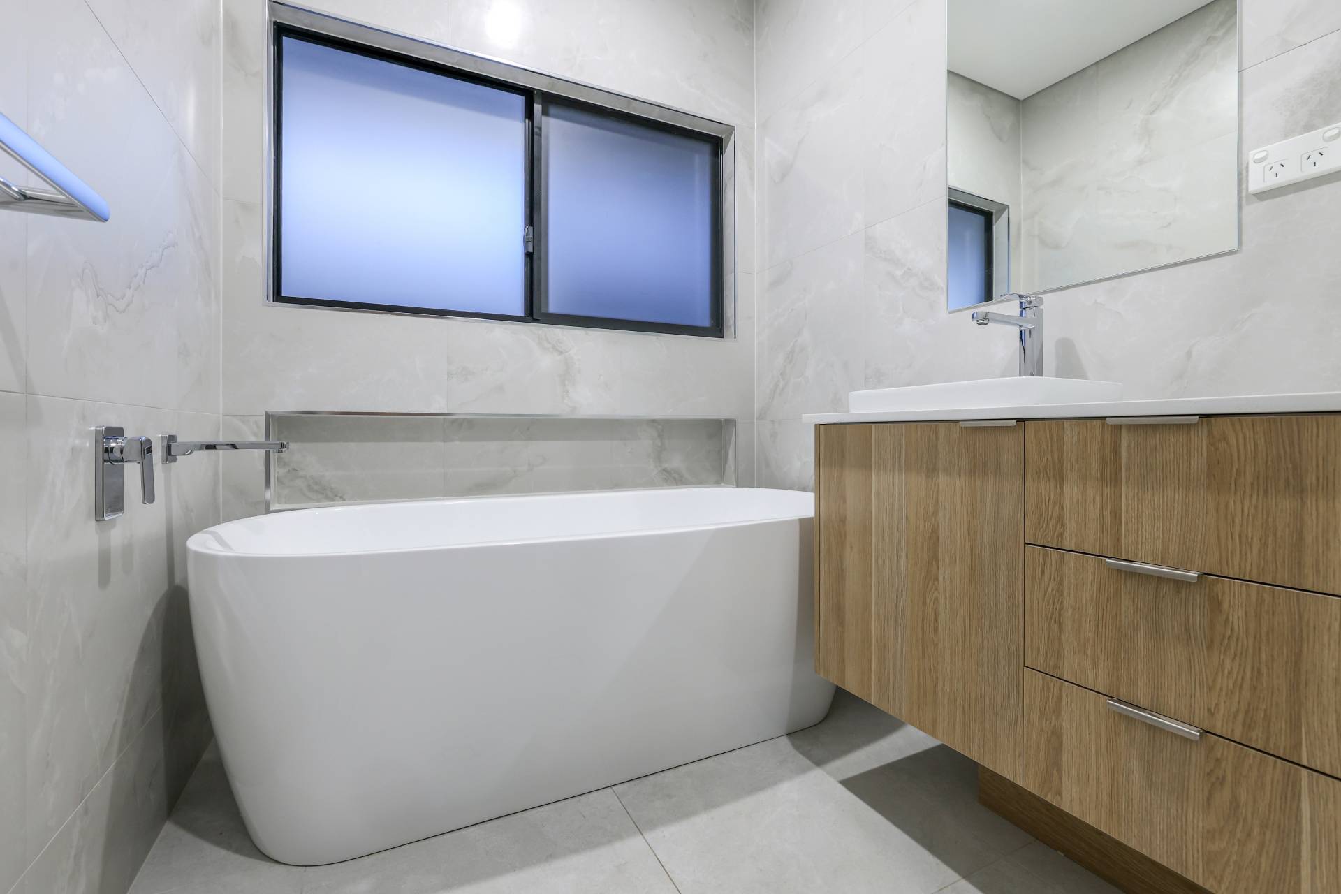 Down the hallway there are 3 bedrooms each with a built in robe and tiled flooring plus split A/C. the main bathroom has a bath tub and a shower with a central vanity between them plus a sep toilet and a hallway linen press. The master bedroom is front facing with a secret walk in robe and ensuite bathroom behind a wall of sliding mirrors. The ensuite has a glass framed shower and a floating vanity.