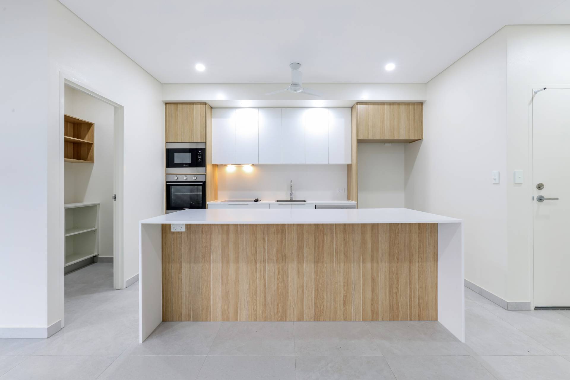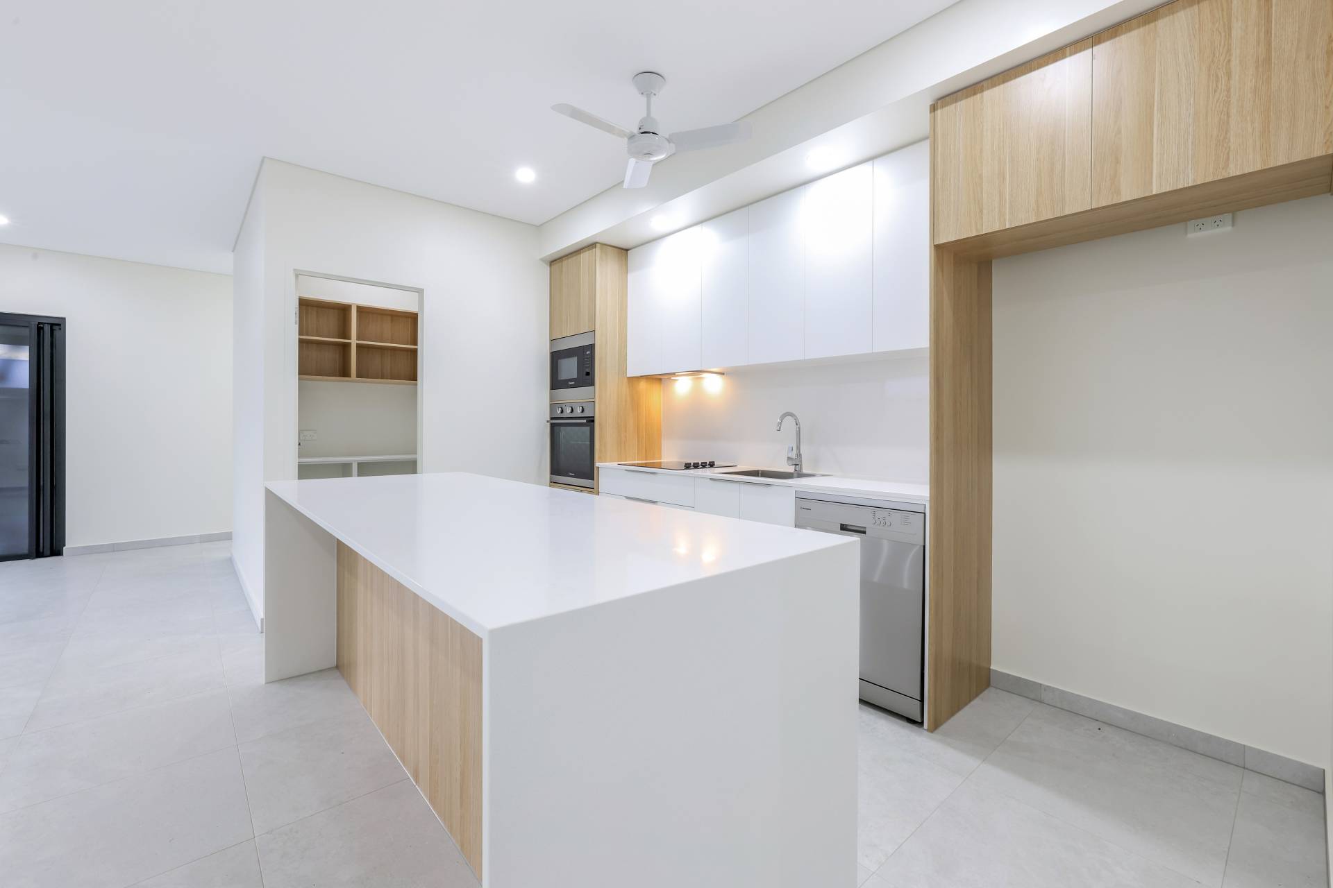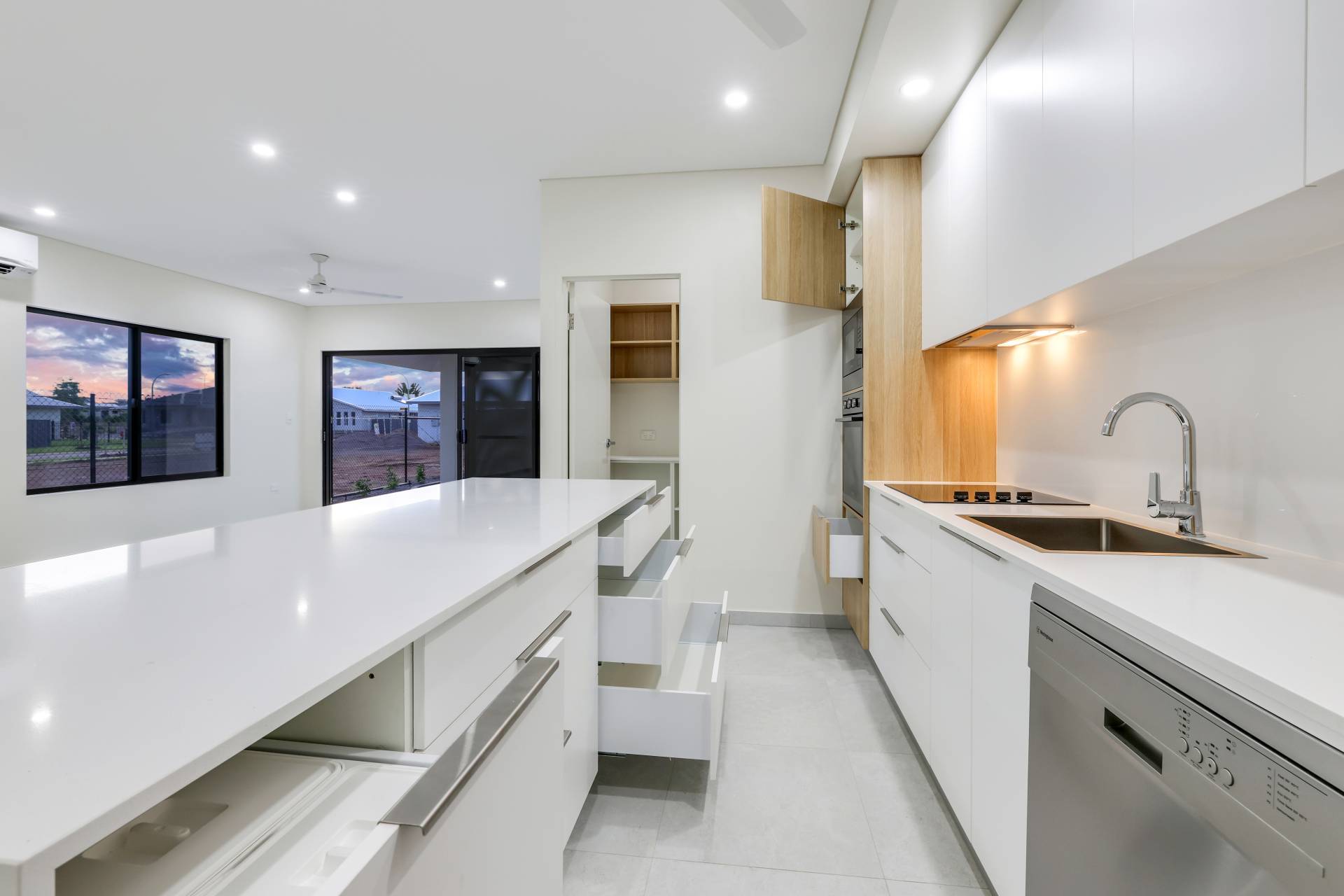 The kitchen gets the chefs kiss – offering a walk in pantry with generous storage capacity along with stone topped island bench with breakfast bar seating and overhead storage space, built in bins, pull out soft close draws and finished in warm earthy tones contrasting off the timeless white aesthetic.