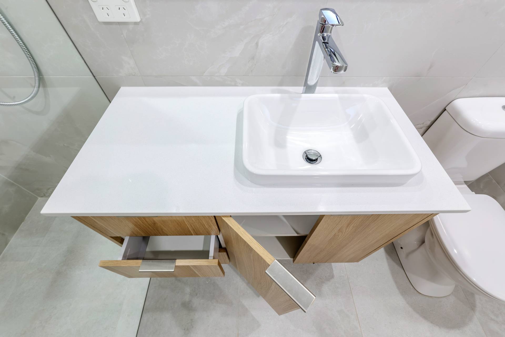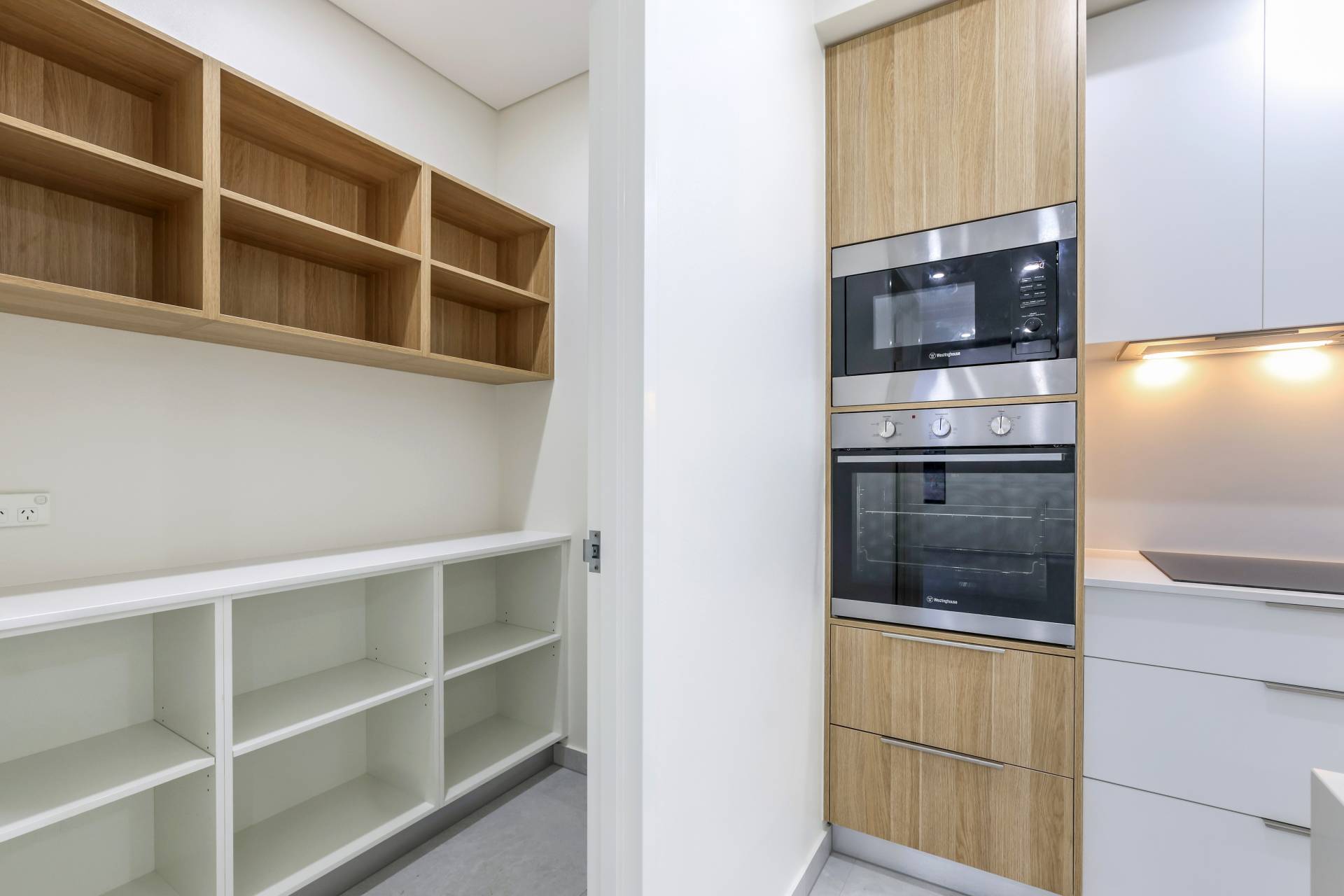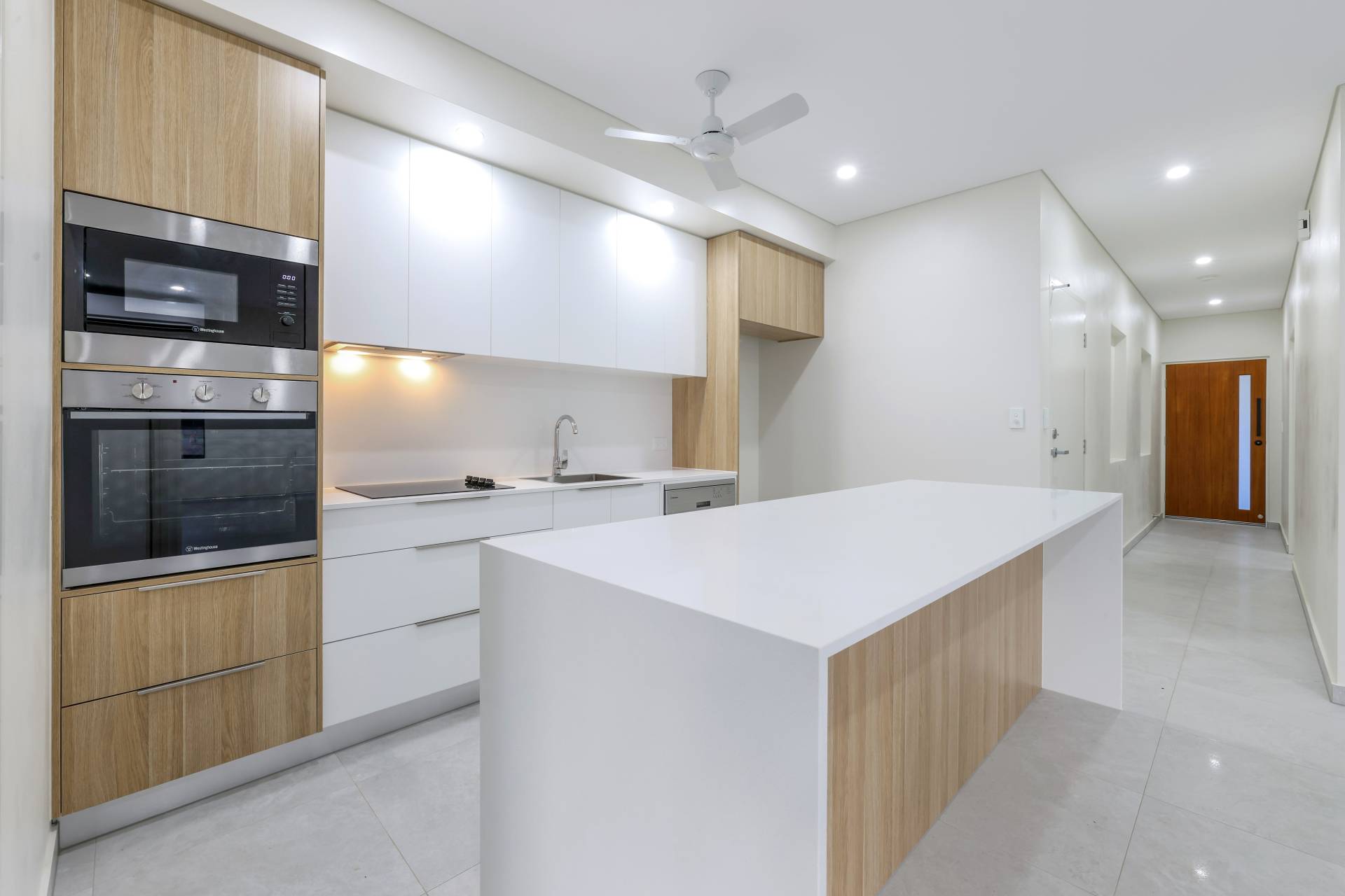 The kitchen gets the chefs kiss – offering a walk in pantry with generous storage capacity along with stone topped island bench with breakfast bar seating and overhead storage space, built in bins, pull out soft close draws and finished in warm earthy tones contrasting off the timeless white aesthetic.