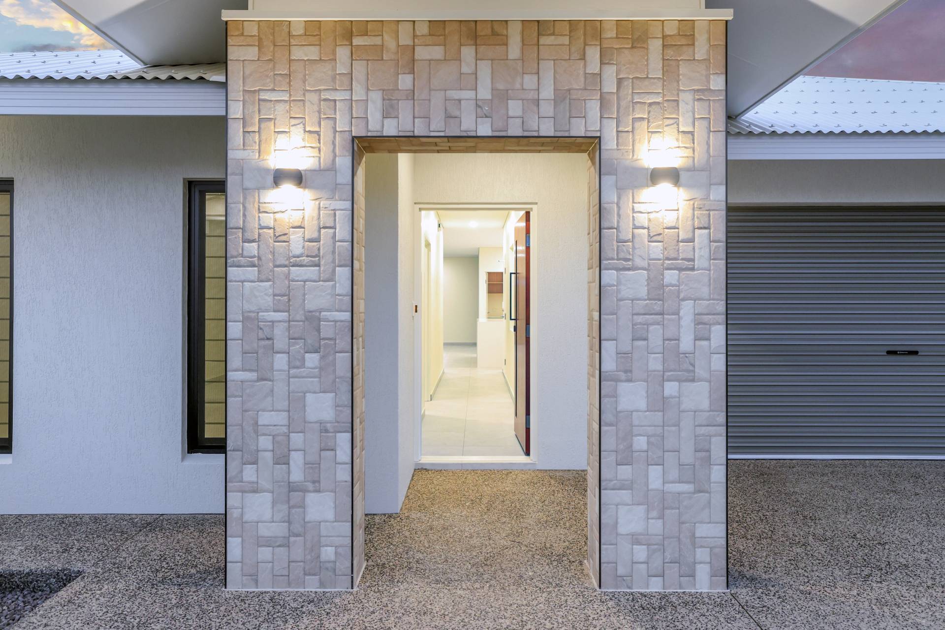 The home stands proud at the street with an impressive façade lit up with decorative lighting over the arched entry way framing the front door. There is dual garage parking with side gated entry to the yard space. Inside the front door is the entryway leading through to the living areas bypassing dual inset display areas in the hallway. The open plan living and dining areas and light filled and perfect for easy everyday living. Tri banks of sliding doors at the far end open onto the verandah for a seamless flow between the indoors and out.