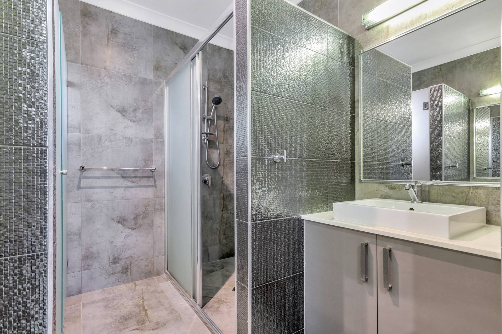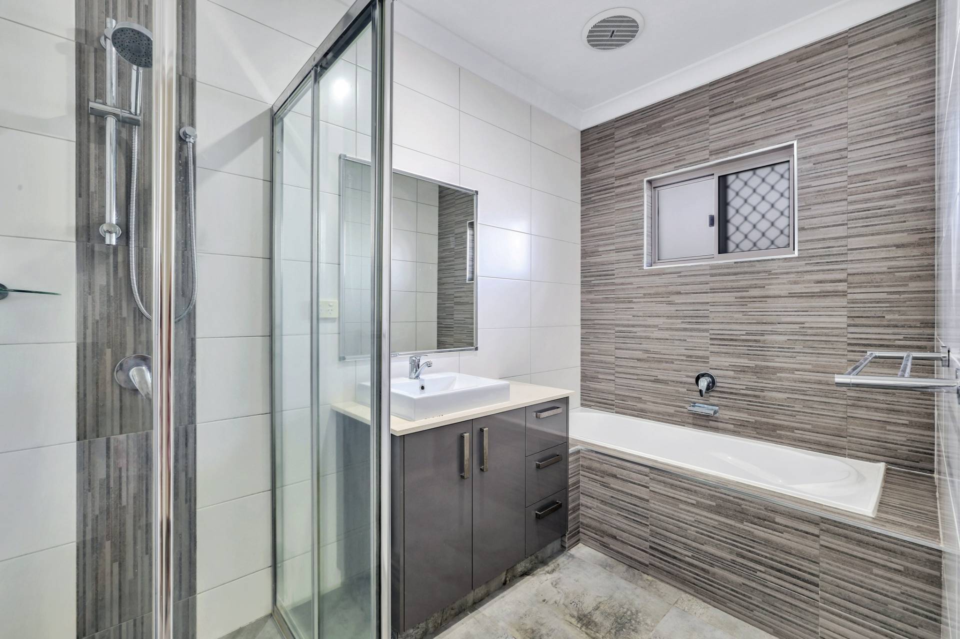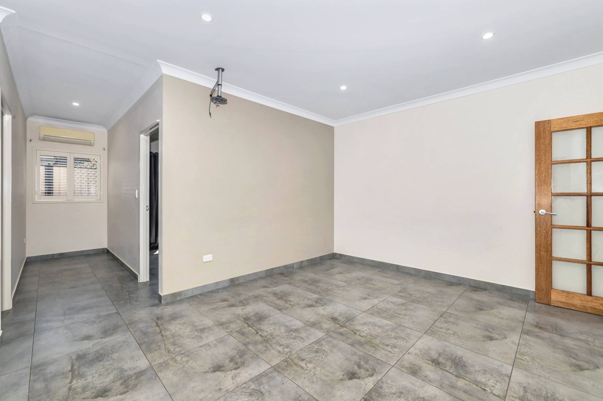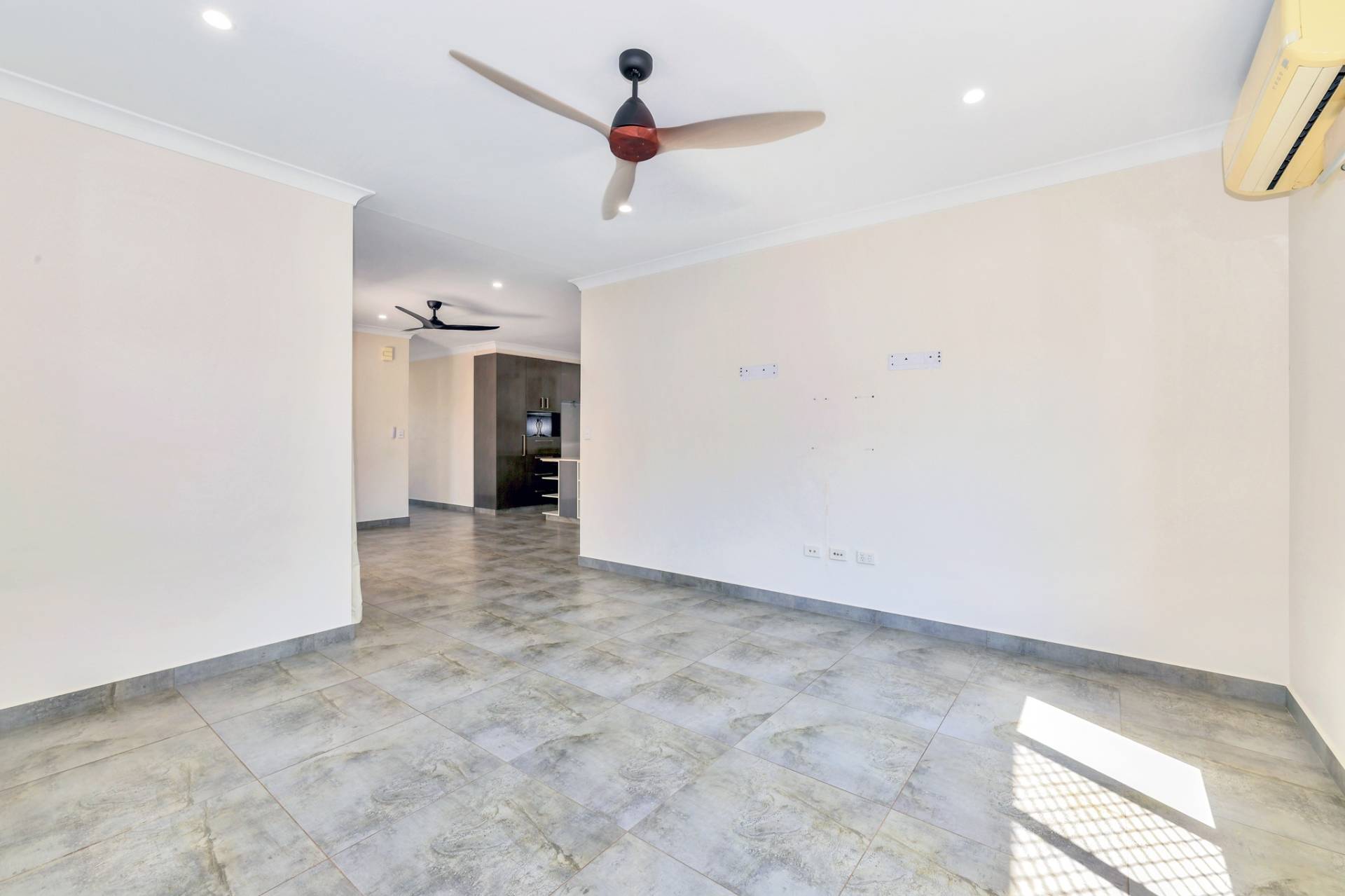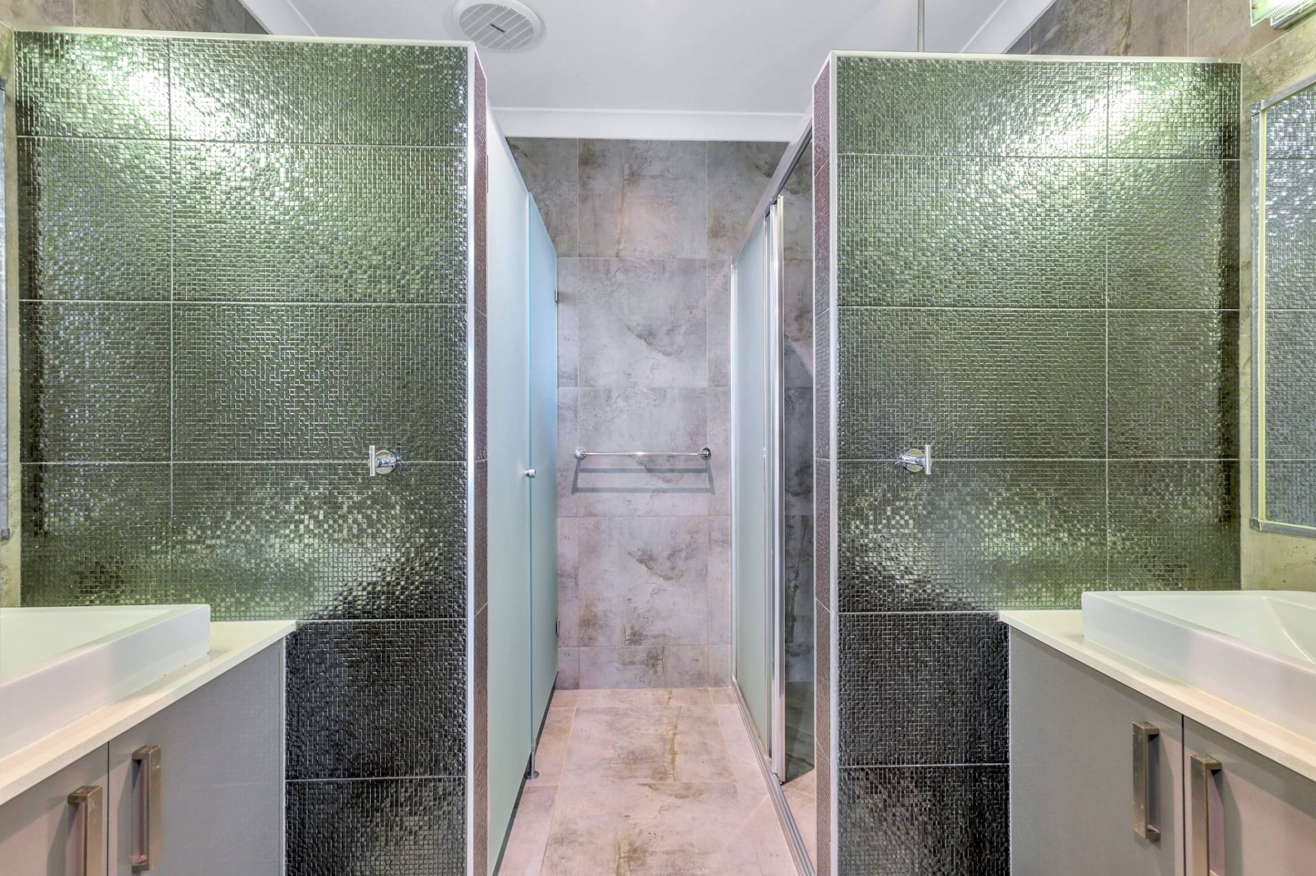 There is a front facing master bedroom suite with generous proportions along with an overhead built in shelve and a walk in robe plus an impressive ensuite with his and hers vanity, glass framed shower and privacy screen over the toilet.  A door separates the kids quarters where there are 3 bedrooms each complimented with a built in robe and A/C plus a central living room with a nook for the study area. The main bathroom resides in this space with a bath tub and shower, central vanity and sep toilet.