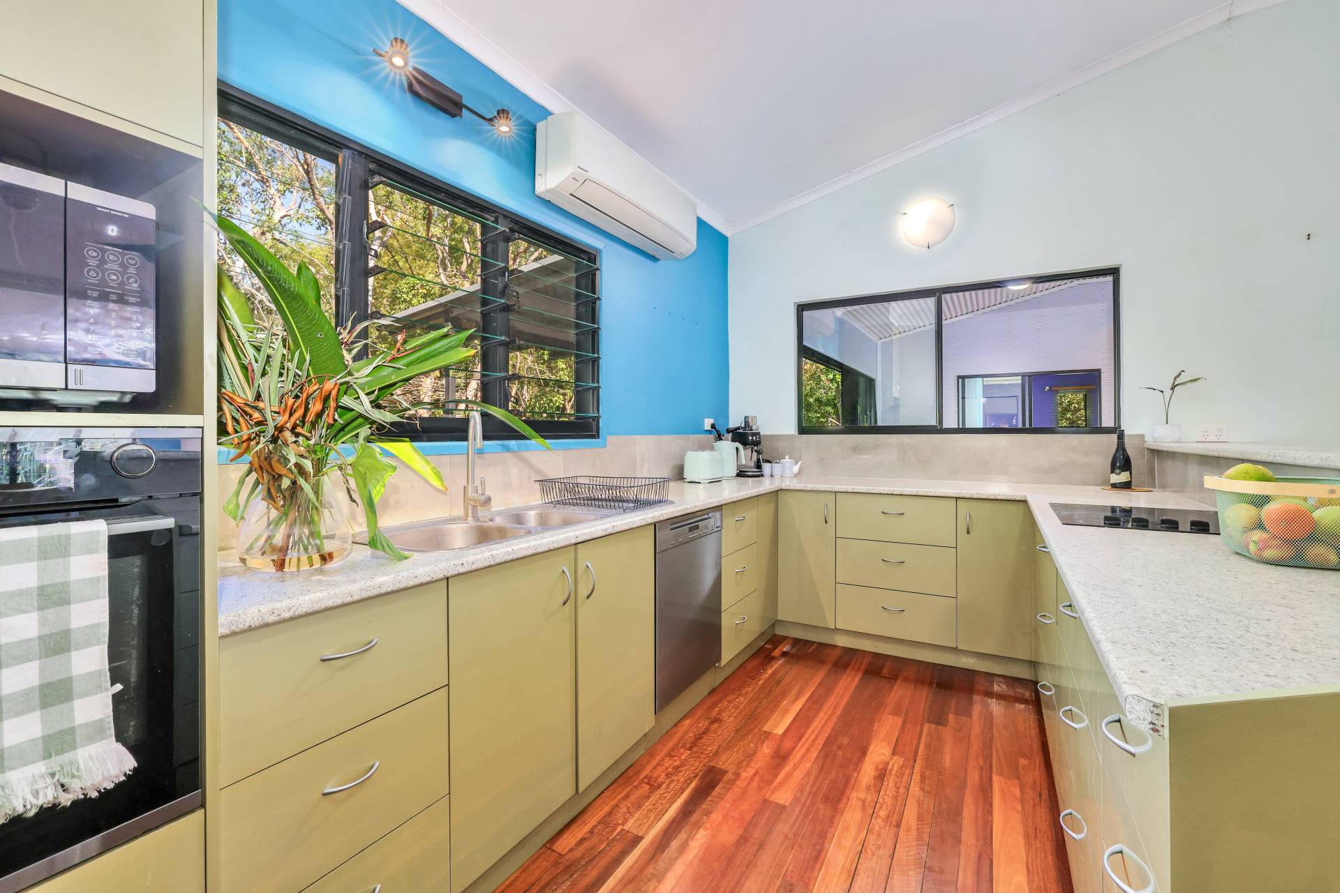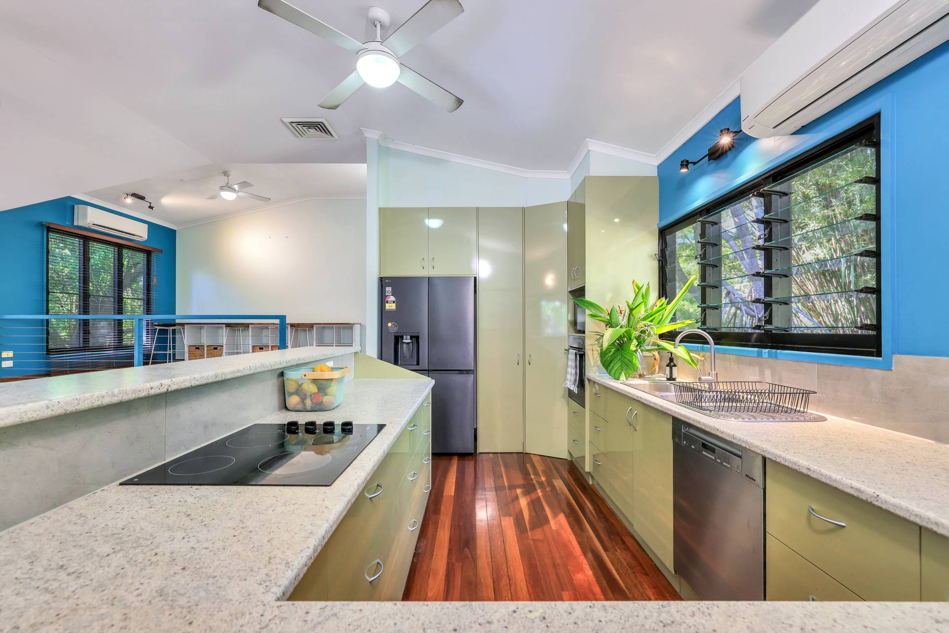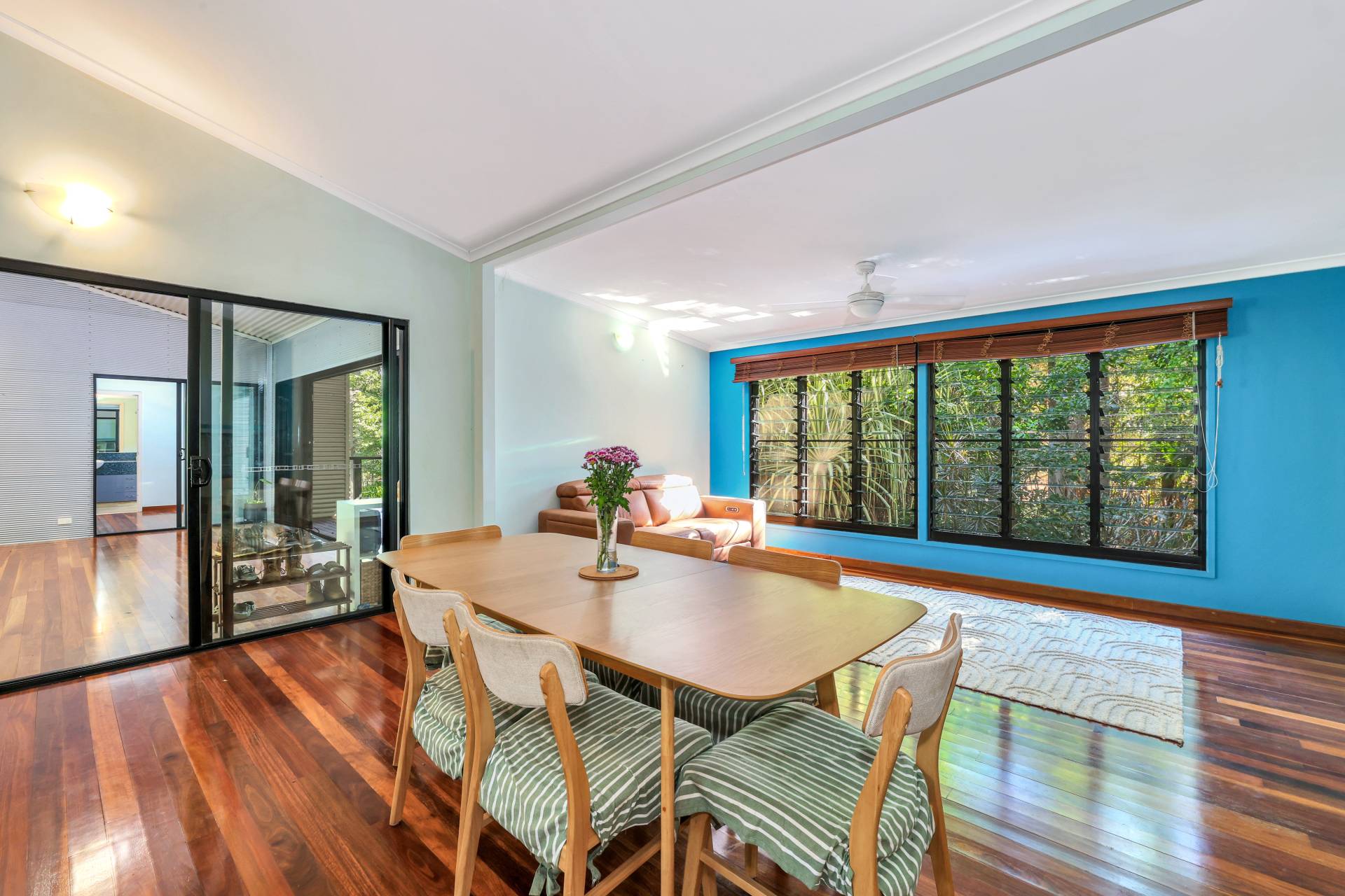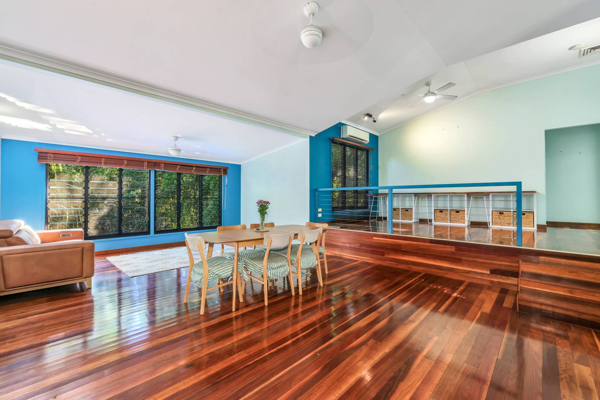 Upstairs, polished Spotted Gum timber floors and an abundance of natural light create a warm, inviting feel. The open-plan living and dining area flows seamlessly to a breezeway that connects the front and rear balconies, perfect for enjoying the leafy views. The modern kitchen is well-appointed with quality appliances and ample storage.