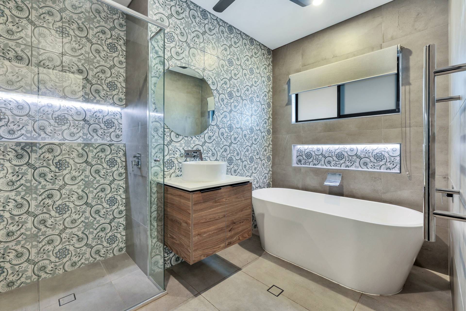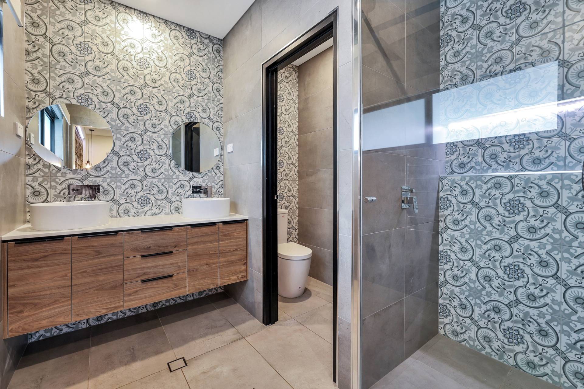 Retreat into the master suite, complete with twin vanities, stone countertops, and walk‑in robe. A separate media room—offers flexible living space. The main bathroom includes a luxurious bathtub, separate shower, and a separate WC.