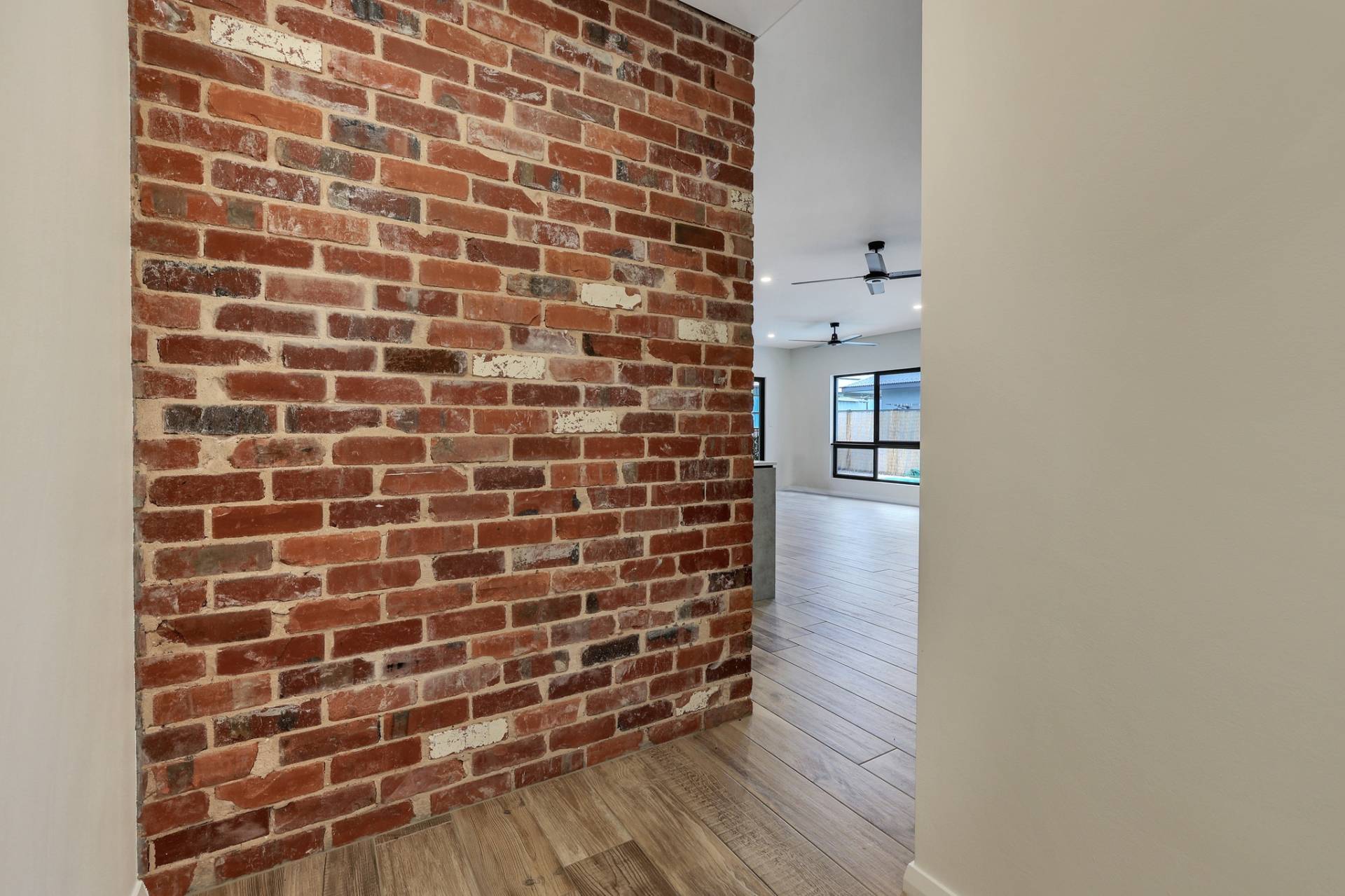 * Oversized front door leads through to a foyer to greet guests, featuring exposed red brick wall.