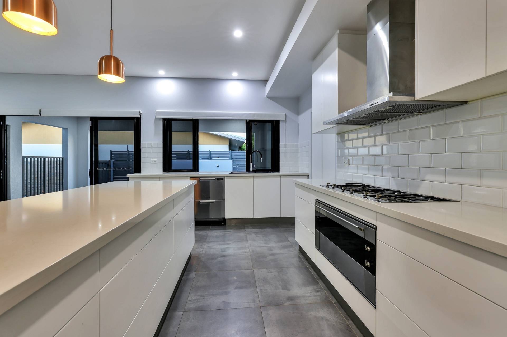 A chef’s dream with stone benchtops, feature pendant lighting, top-end appliances including a double-drawer dishwasher, gas cooktop, and expansive walk-in pantry. The servery window opens directly to the outdoor patio — perfect for entertaining.