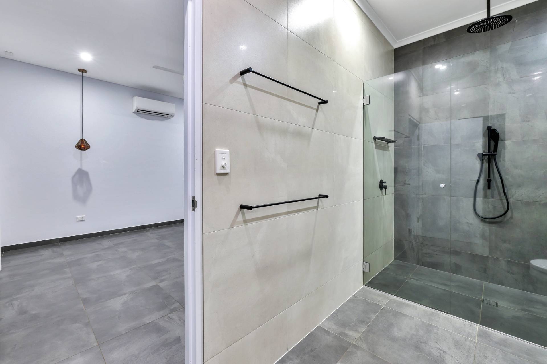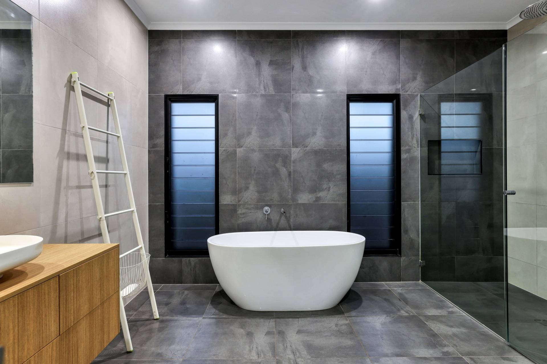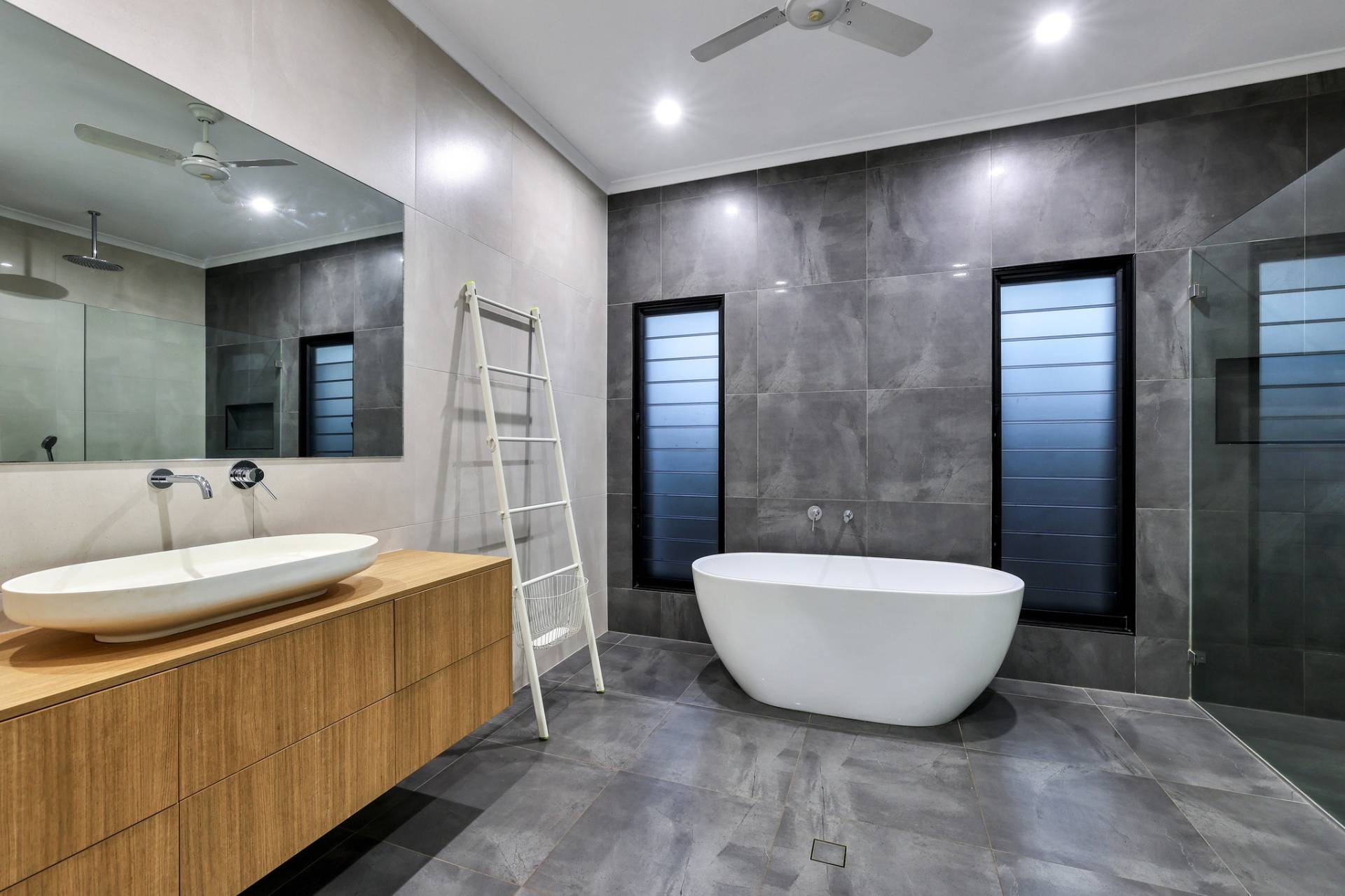 Luxurious freestanding bathtub, double-size walk-in shower, large mirror, floating timber vanity, and sleek tile finishes. A true retreat to relax and unwind.
