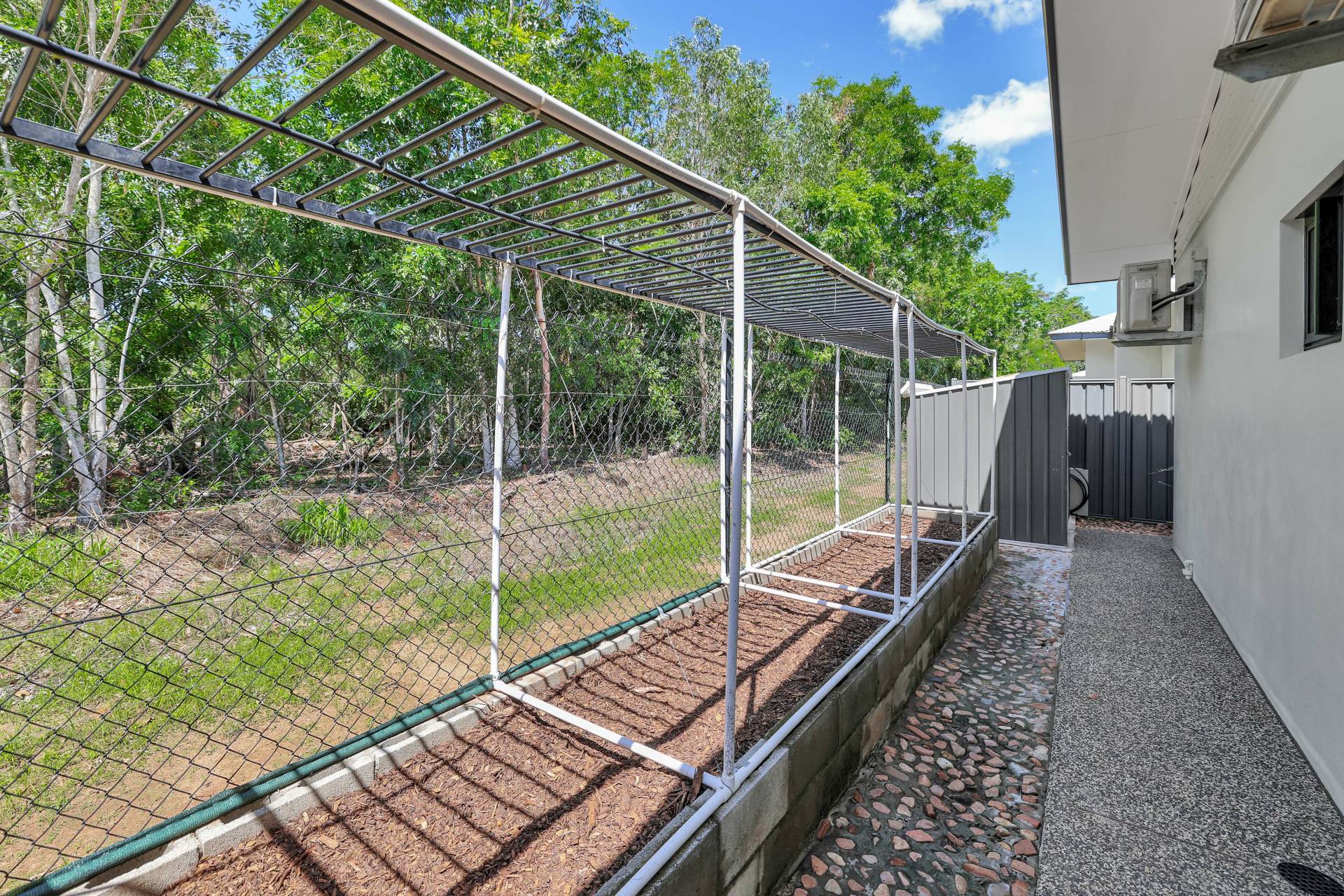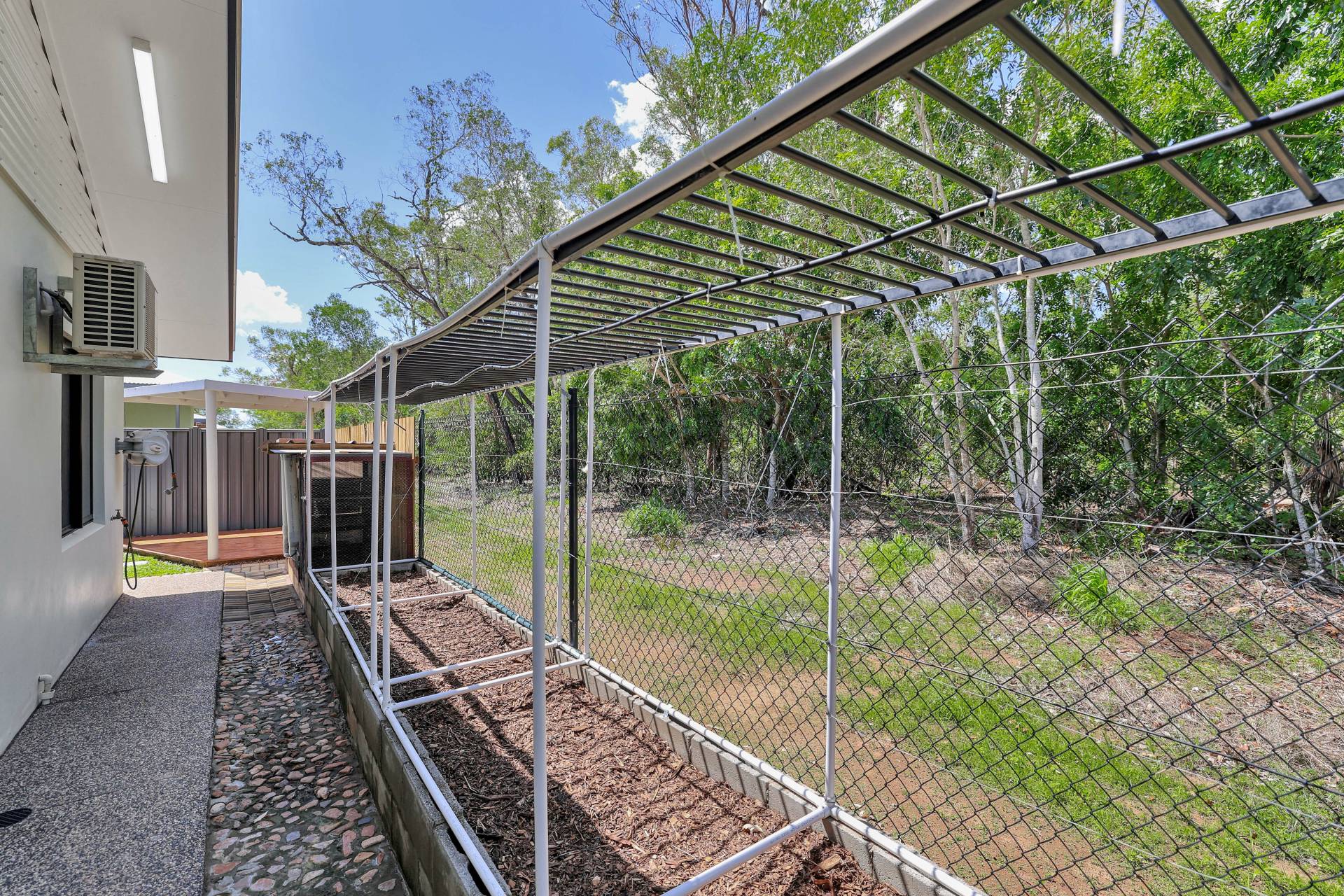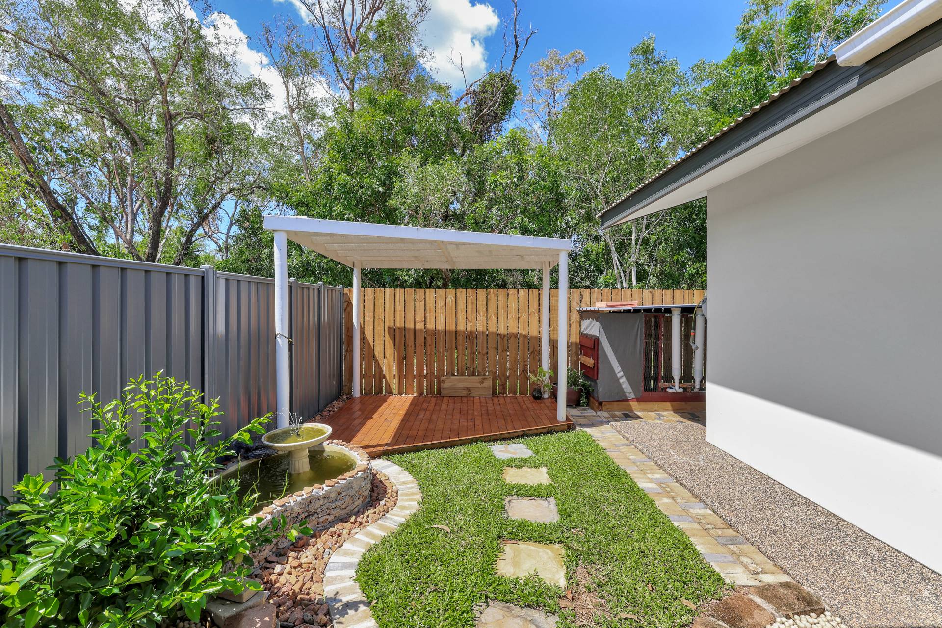 Double doors open directly from the kitchen to the outdoor entertaining area, where a side verandah provides an inviting space to relax or host guests. The backyard includes a gazebo, a small fish pond and stepping stones for a tranquil retreat. Practical additions include a chicken coop, veggie garden, garden shed and clothesline.