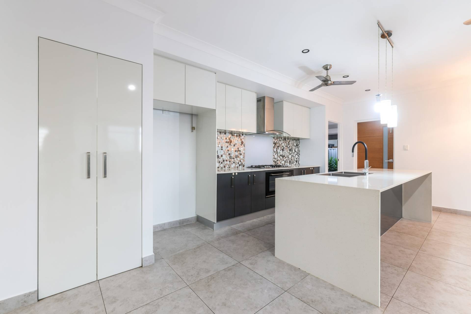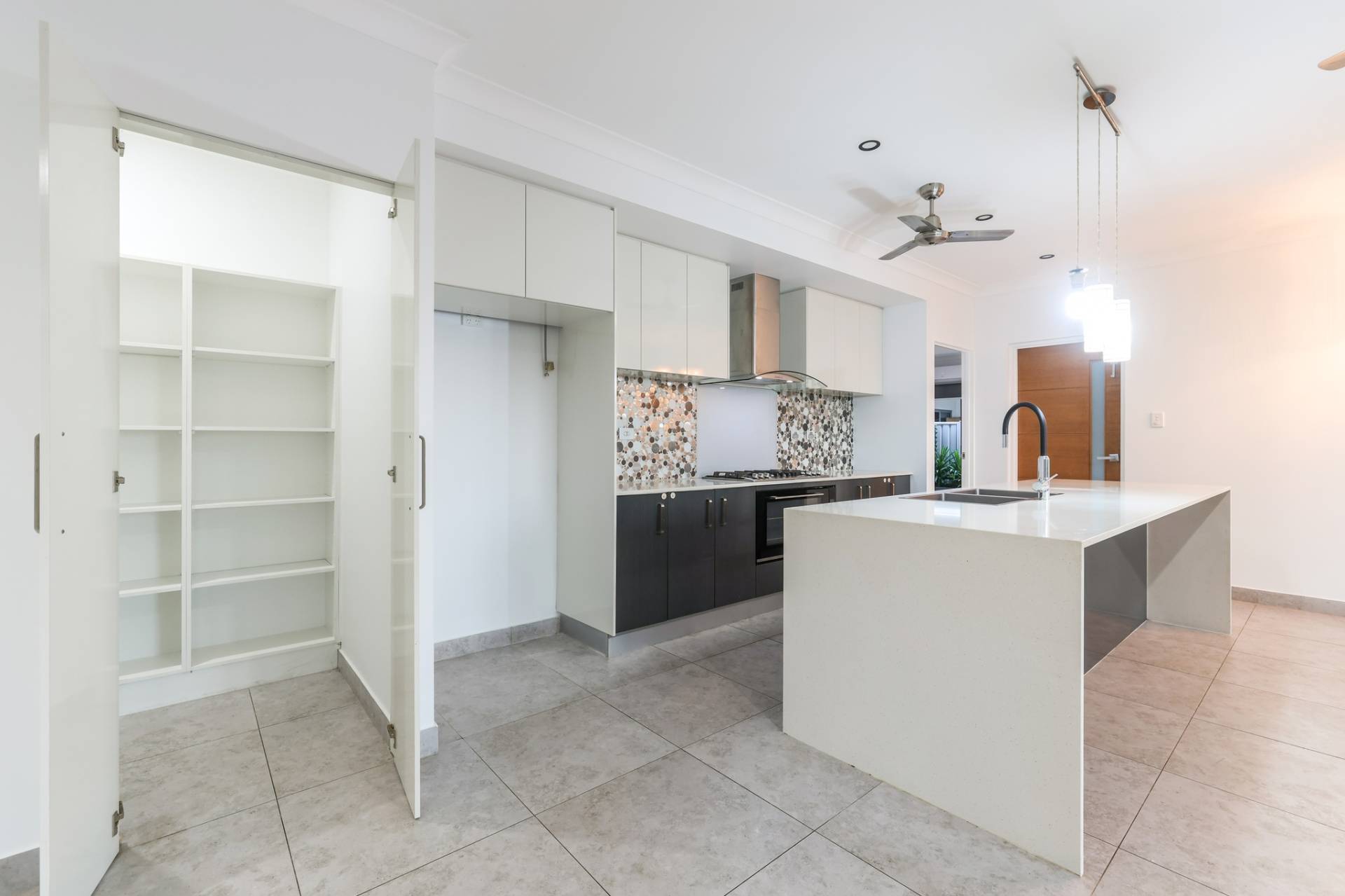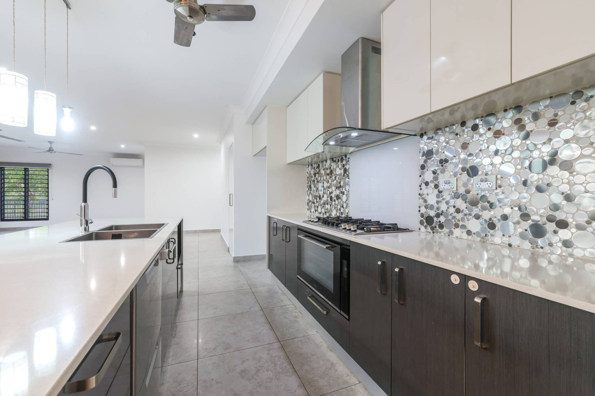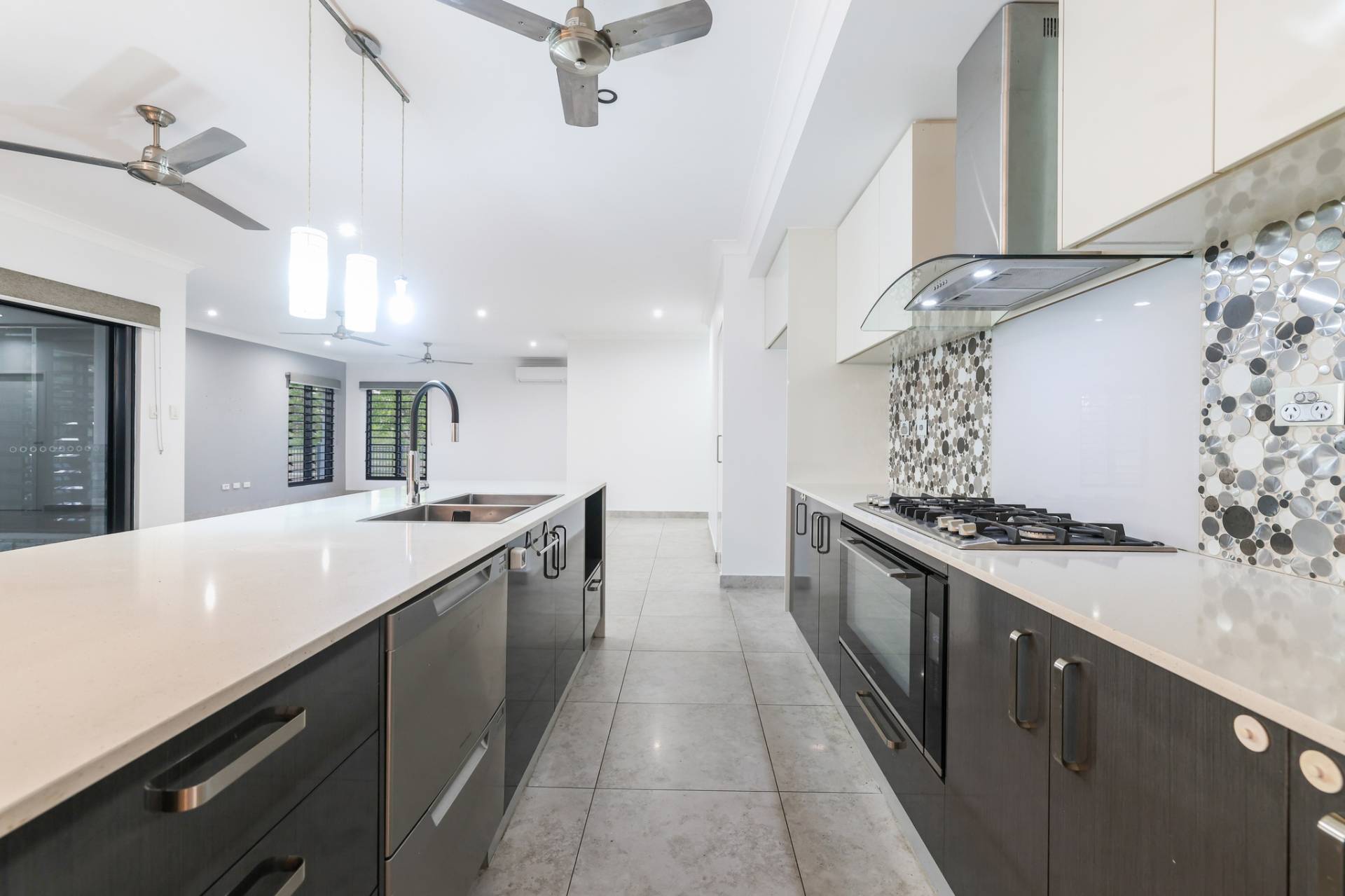 The solar powered home has electronic gated entry and access to a dual garage parking bay along with a formal front entry to the home with a pendant light and large front door. Inside is a generous open plan living, dining and kitchen area with tiled flooring and split A/C. the kitchen has a stone topped island bench and hidden walk in pantry along with a wall of built in storage space all finished in modern tones.