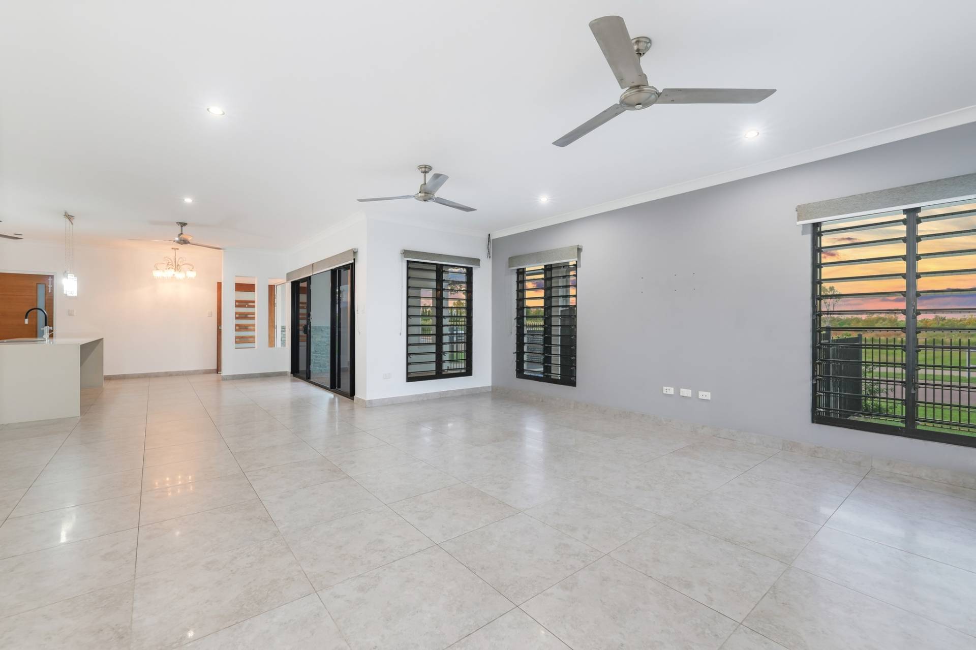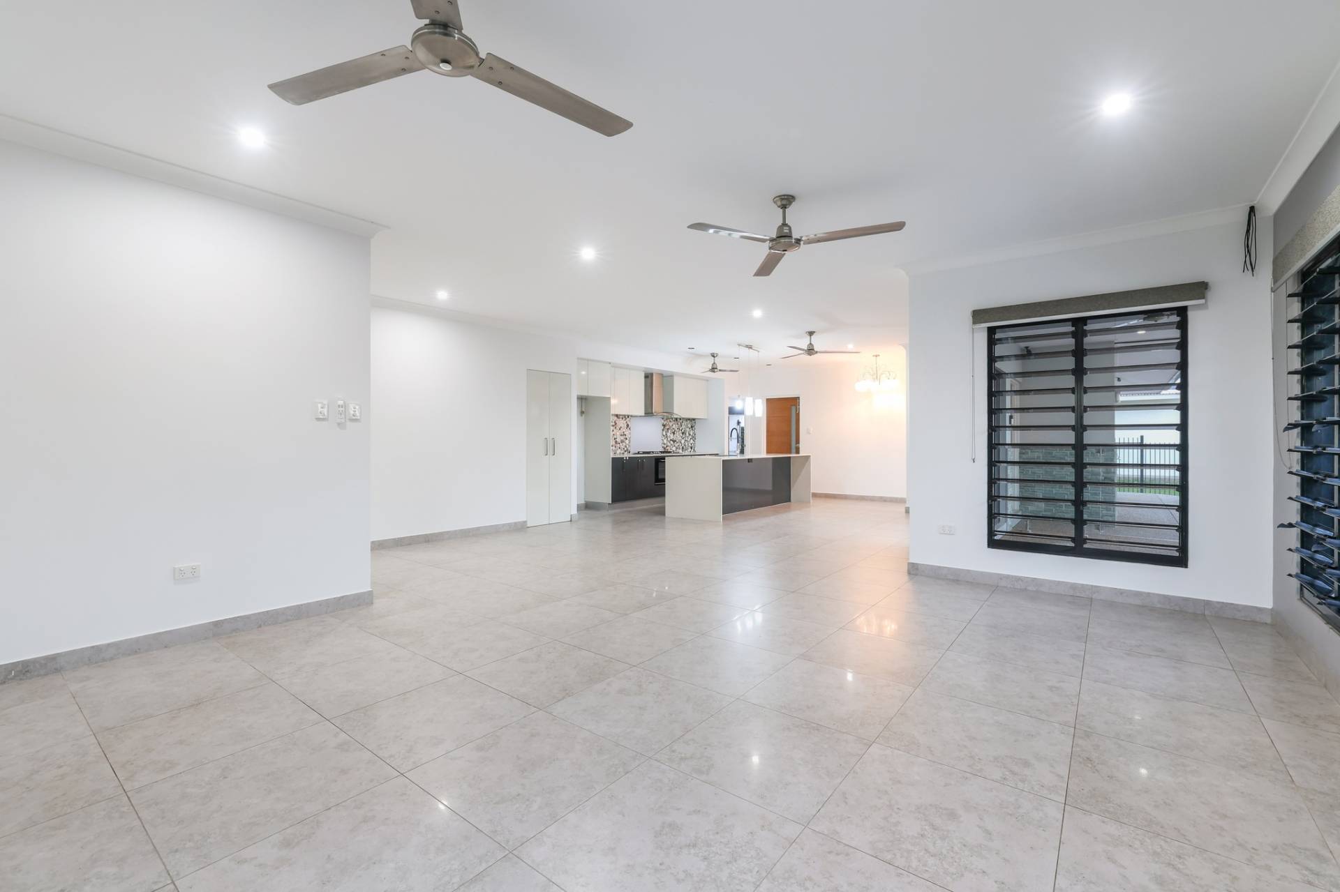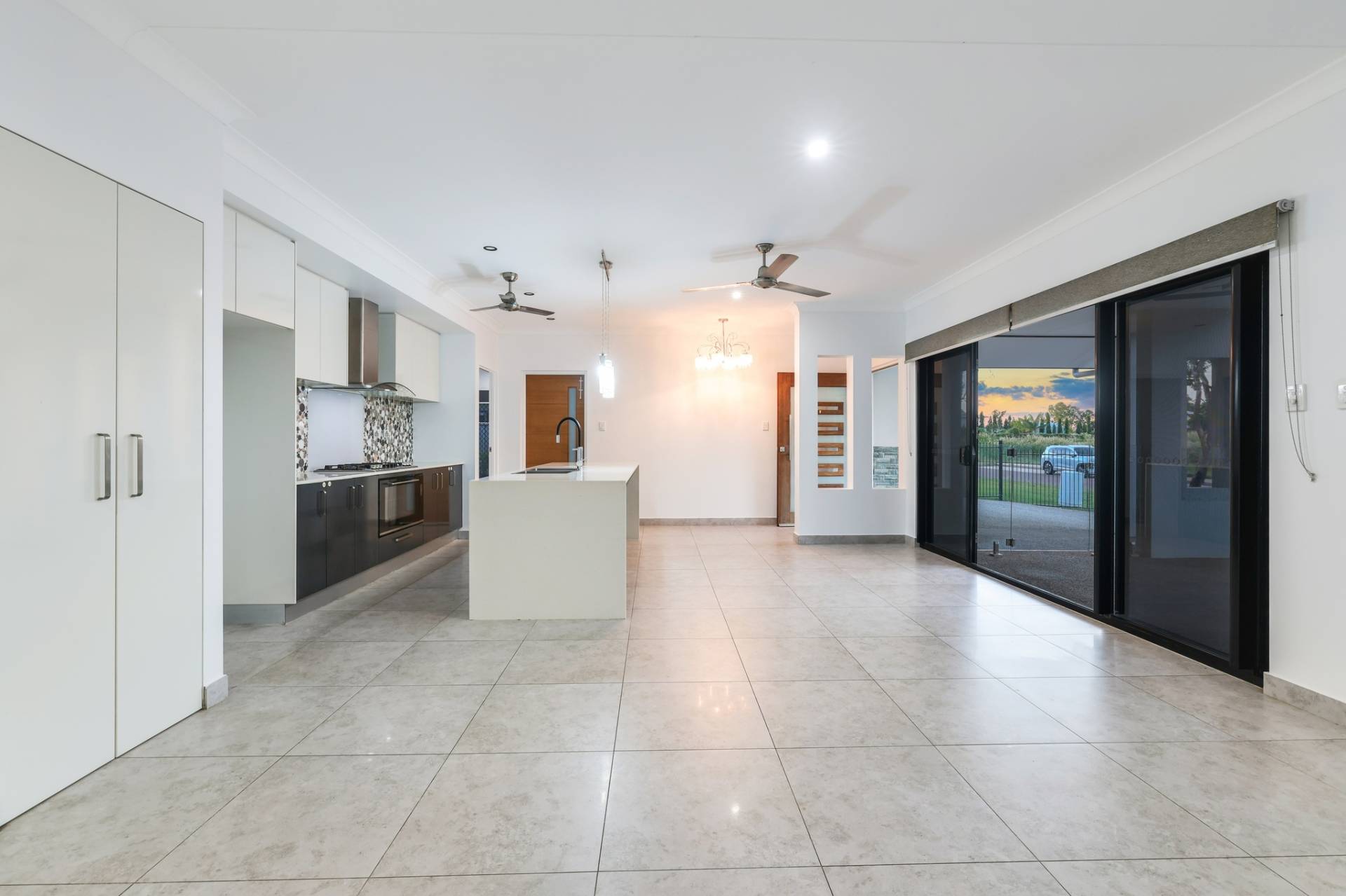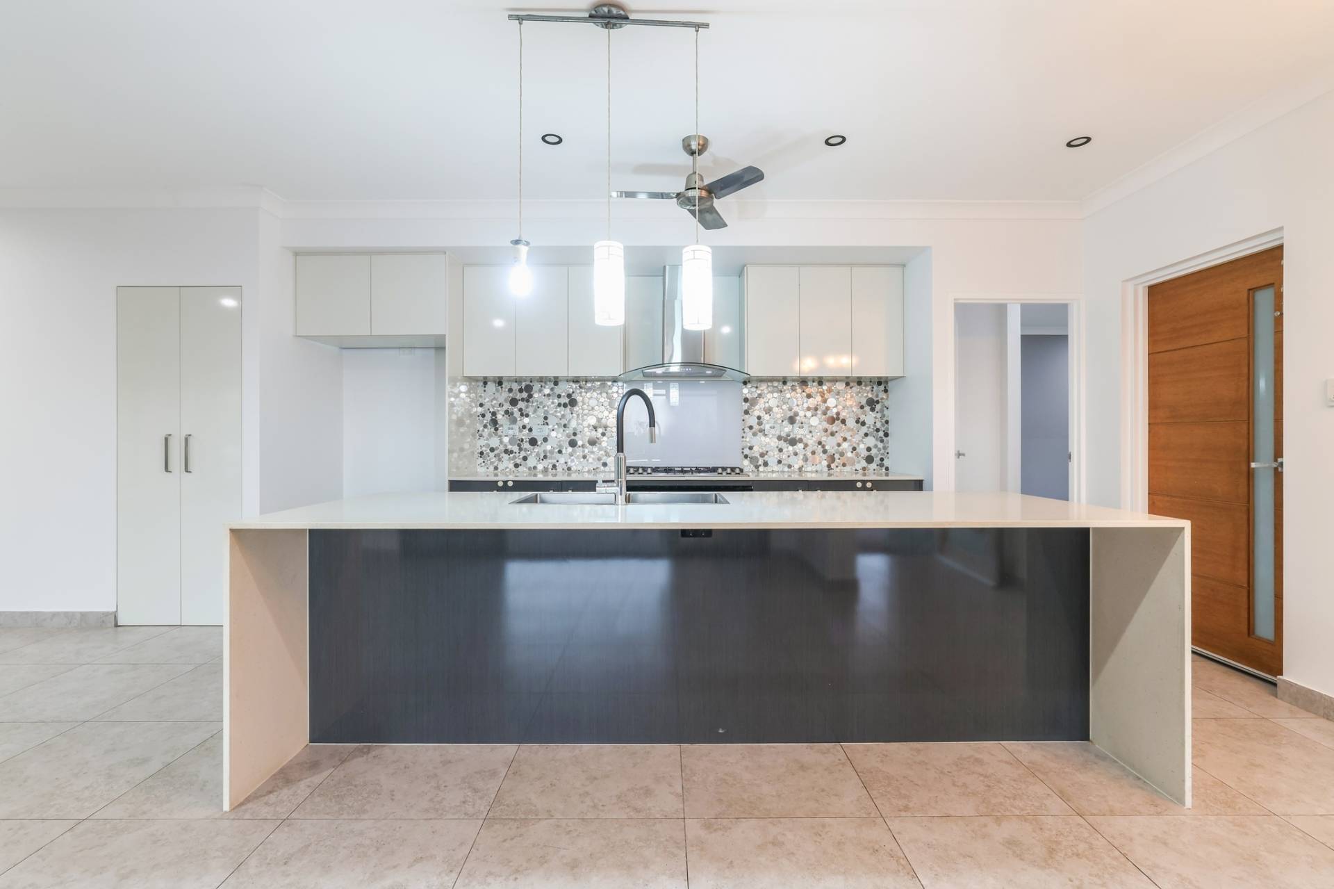 The solar powered home has electronic gated entry and access to a dual garage parking bay along with a formal front entry to the home with a pendant light and large front door. Inside is a generous open plan living, dining and kitchen area with tiled flooring and split A/C. the kitchen has a stone topped island bench and hidden walk in pantry along with a wall of built in storage space all finished in modern tones.