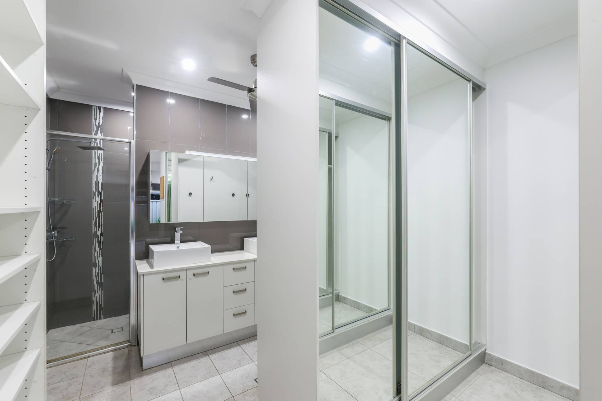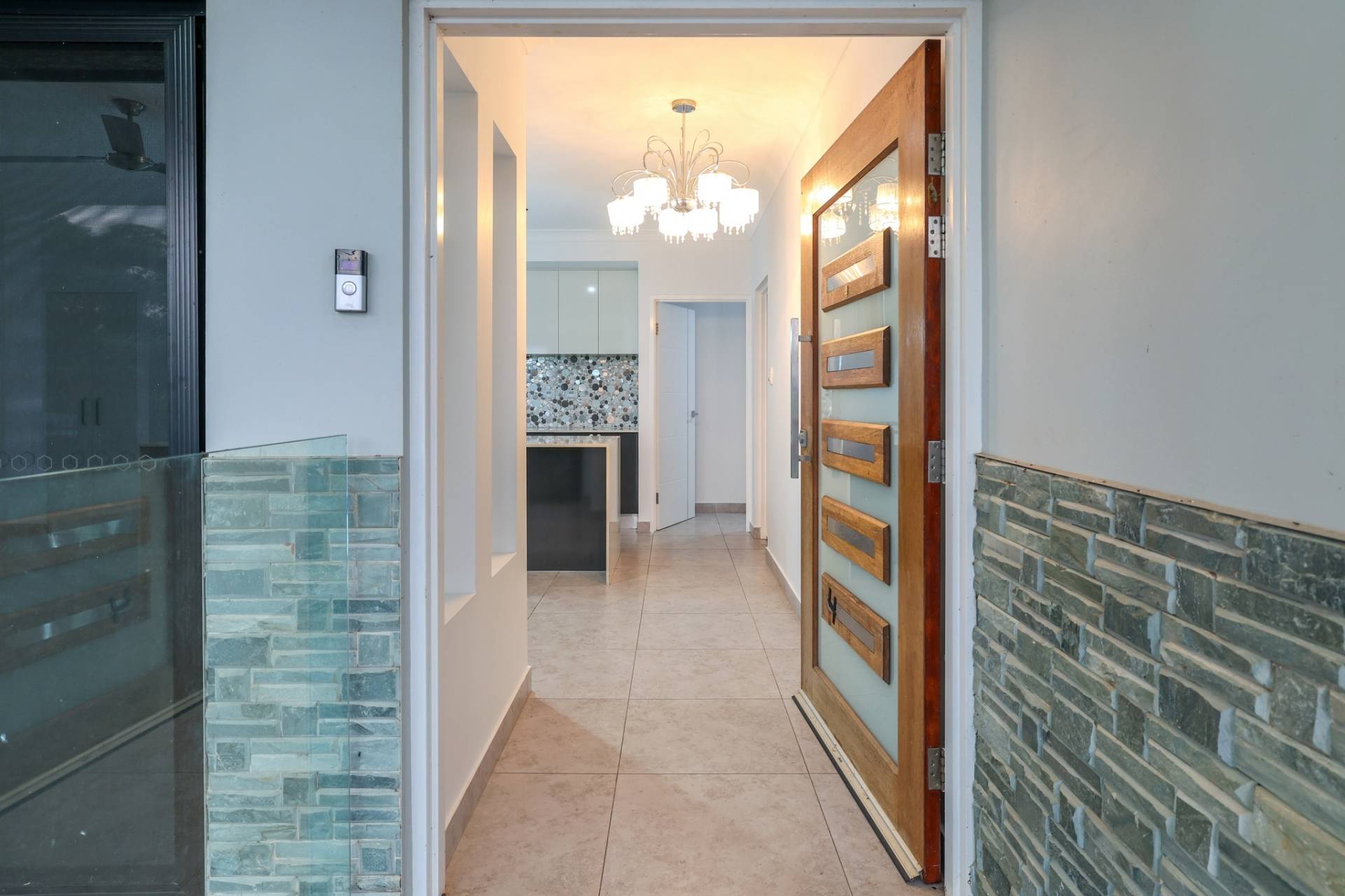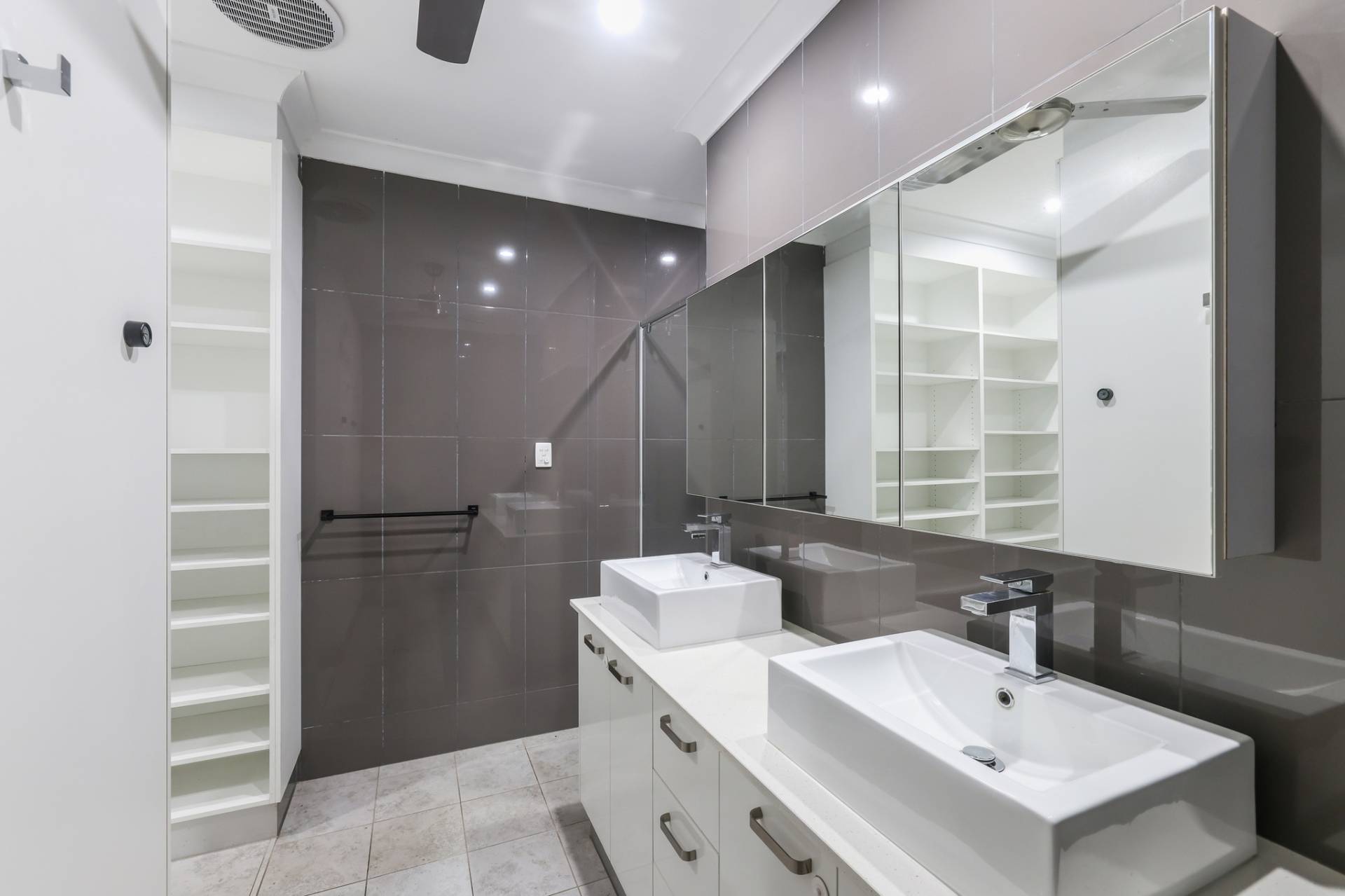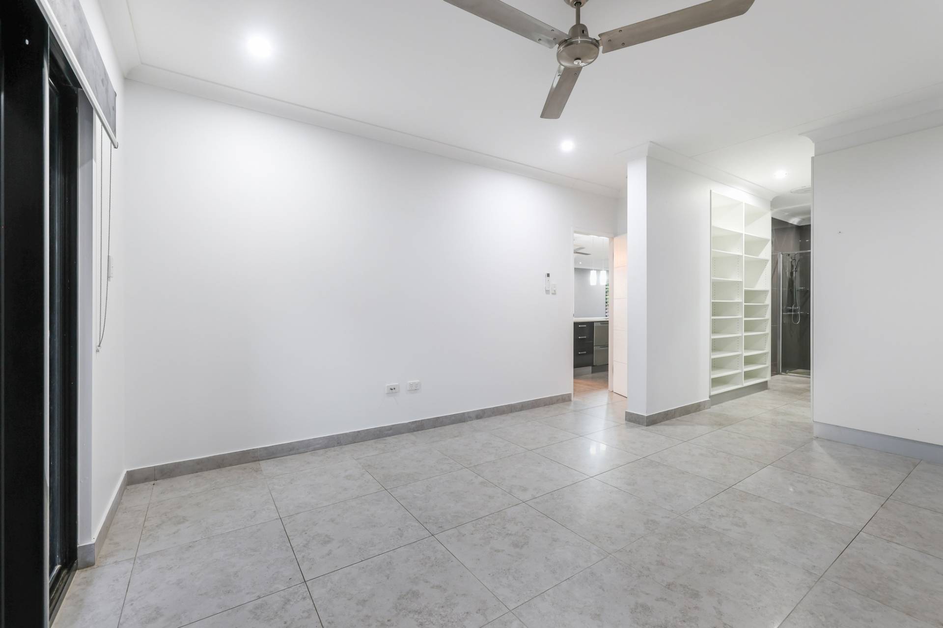 The solar powered home has electronic gated entry and access to a dual garage parking bay along with a formal front entry to the home with a pendant light and large front door. Inside is a generous open plan living, dining and kitchen area with tiled flooring and split A/C. the kitchen has a stone topped island bench and hidden walk in pantry along with a wall of built in storage space all finished in modern tones.