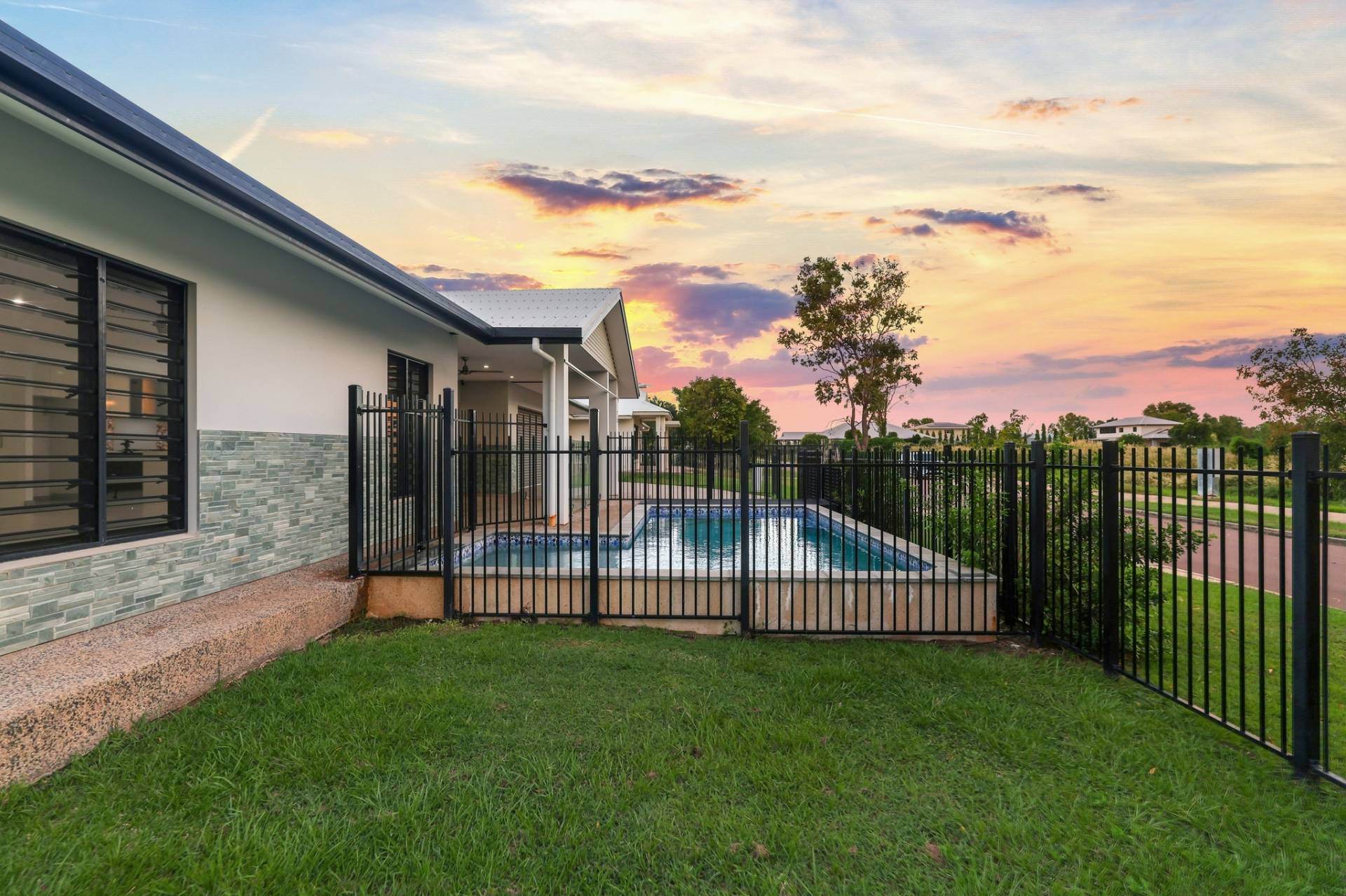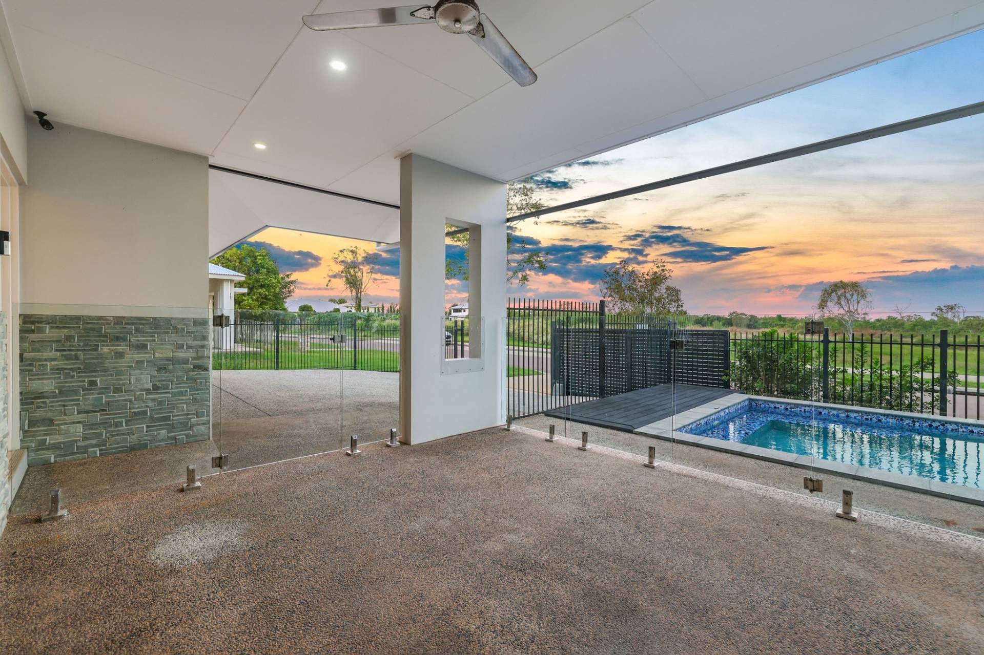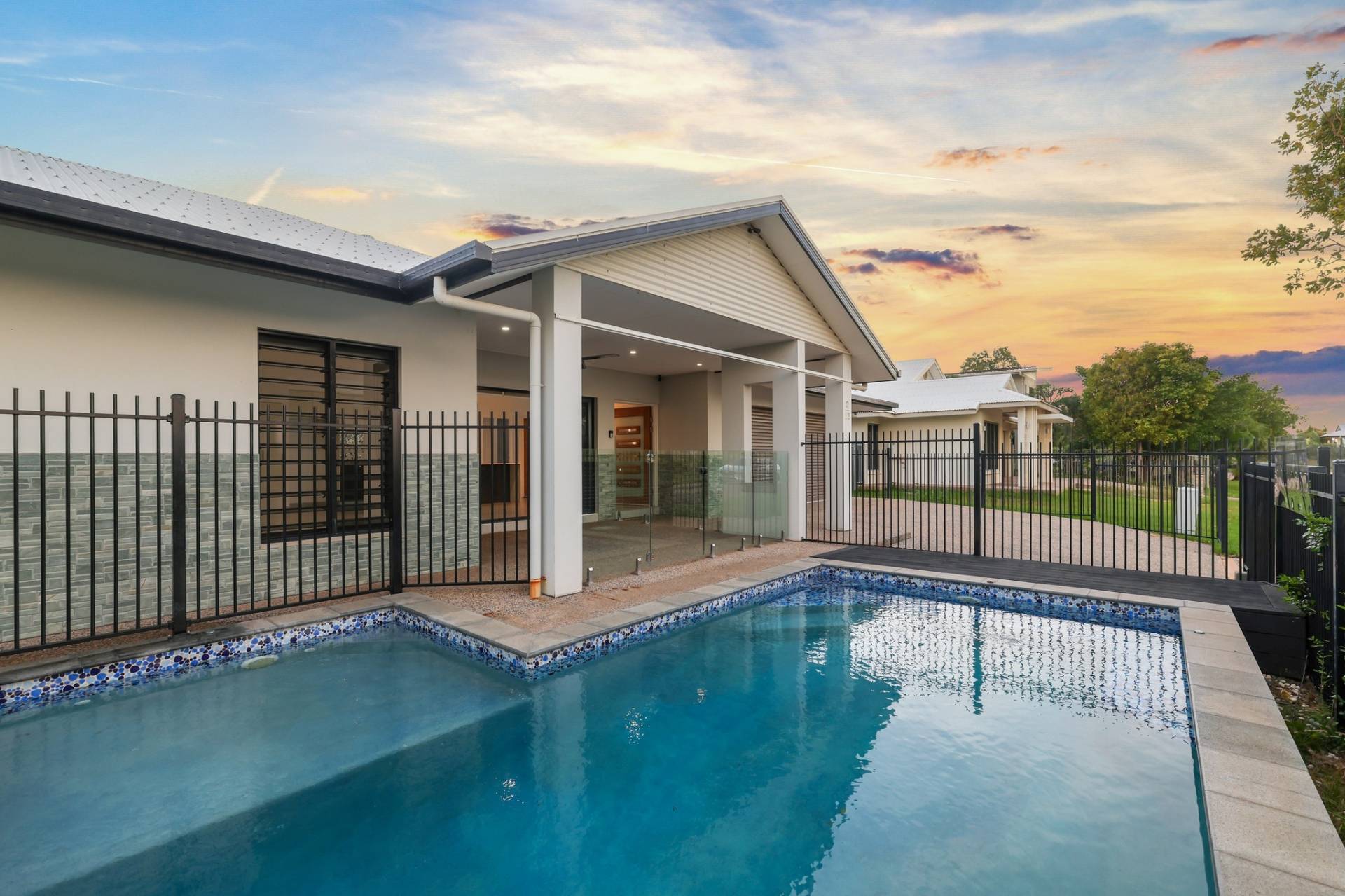 Double sliding doors connect the dining room to the outdoor entertaining areas with a sheltered front verandah that overlooks the glass framed swimming pool and easy care courtyard with grassy lawns and room for the kids and pets to play.