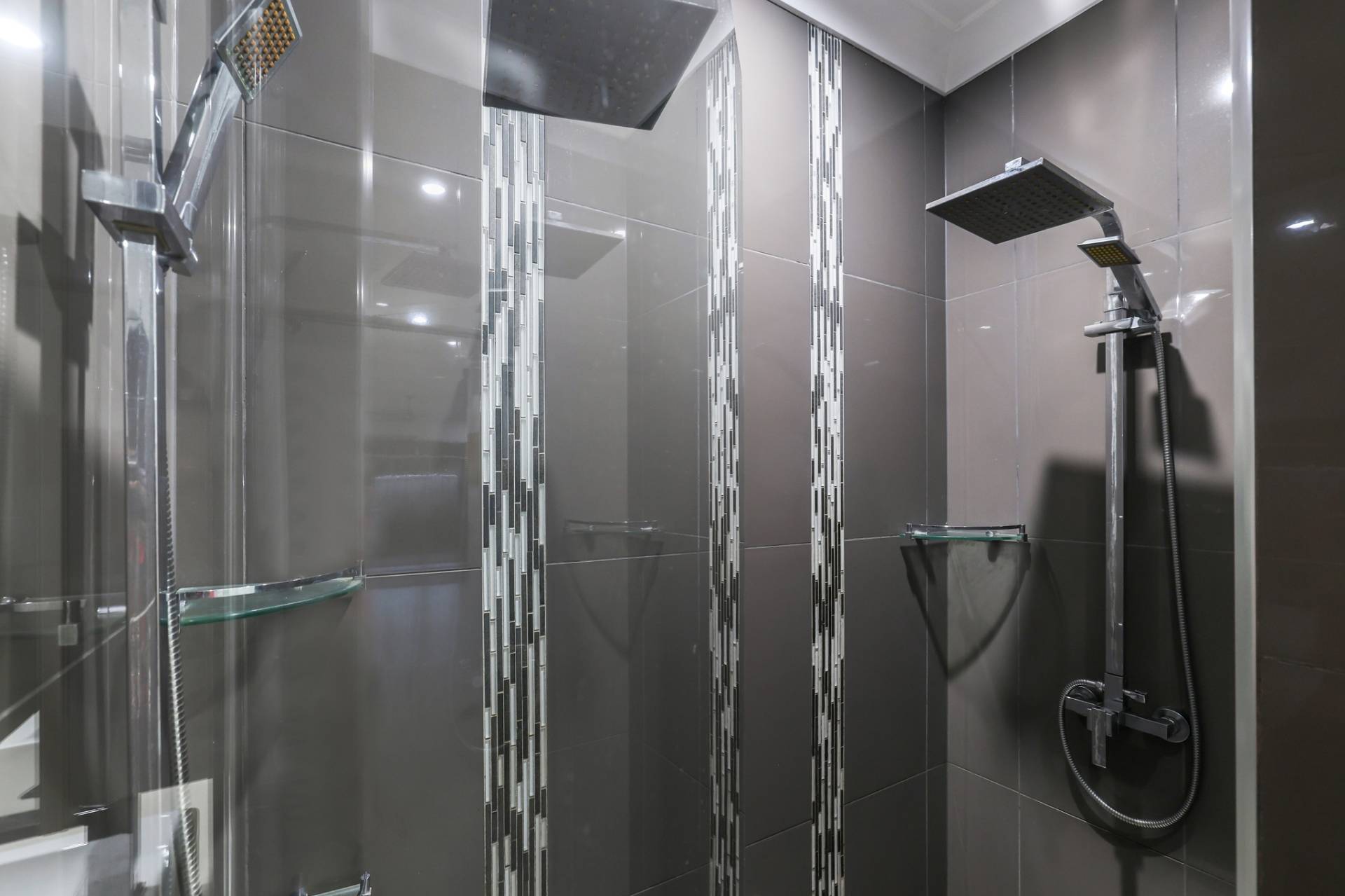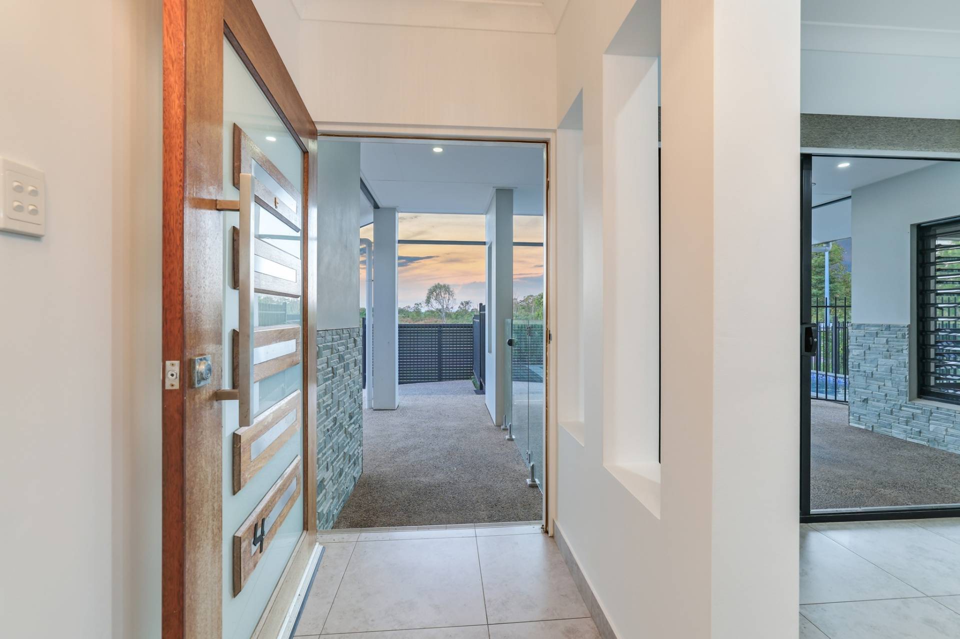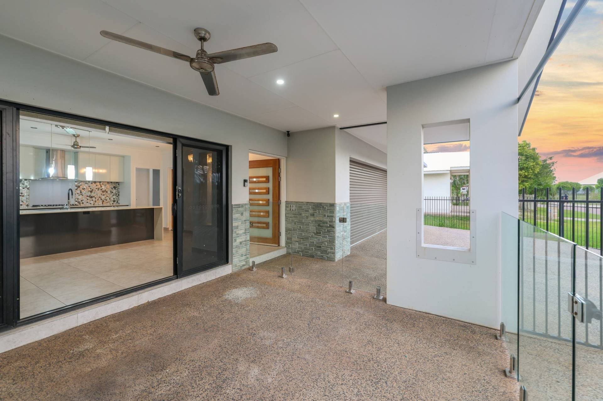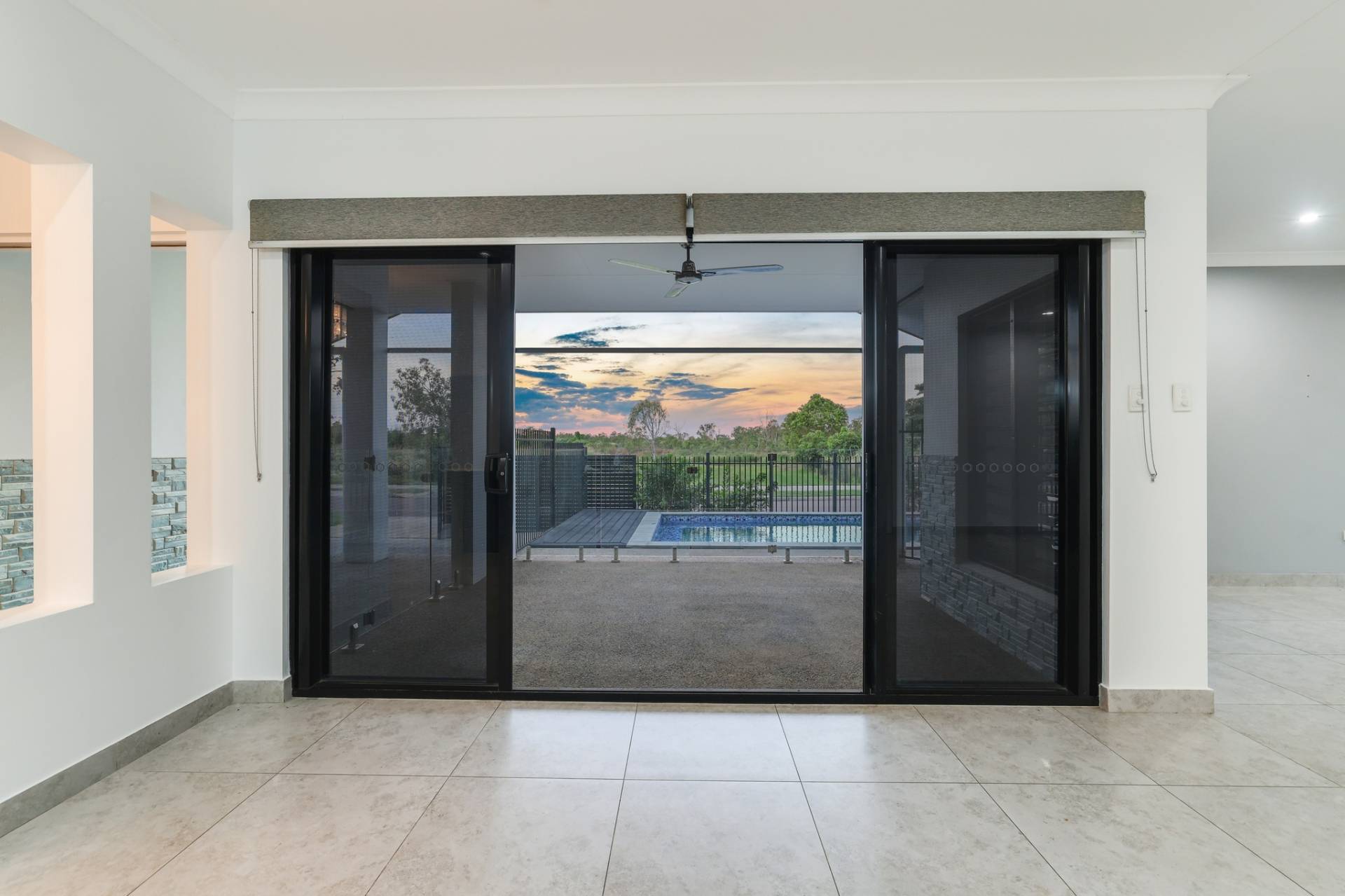 Double sliding doors connect the dining room to the outdoor entertaining areas with a sheltered front verandah that overlooks the glass framed swimming pool and easy care courtyard with grassy lawns and room for the kids and pets to play.