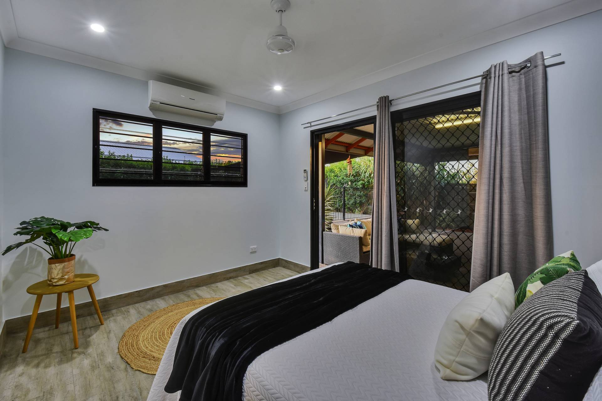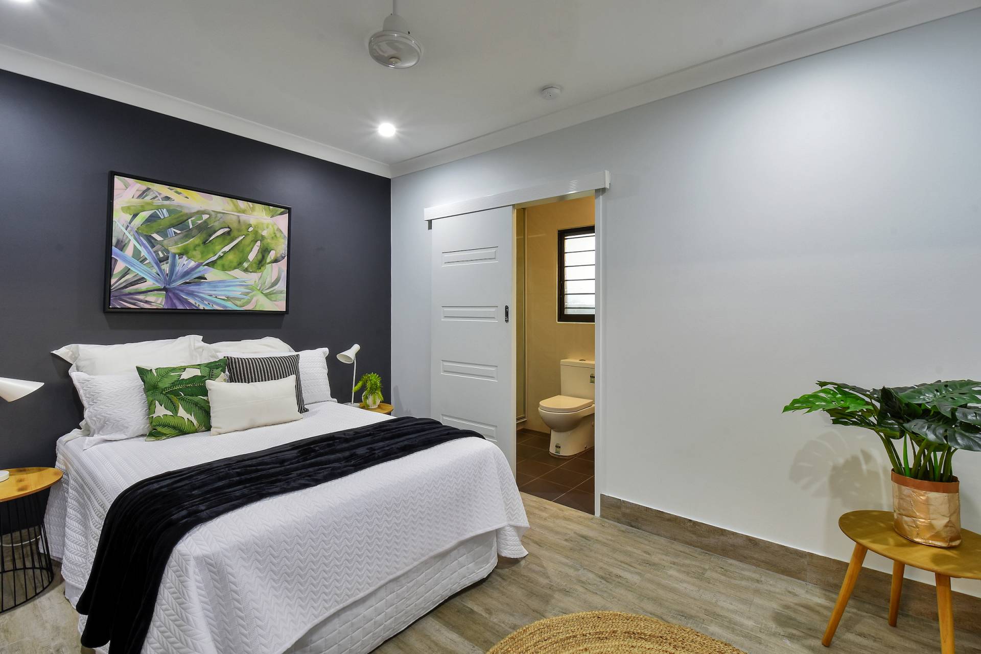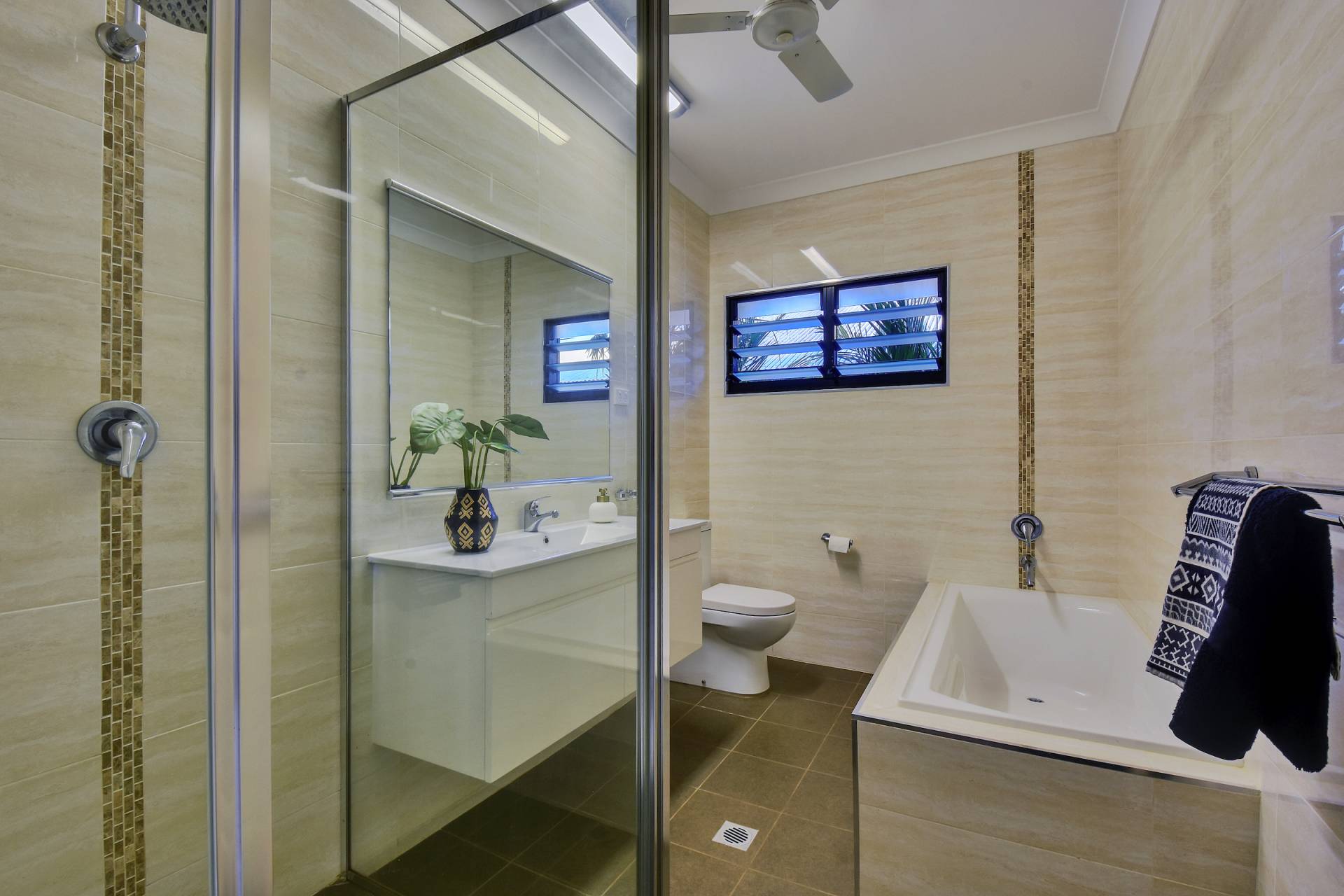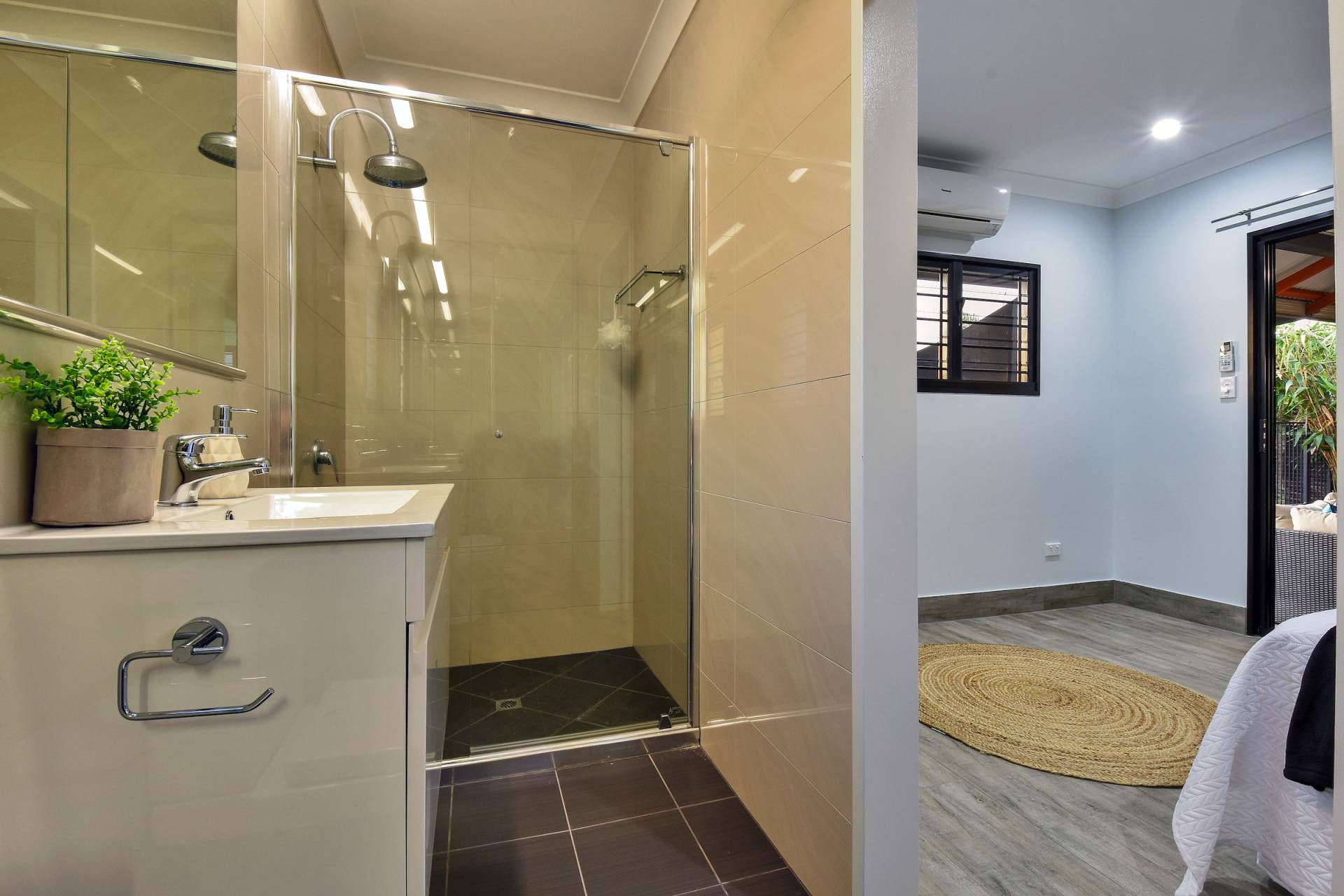 Three bedrooms reside at the front of the home and all include large sliding windows that overlook tropical leafy gardens, each has A/C and tiled flooring while the master suite is elevated with a hidden walk in ensuite behind twin built in robes.