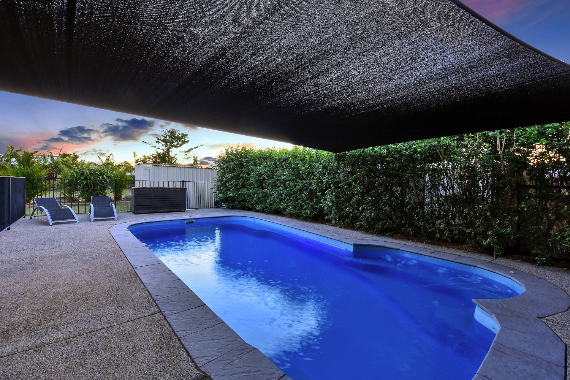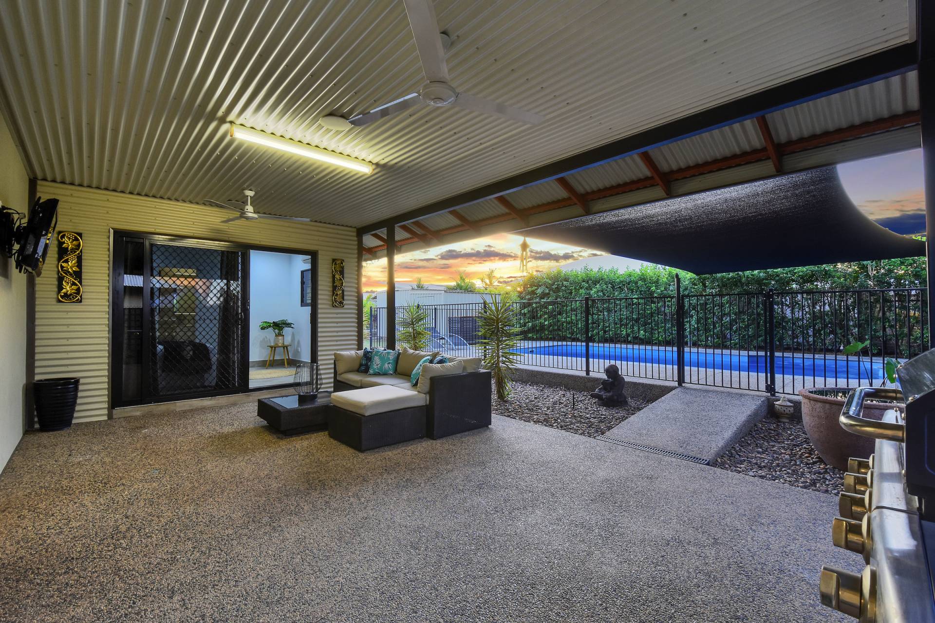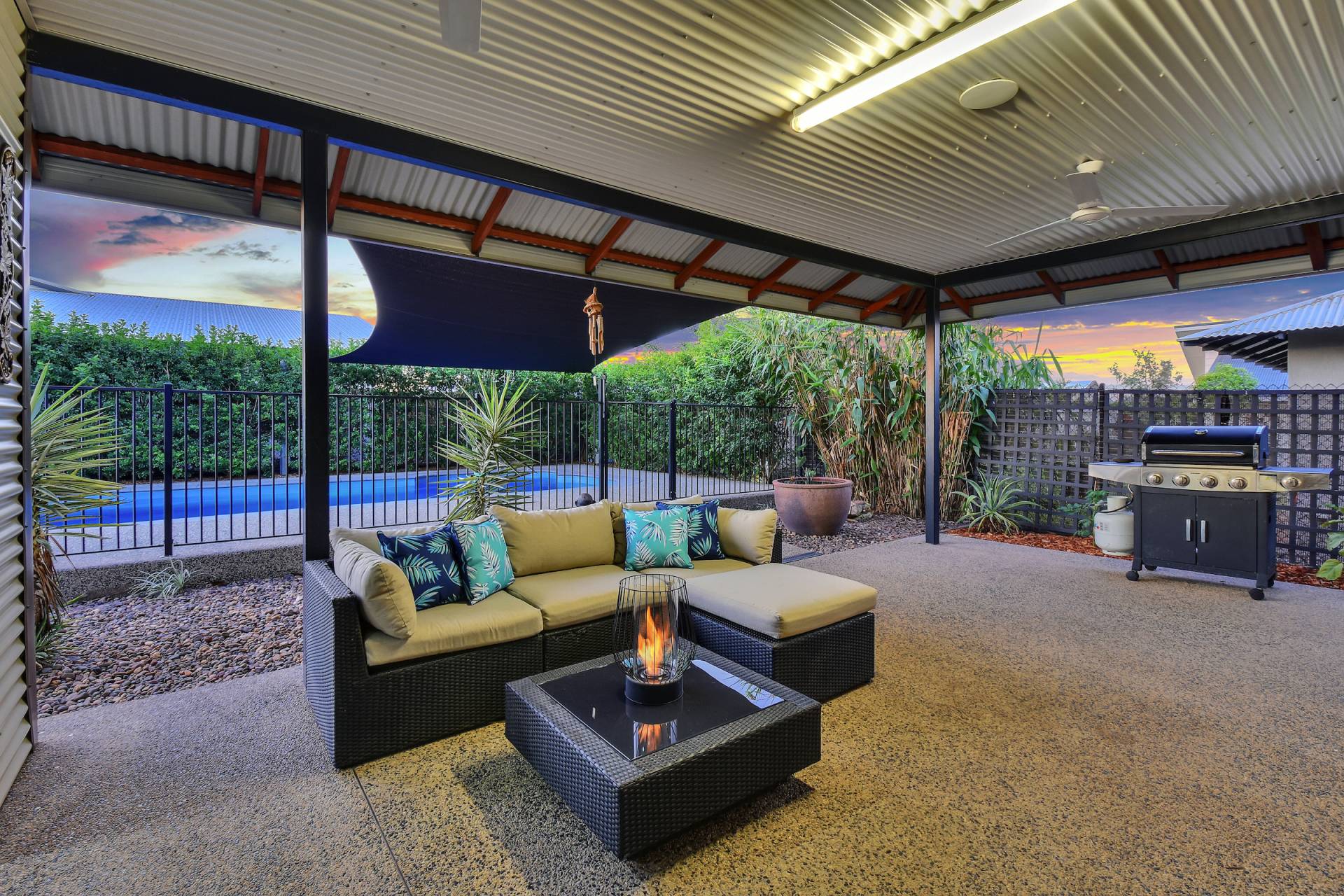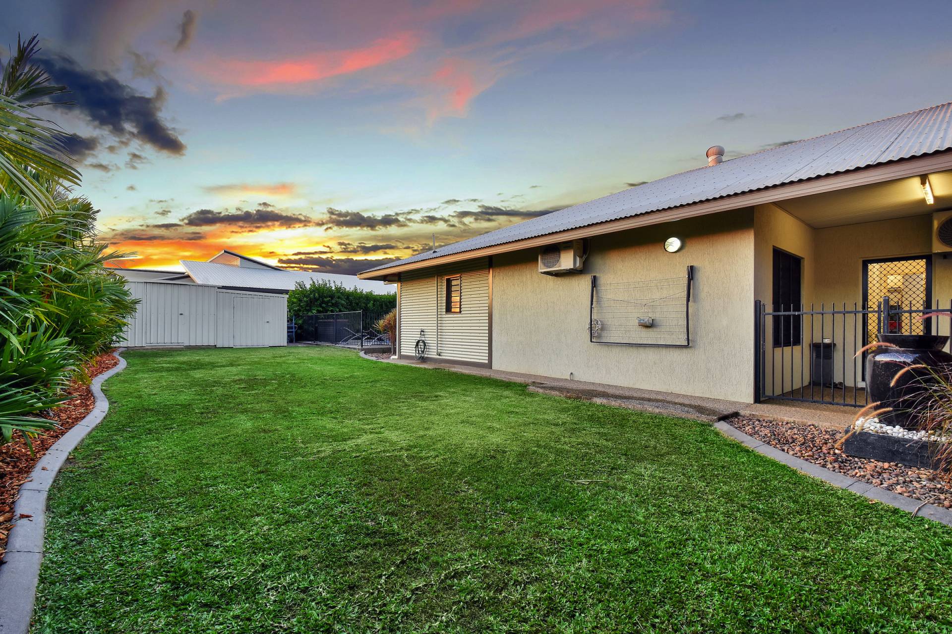 The kids and pets can play down the side of the home on rolling green lawn framed with leafy tropical palms that sway in the cool breezes and shield the yard space from the neighbours. A garden sheds with additional covered storage resides along the back boundary and offer plenty of space within.