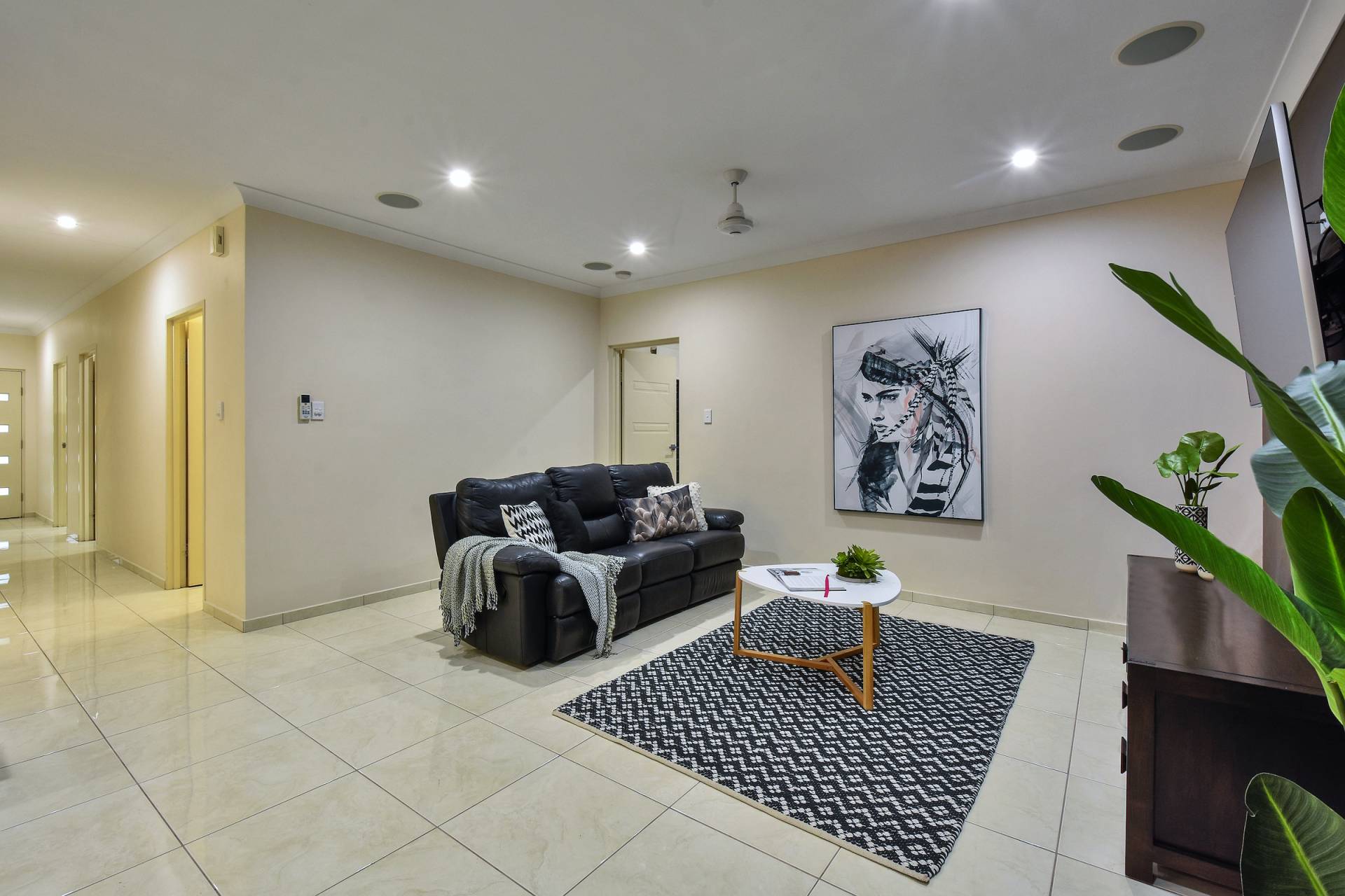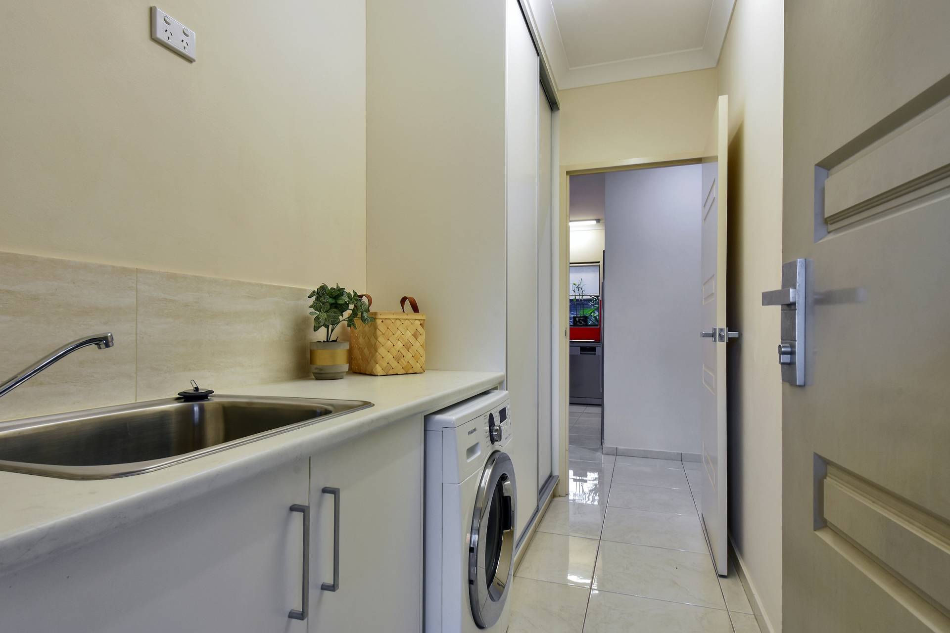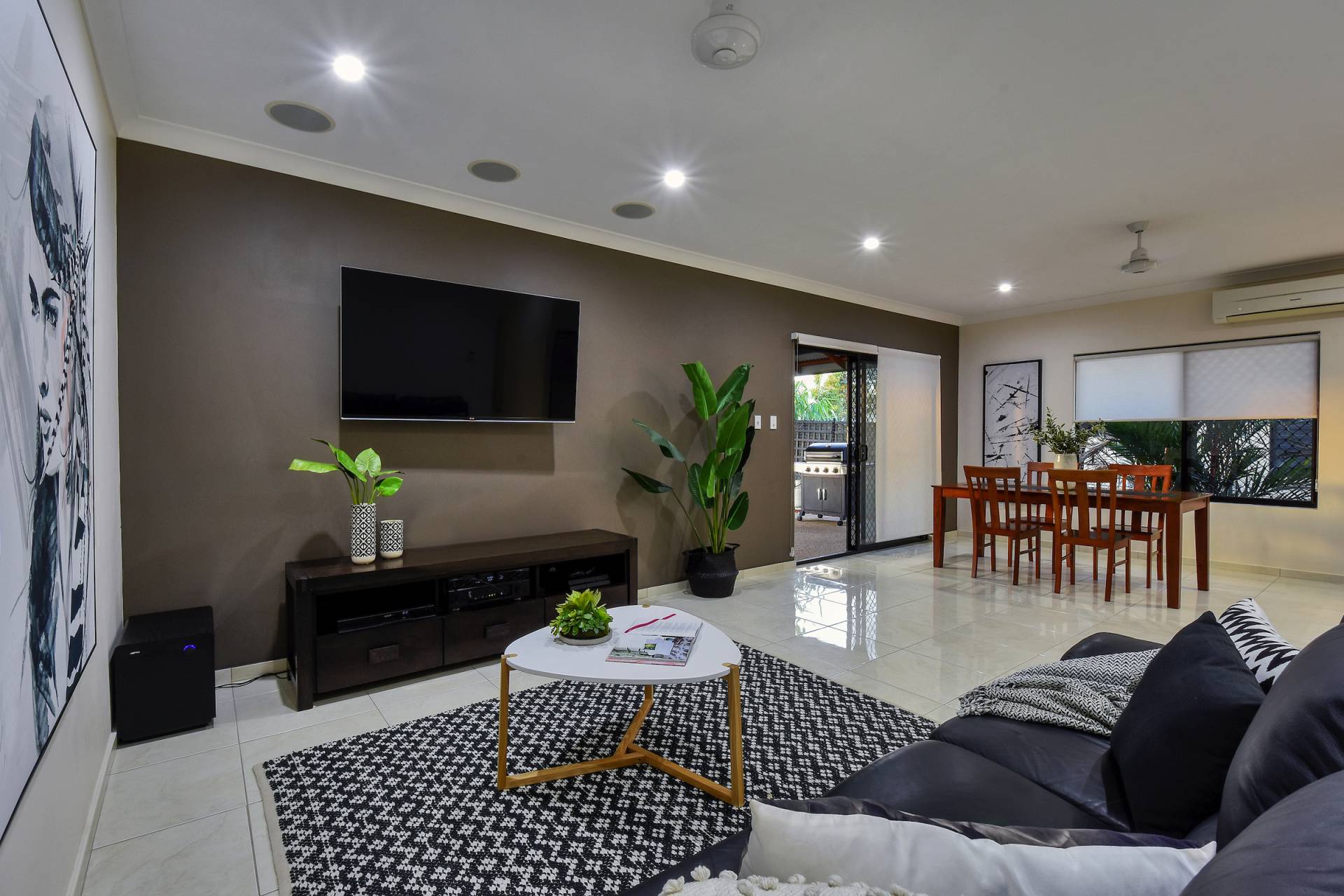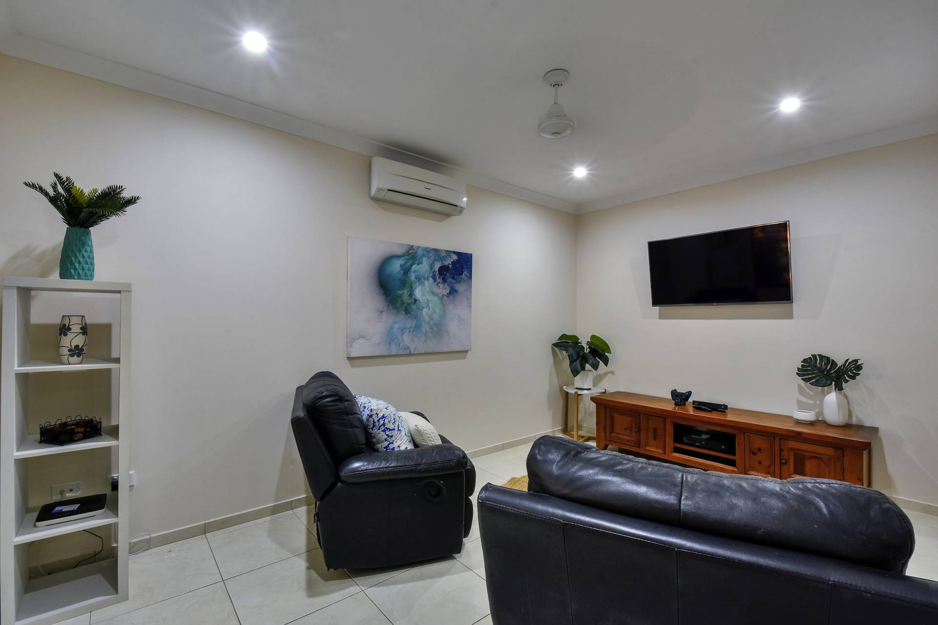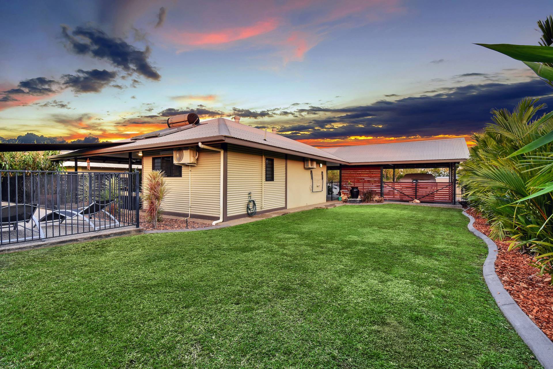The kids and pets can play down the side of the home on rolling green lawn framed with leafy tropical palms that sway in the cool breezes and shield the yard space from the neighbours. A garden sheds with additional covered storage resides along the back boundary and offer plenty of space within.