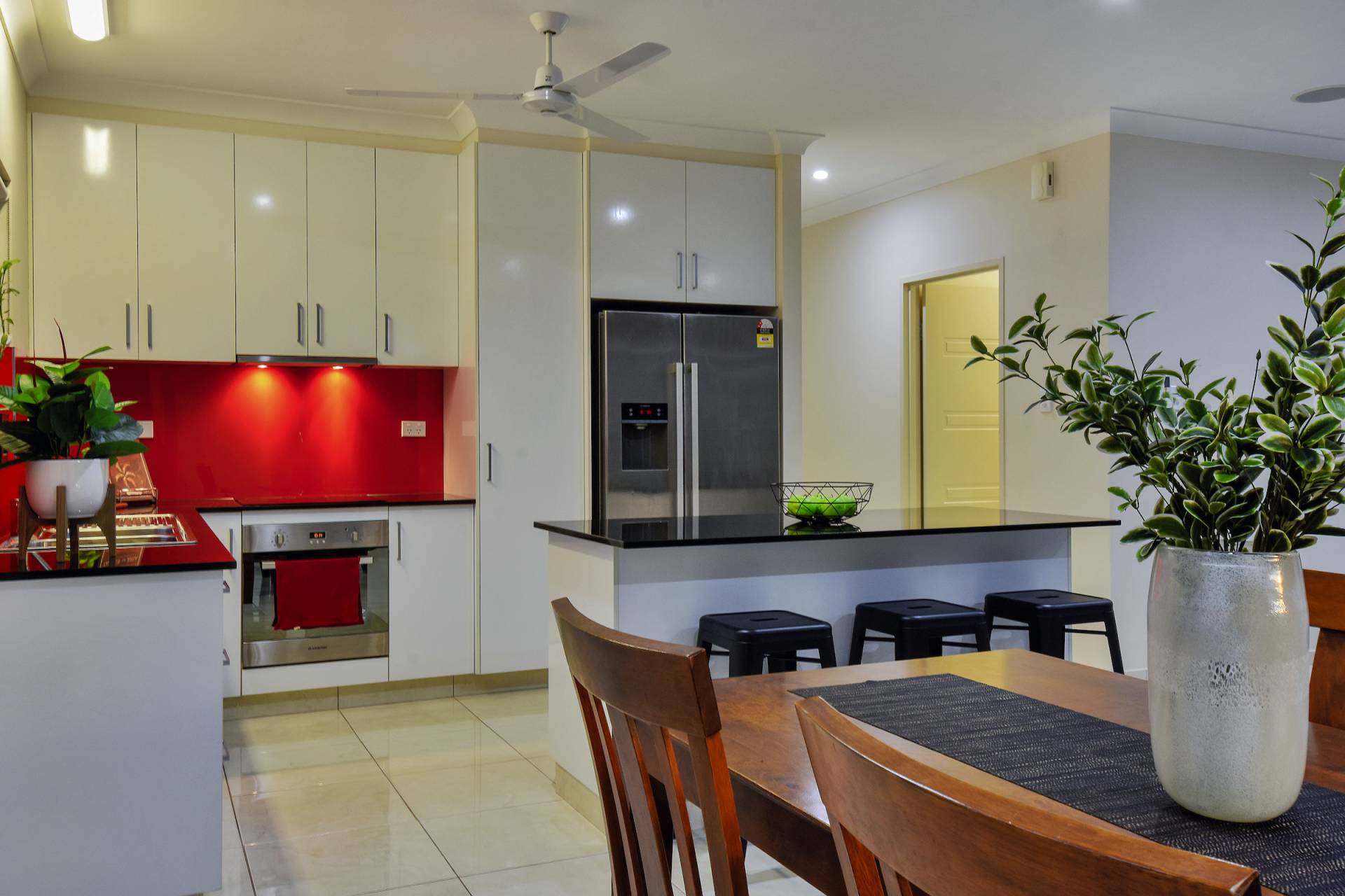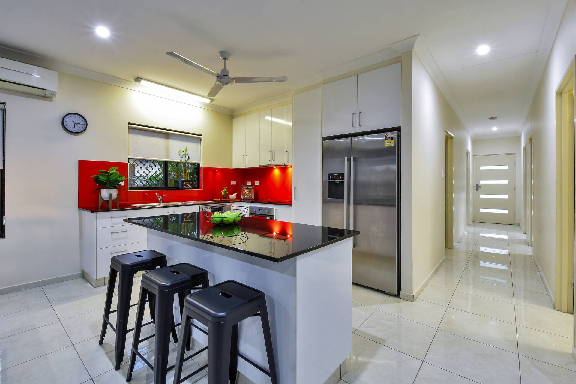The kitchen boasts wrap around counters with overhead storage plus an island prep bench and breakfast bar along with glossy red glass splashbacks for a pop of colour against the black stone toppers.